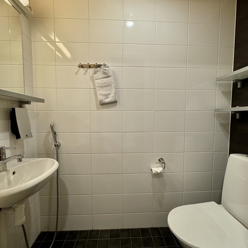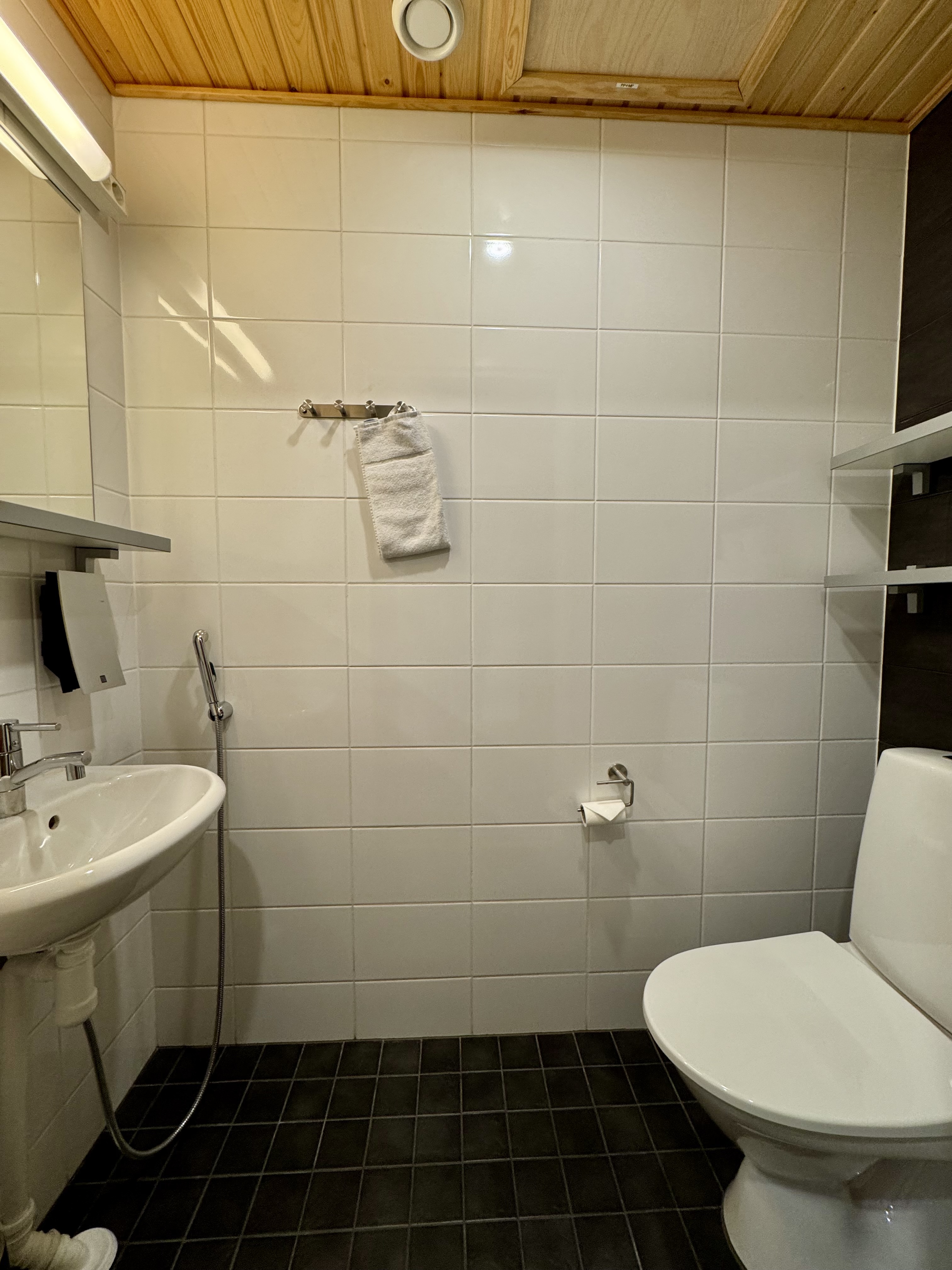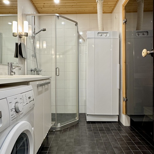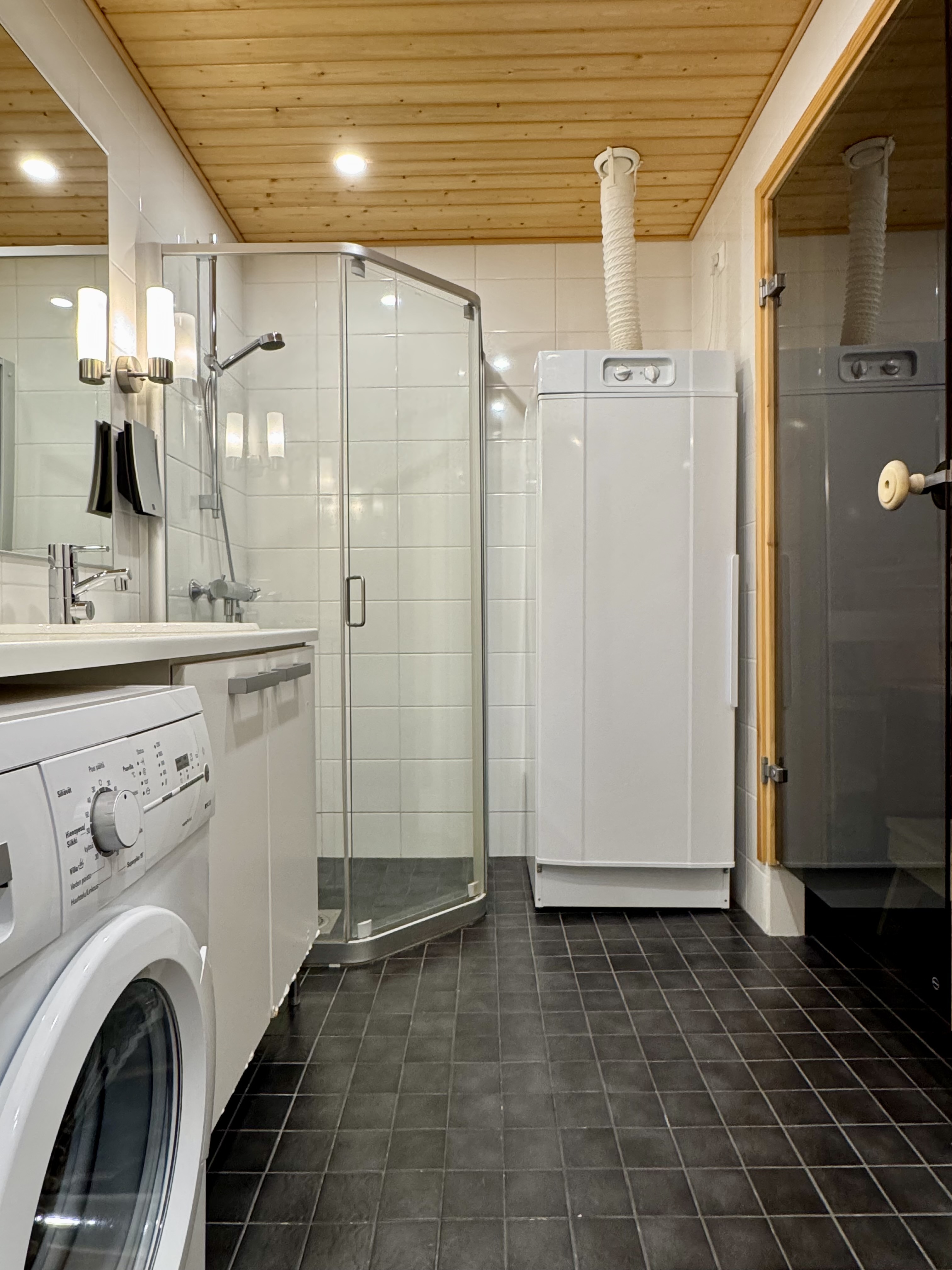 Varusteet: suihkukaappi, pesukone, kuivauskaappi, suihku, peili, kiinteät valaisimet, kylpyhuonekaapisto