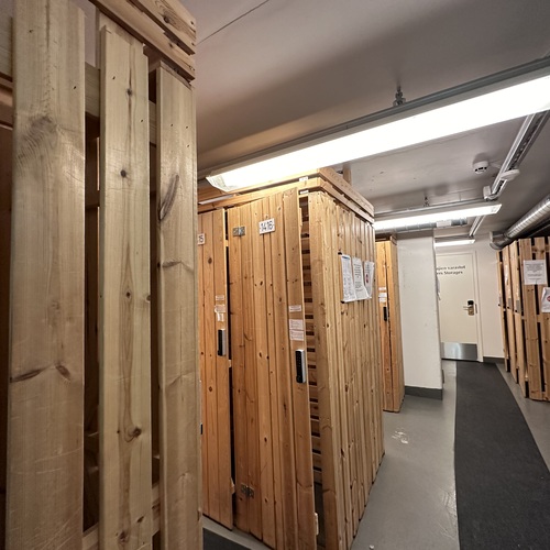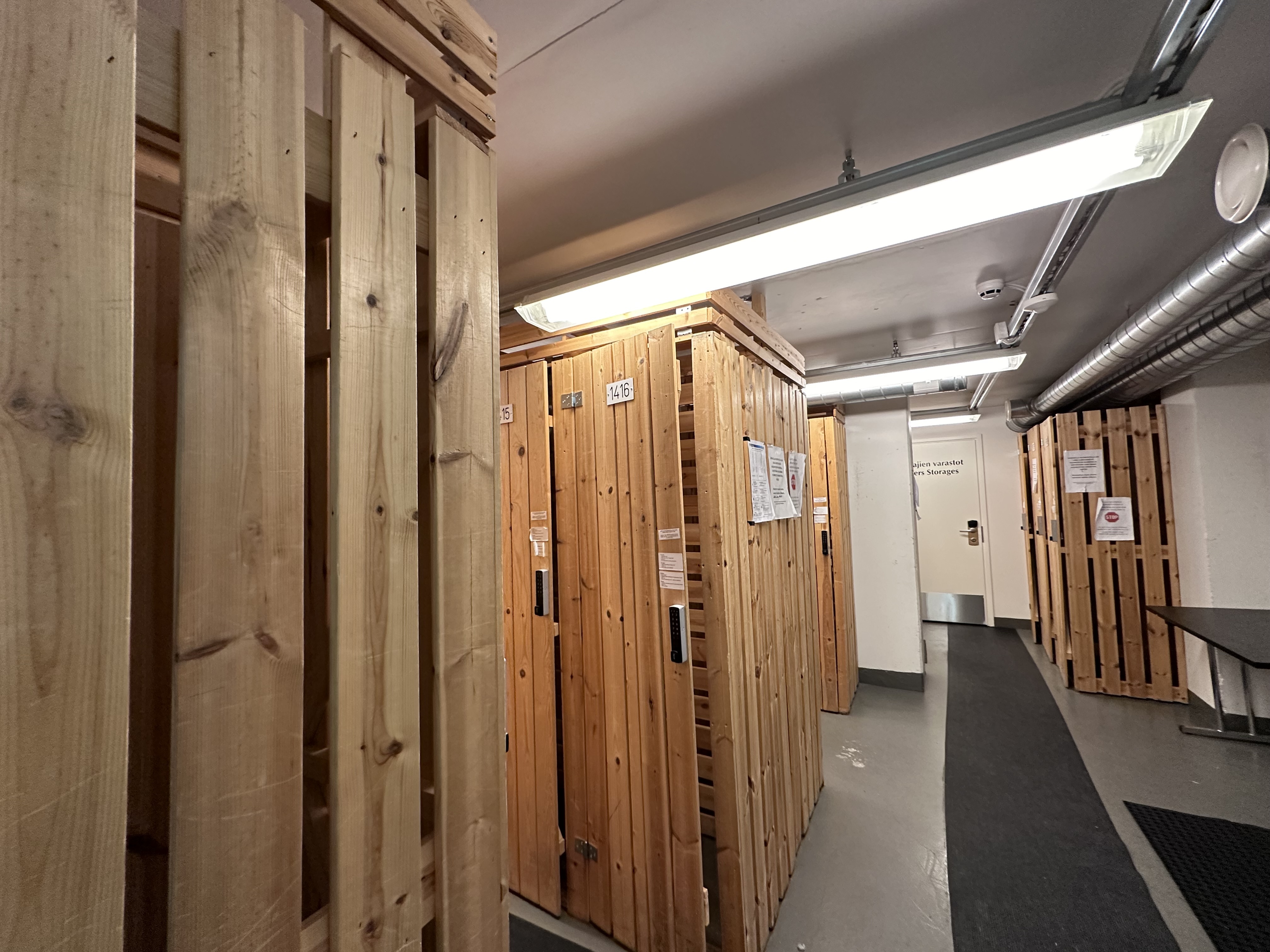 Omistajalla oma lukollinen varasto. Suksivarastot ja suksienhoitotila alakerrassa.