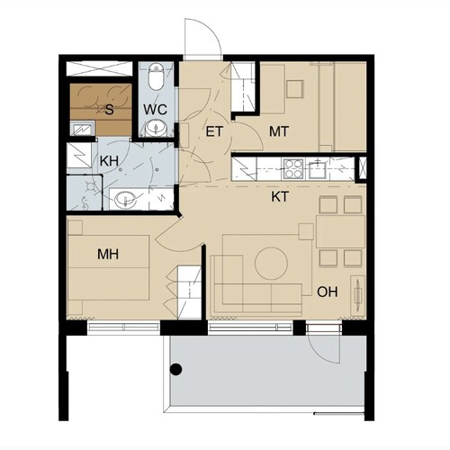 Nukkumapaikat 4-5 henkilölle, hyvin varusteltu olohuone-keittiönurkkaus sekä kylpyhuone ja sauna.