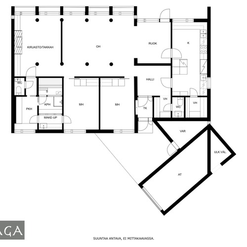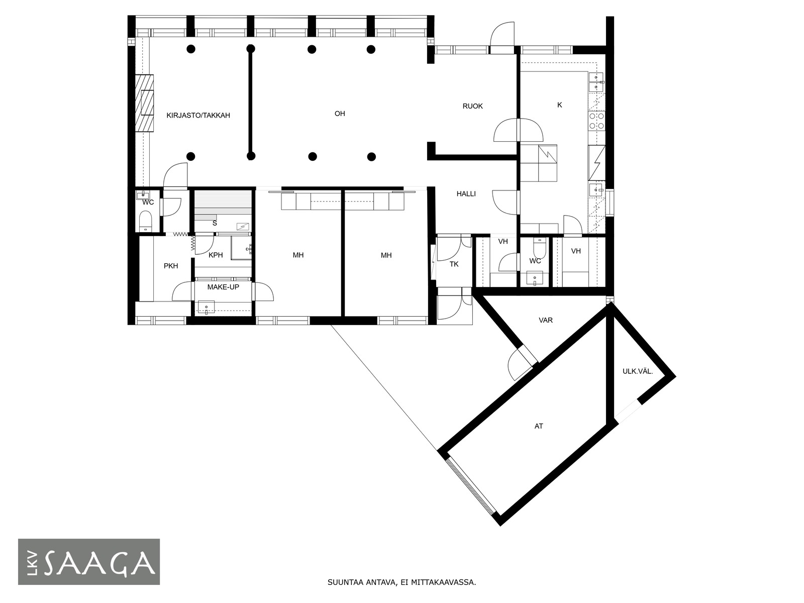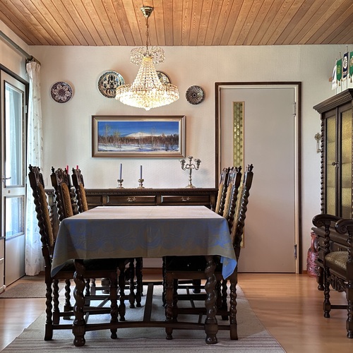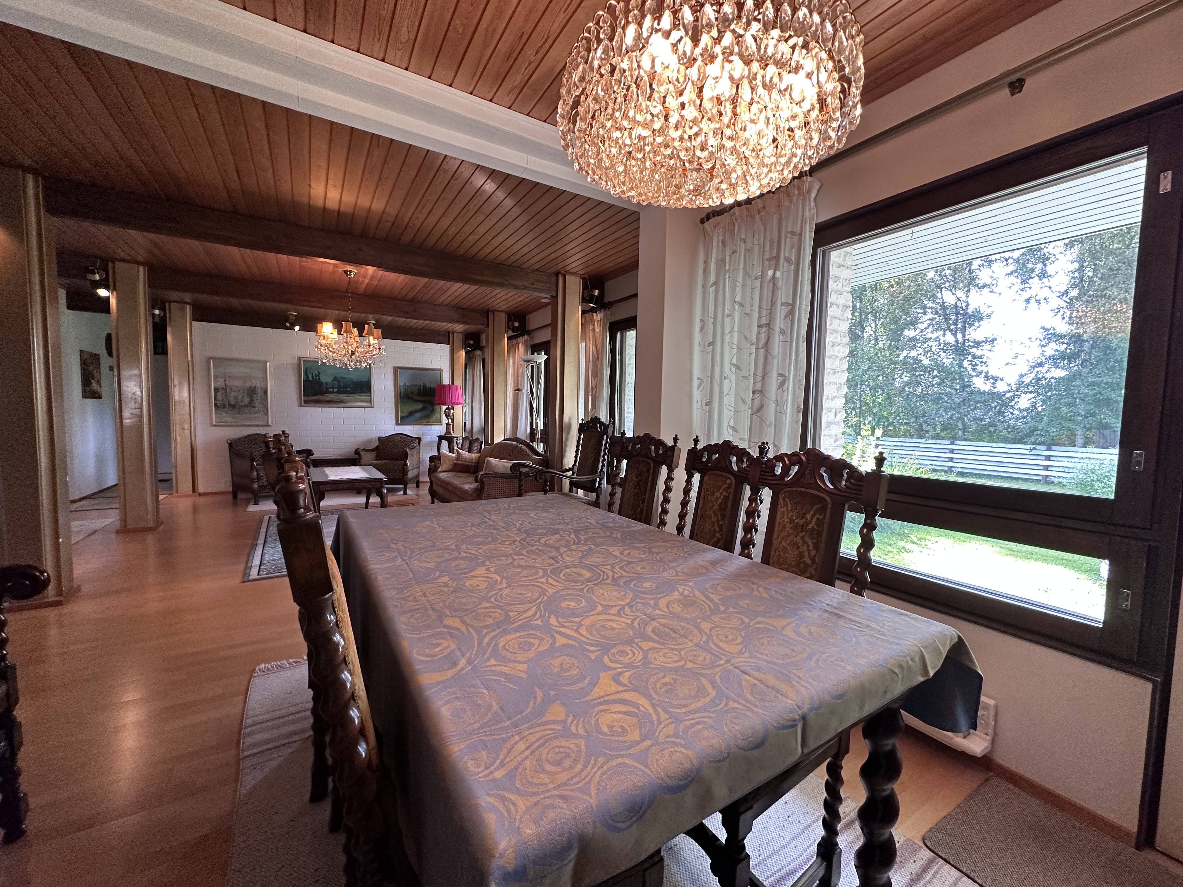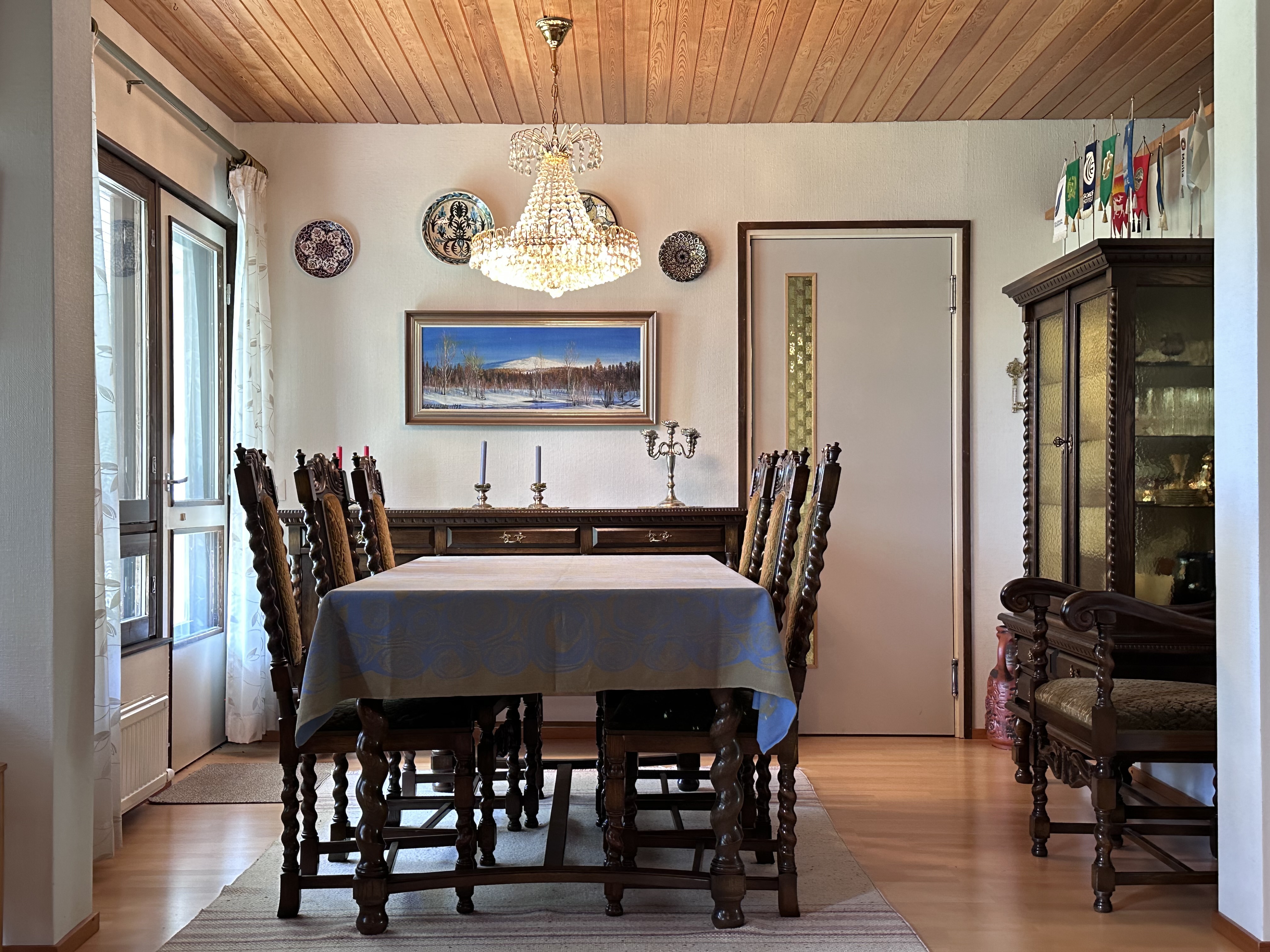 Ruokailutila, eteinen, tuulikaappi, kirjasto, pukuhuone