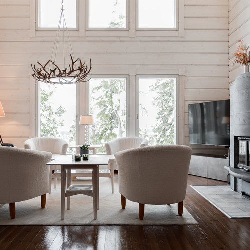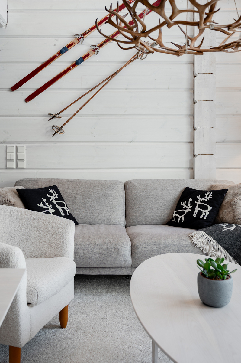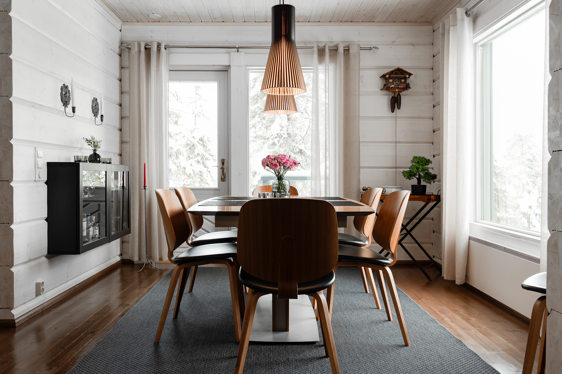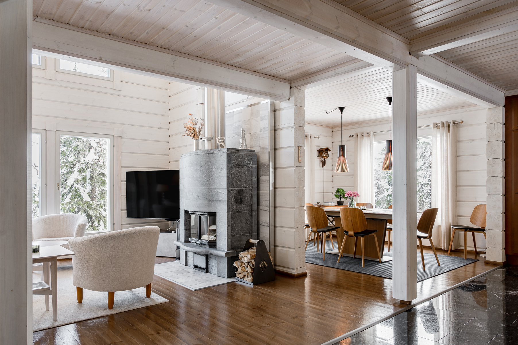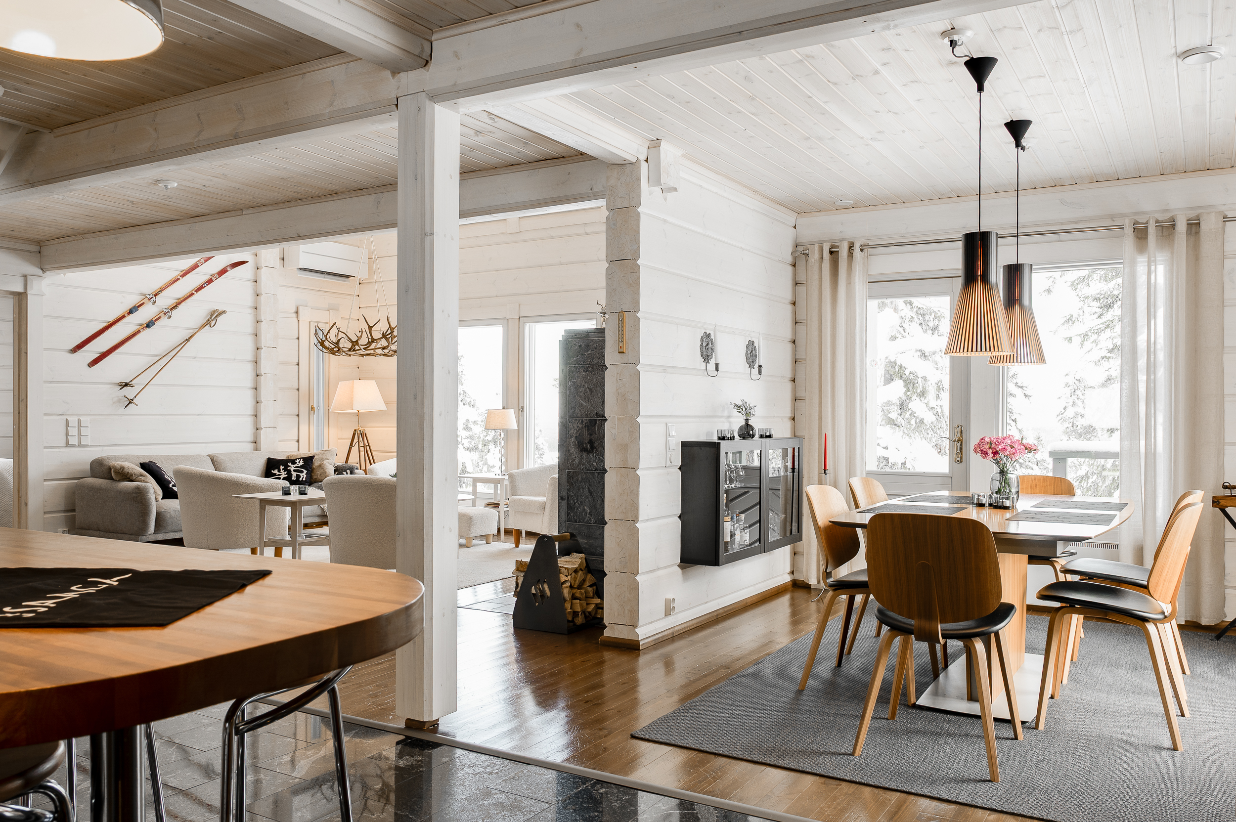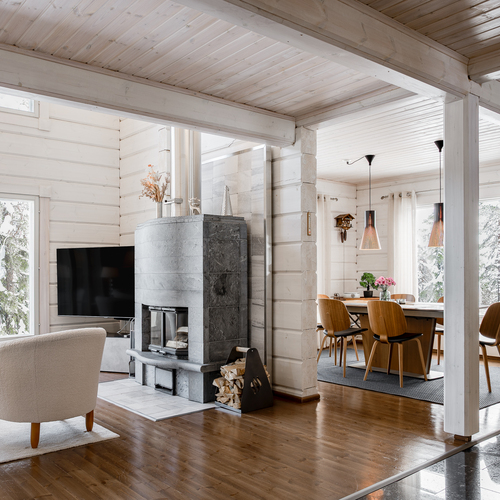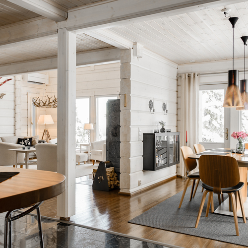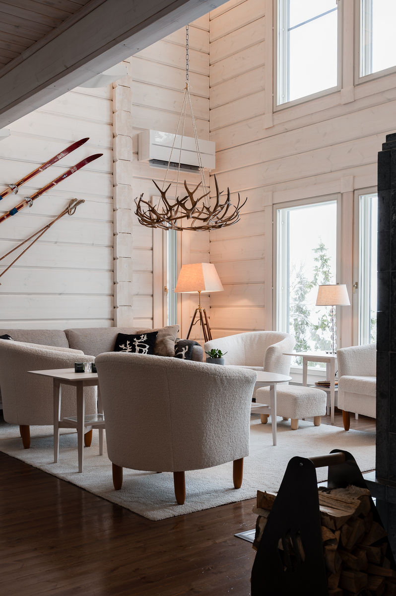 Sisustus on tyylikäs yhdistelmä vaaleaksi vahattua hirsipintaa ja tummia mausteisia sävyjä.