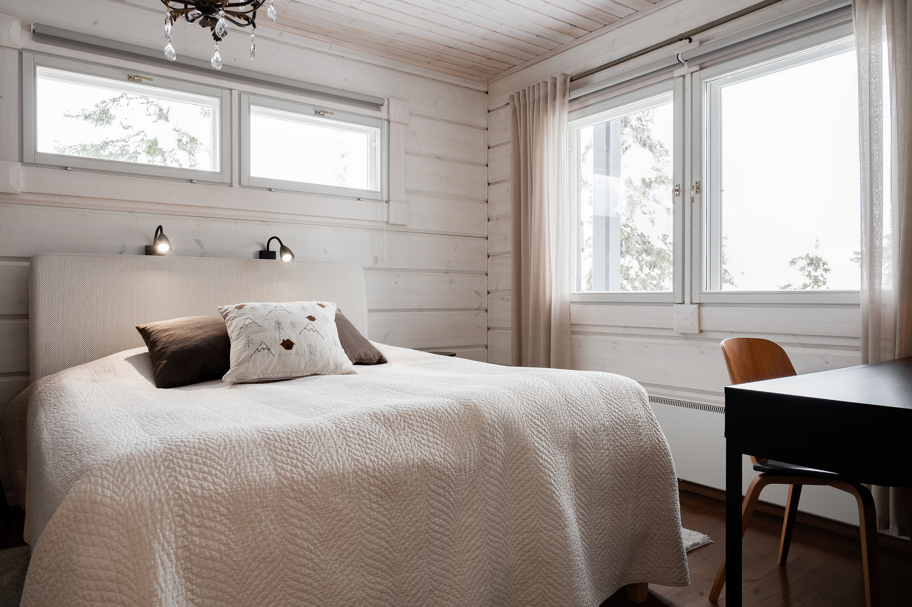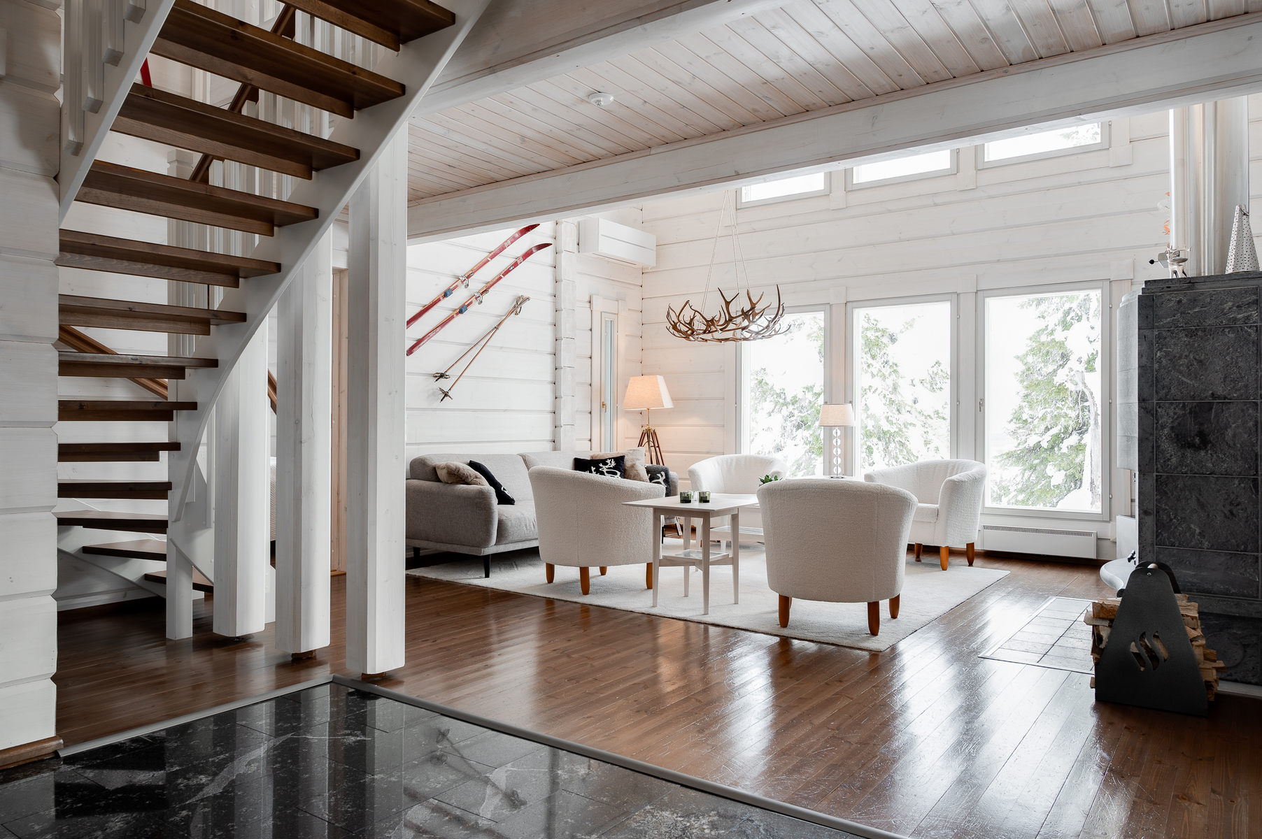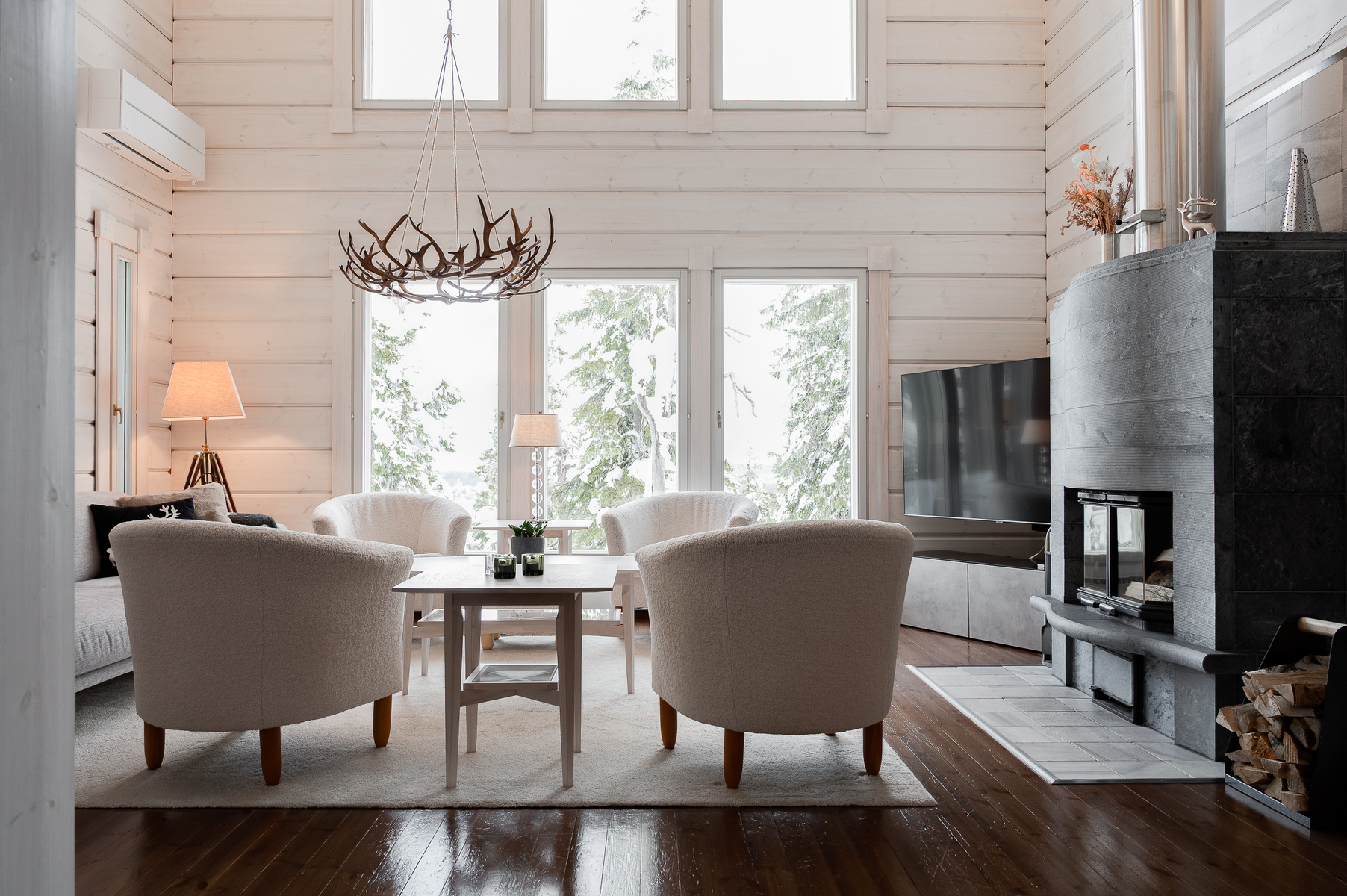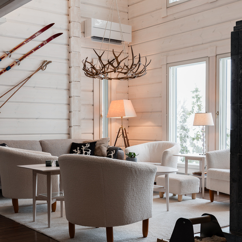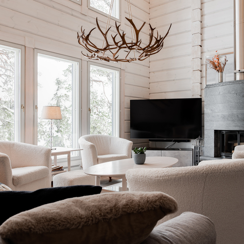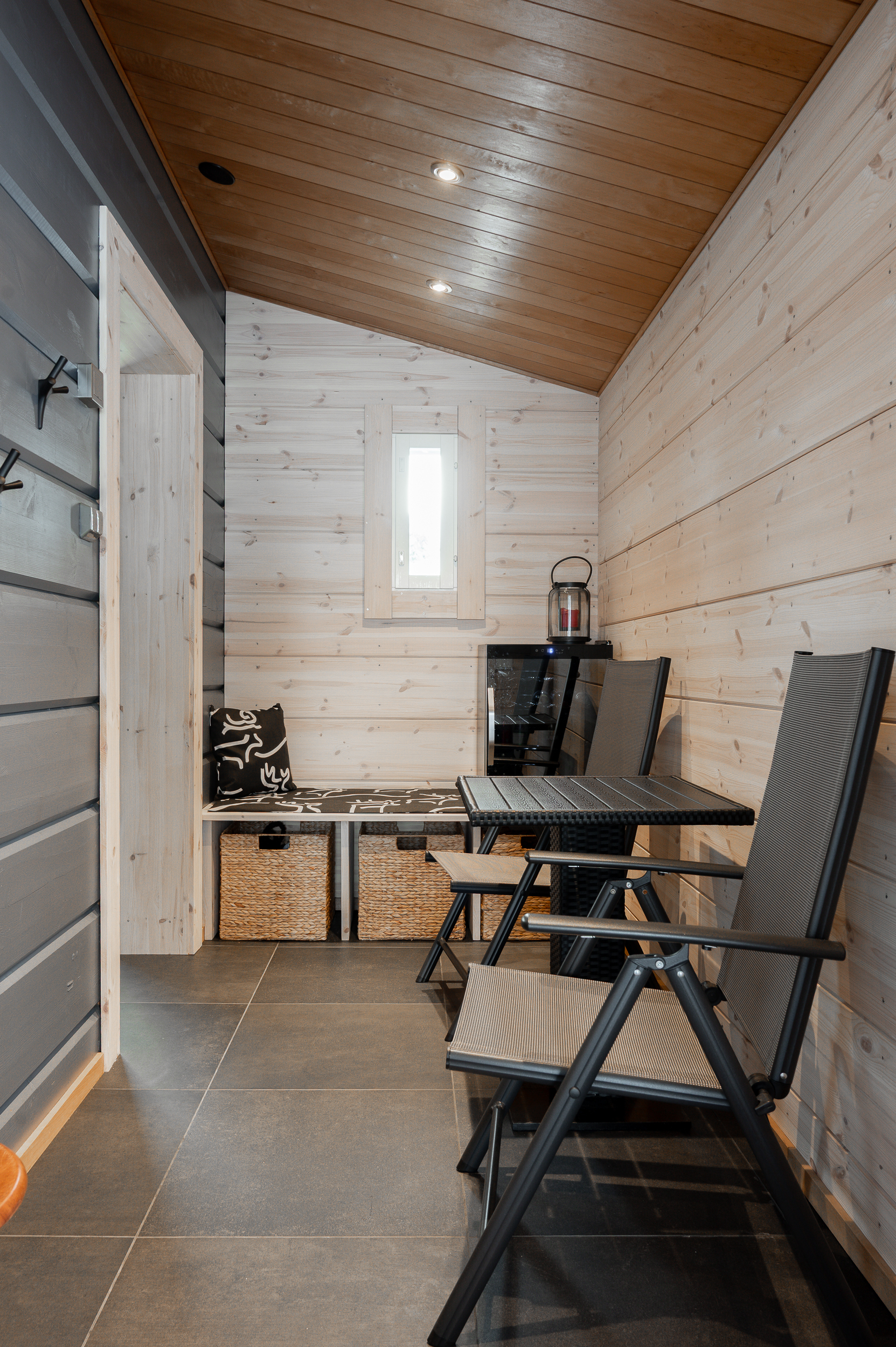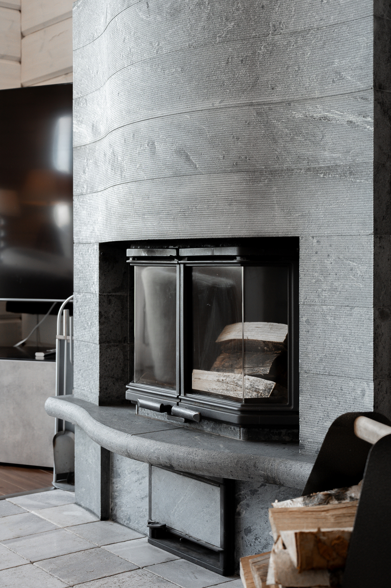 Sisustus on tyylikäs yhdistelmä vaaleaksi vahattua hirsipintaa ja tummia mausteisia sävyjä.