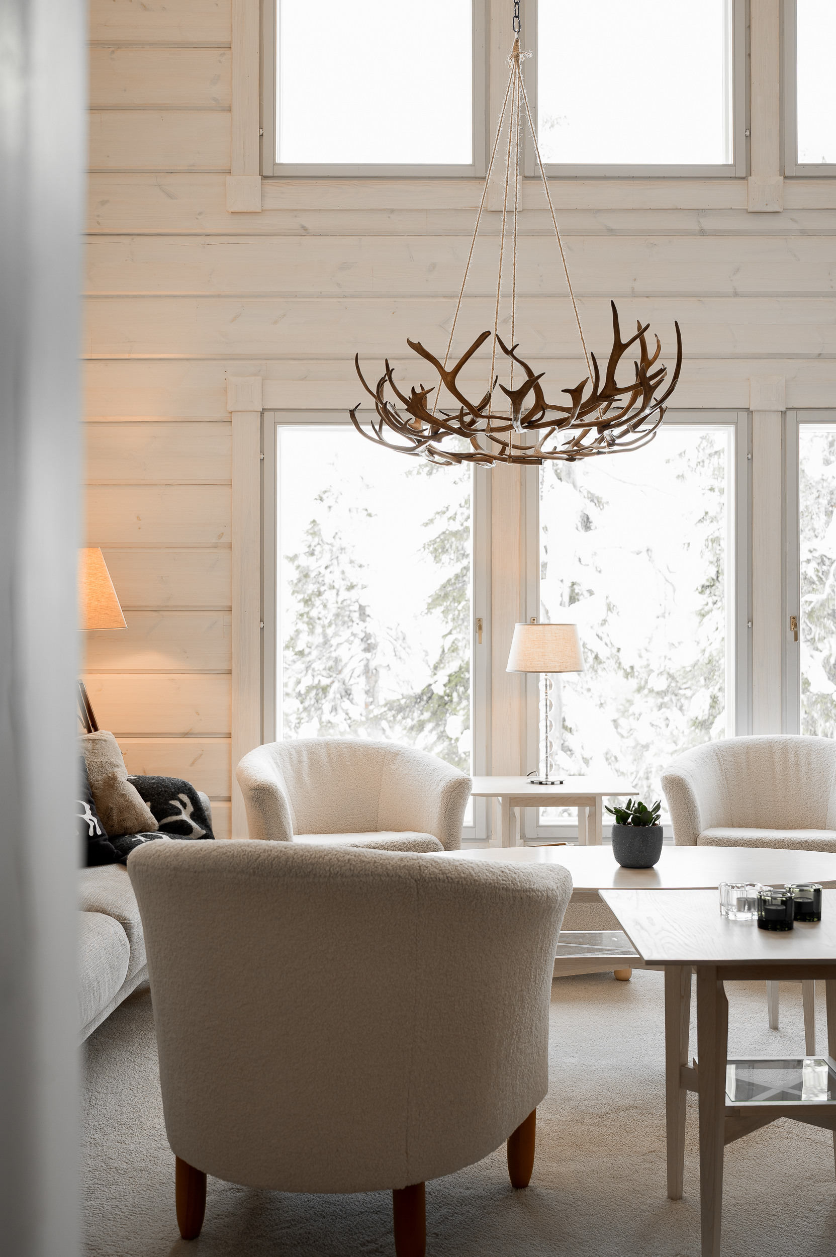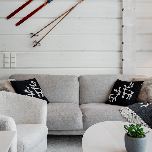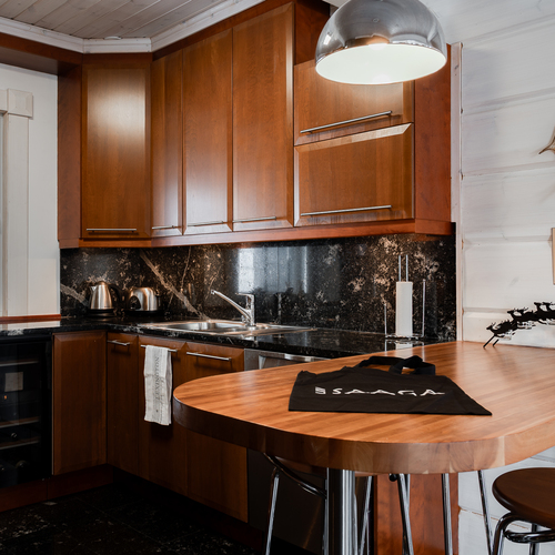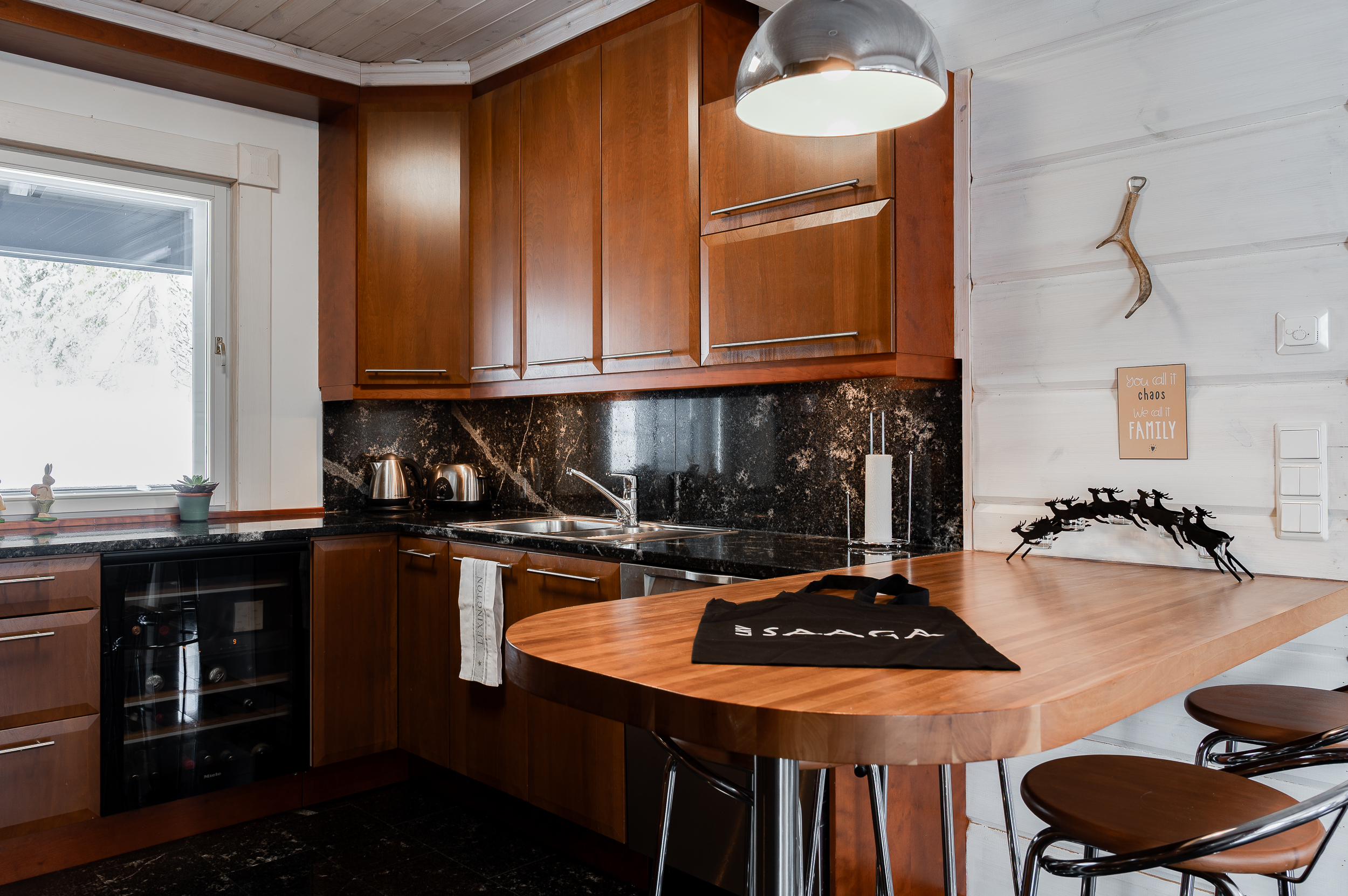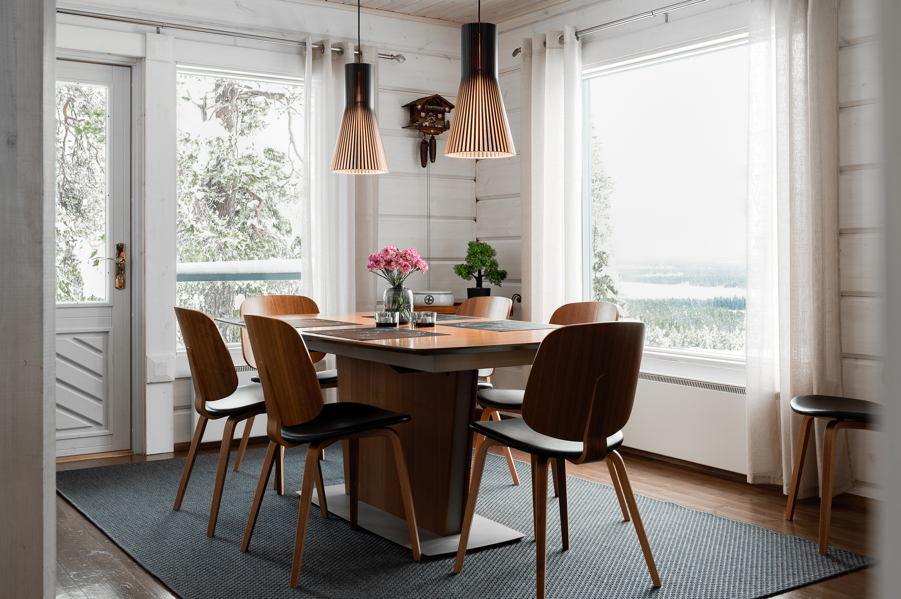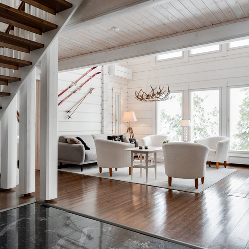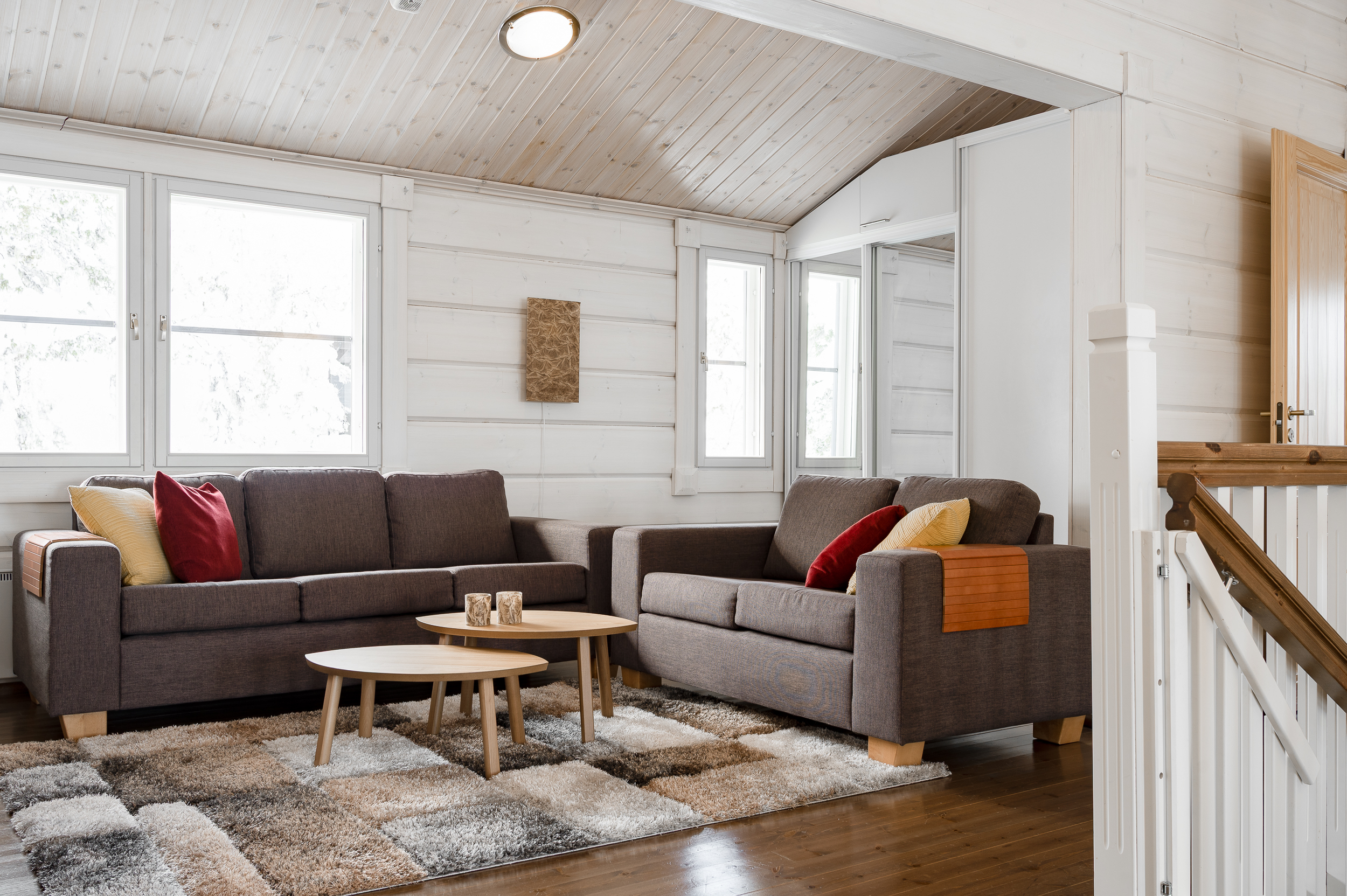 Sisustus on tyylikäs yhdistelmä vaaleaksi vahattua hirsipintaa ja tummia mausteisia sävyjä.