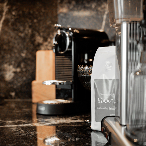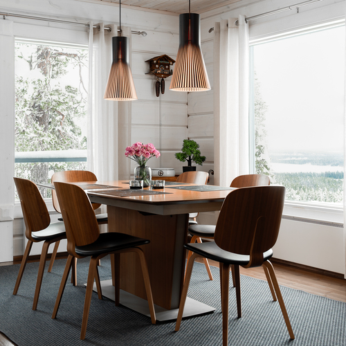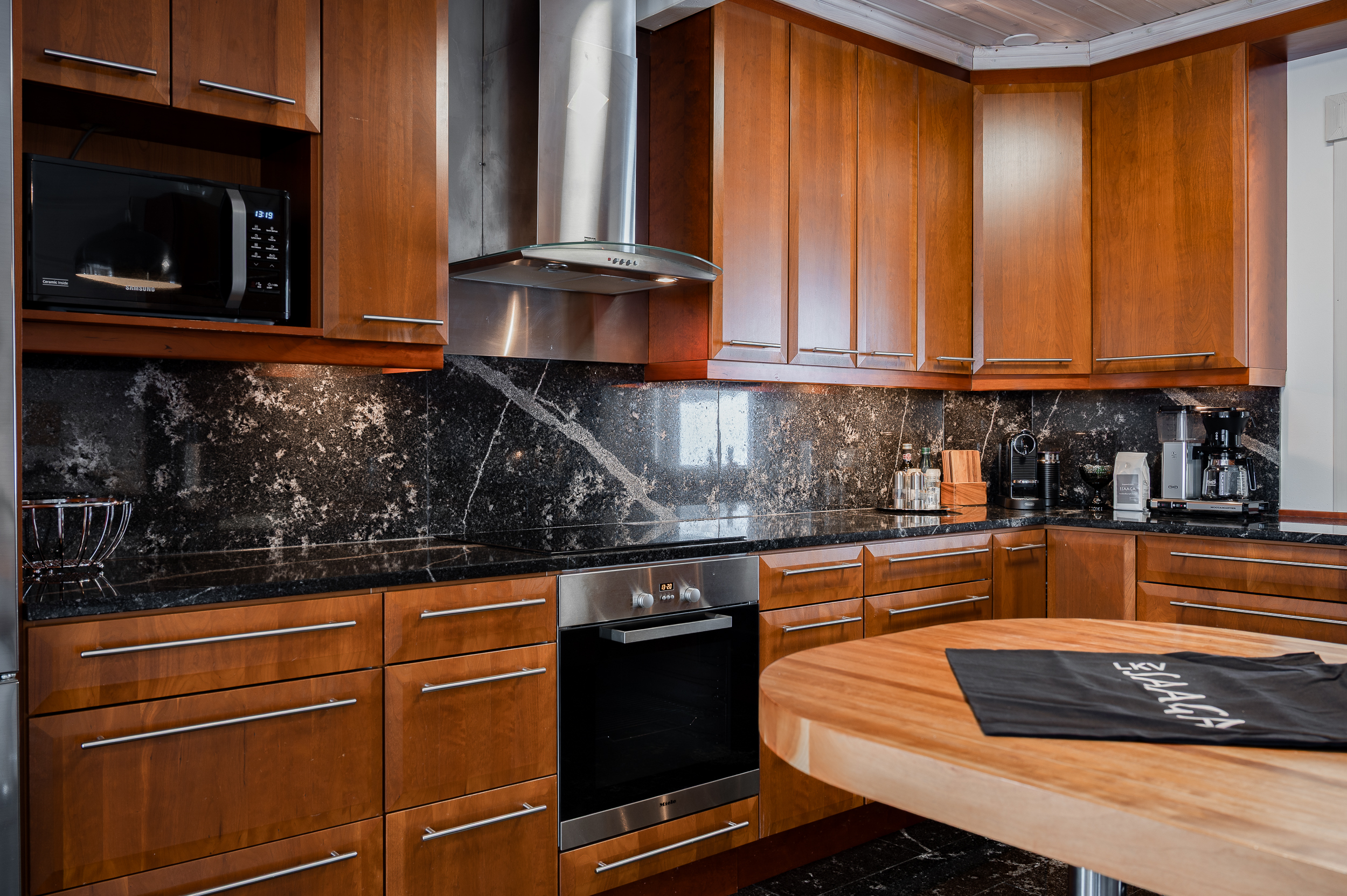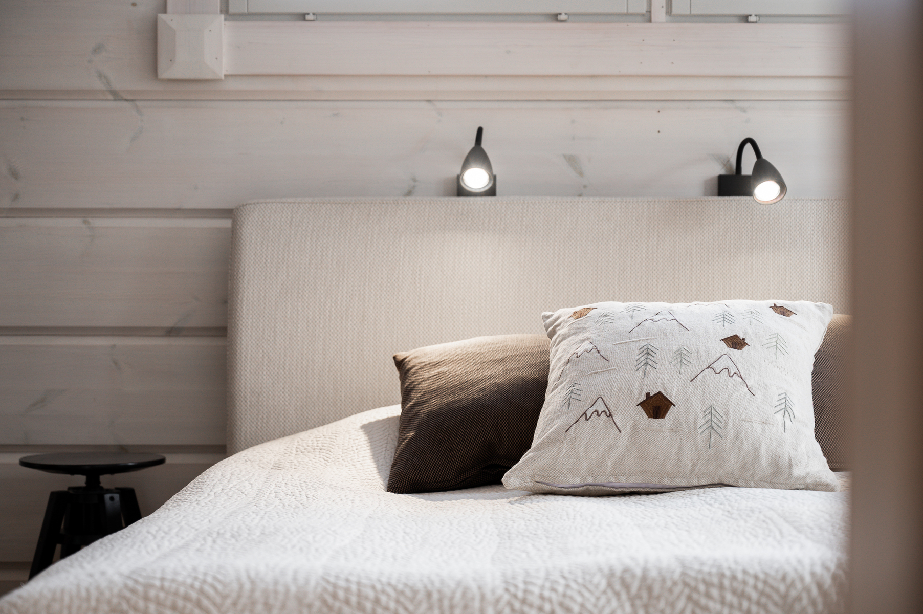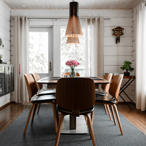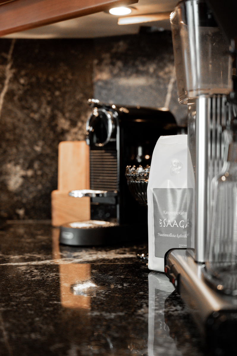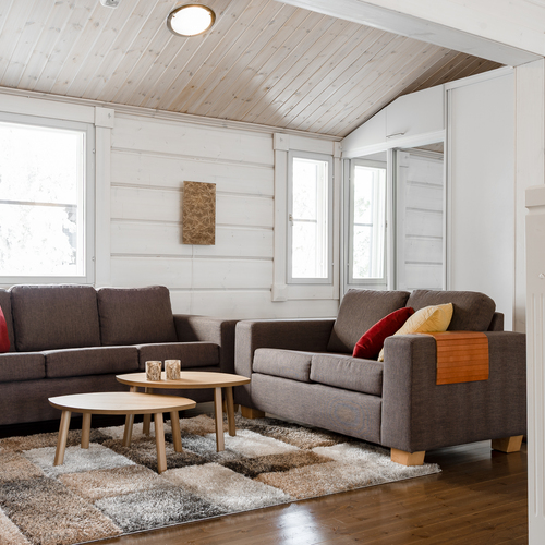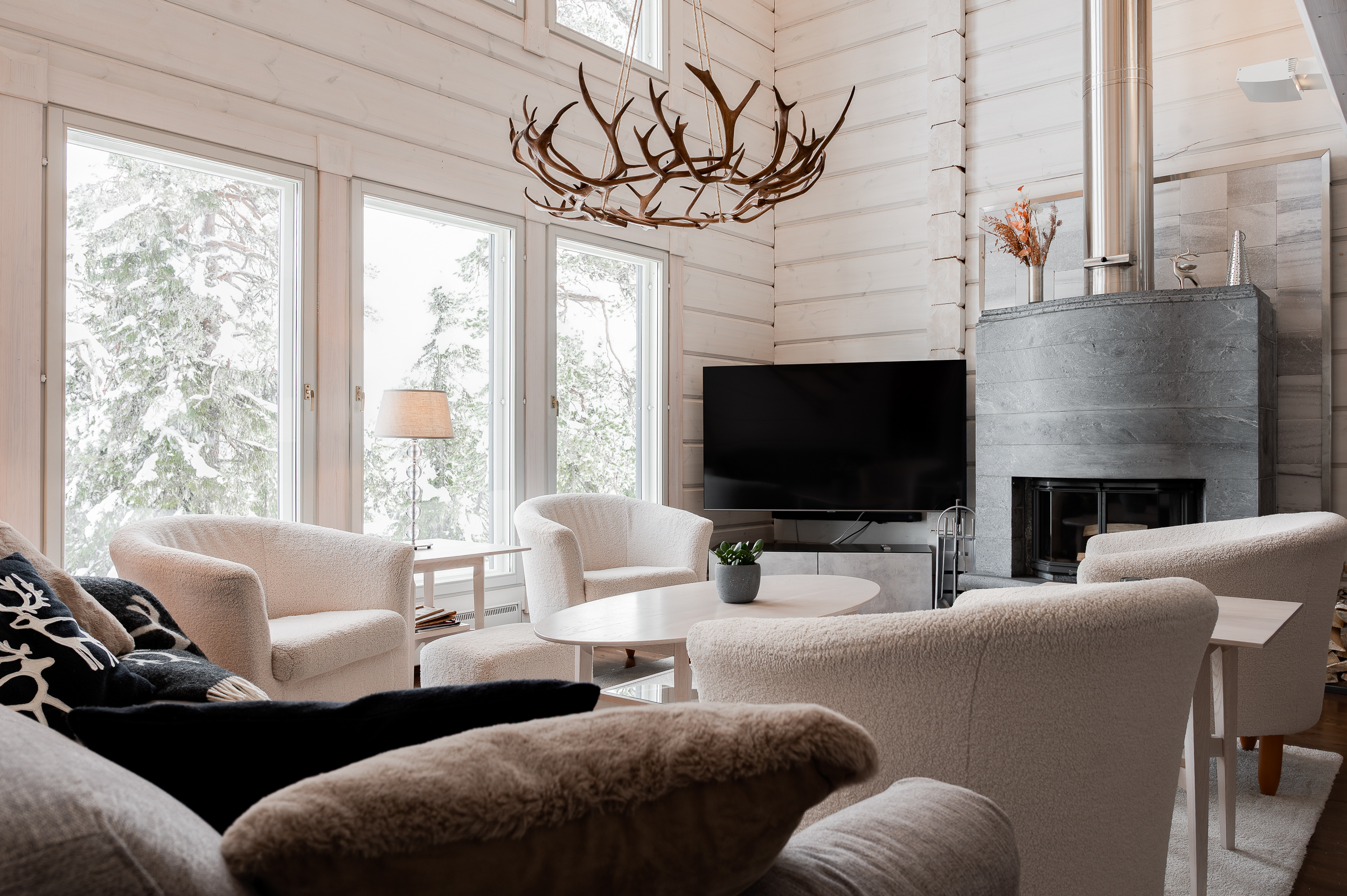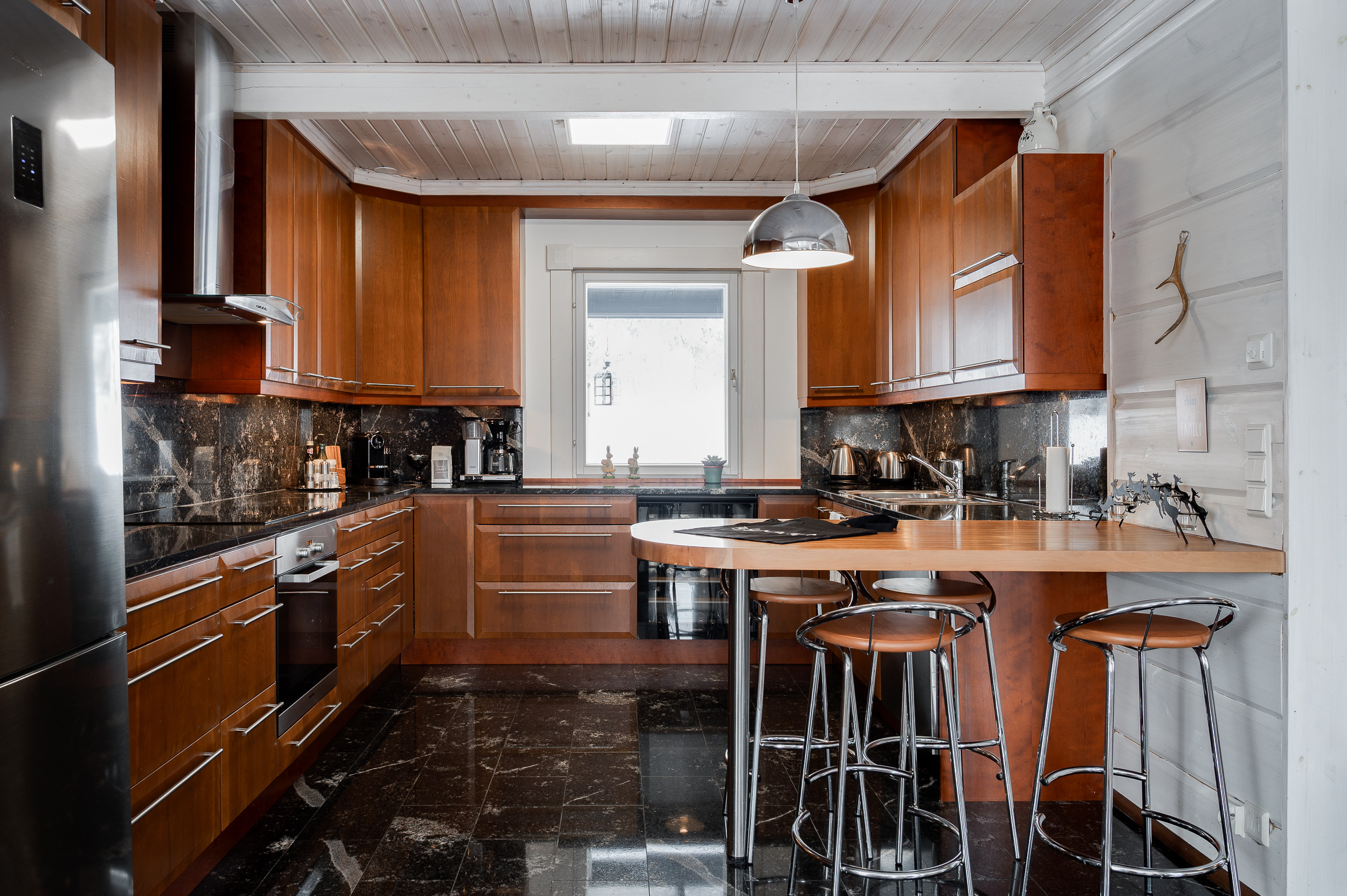 Sisustus on tyylikäs yhdistelmä vaaleaksi vahattua hirsipintaa ja tummia mausteisia sävyjä.