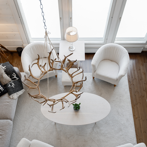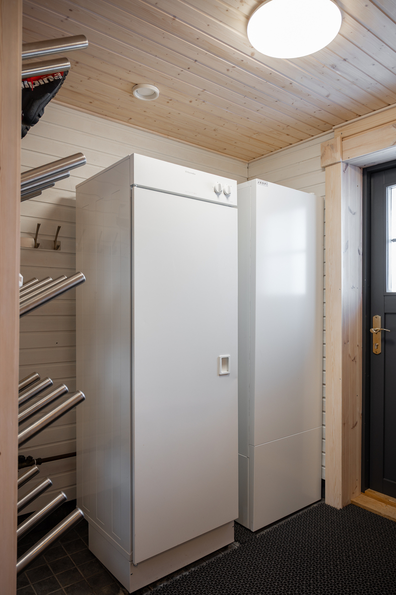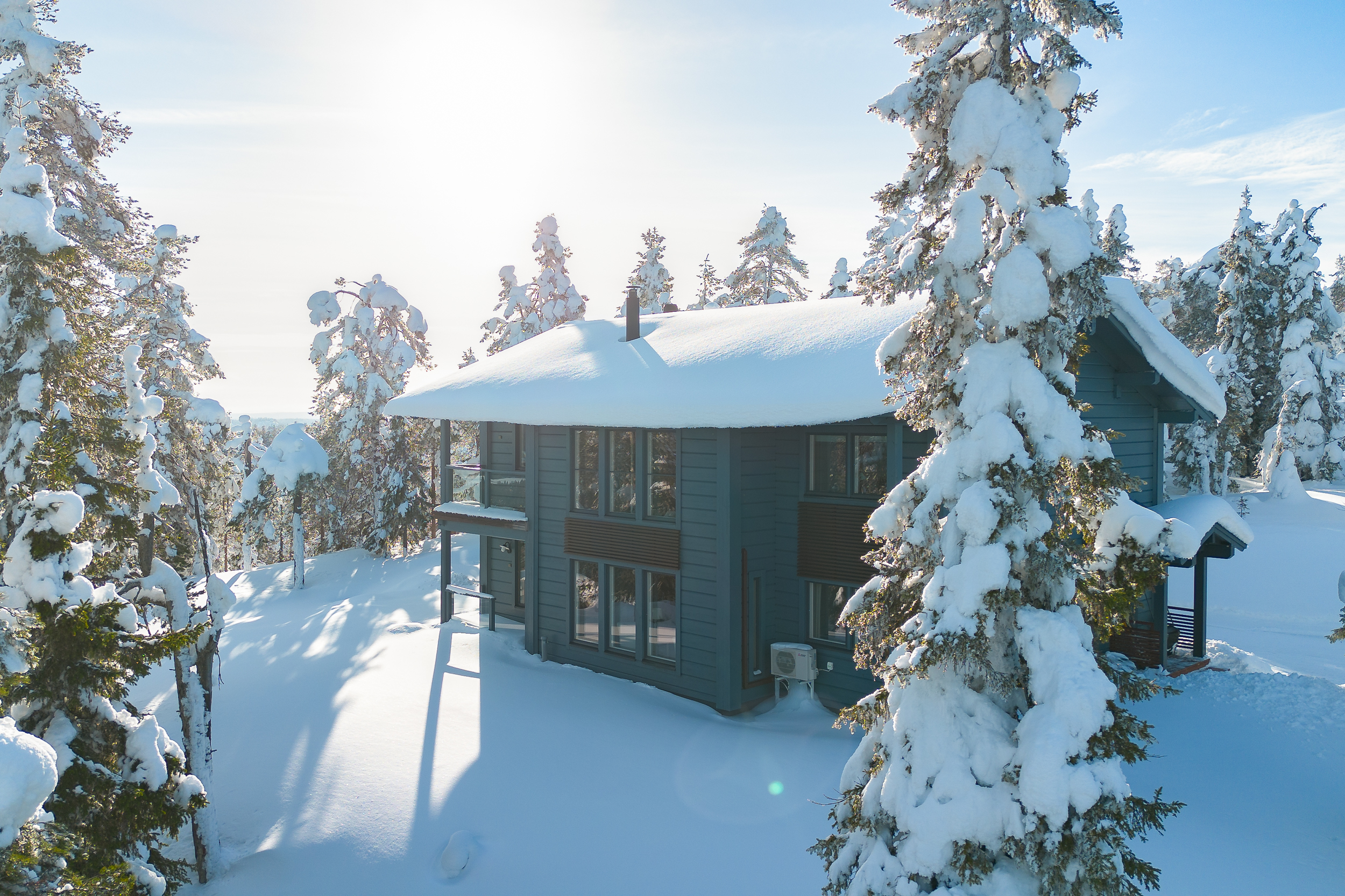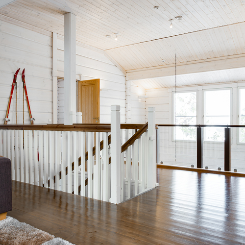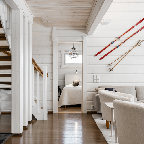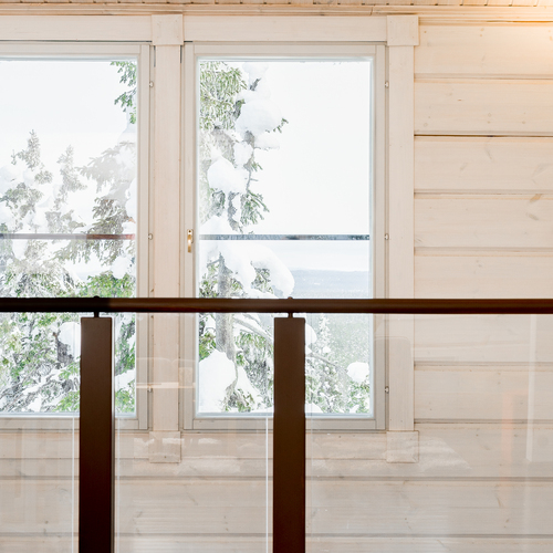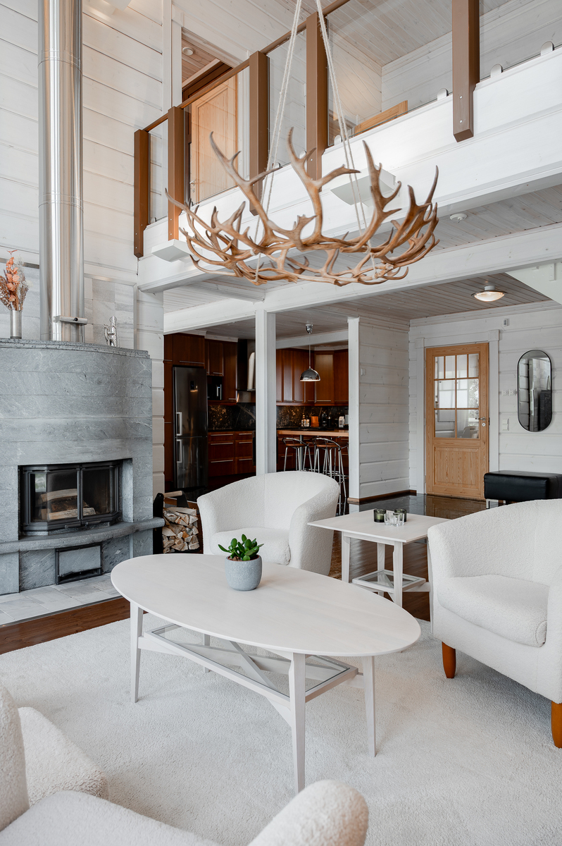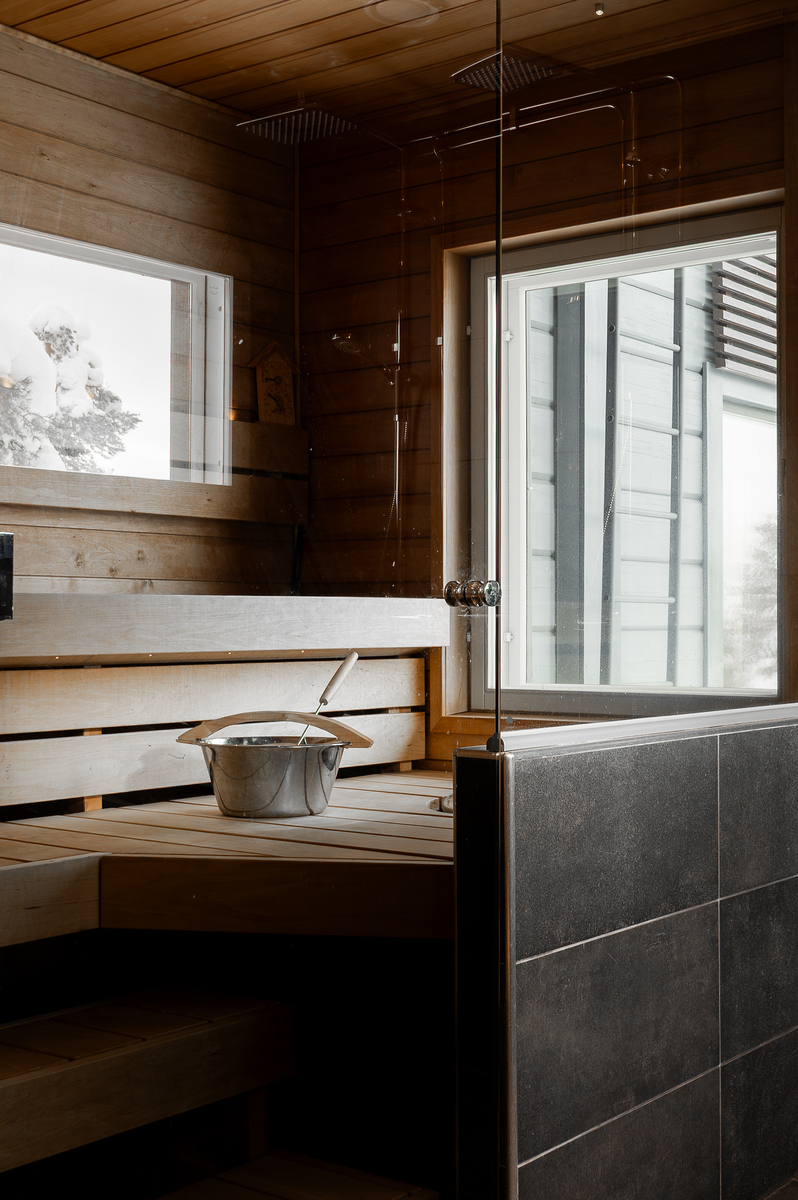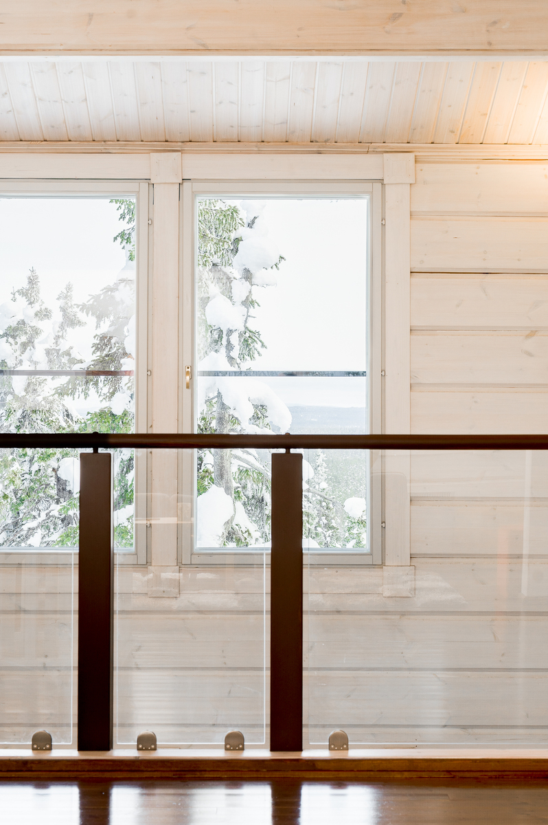 Tuulikaapissa liukuovikaapistot. Yläkerrassa avara aulatila, josta upeat näkymät tunturimaisemiin. Iso vaatehuonetila.