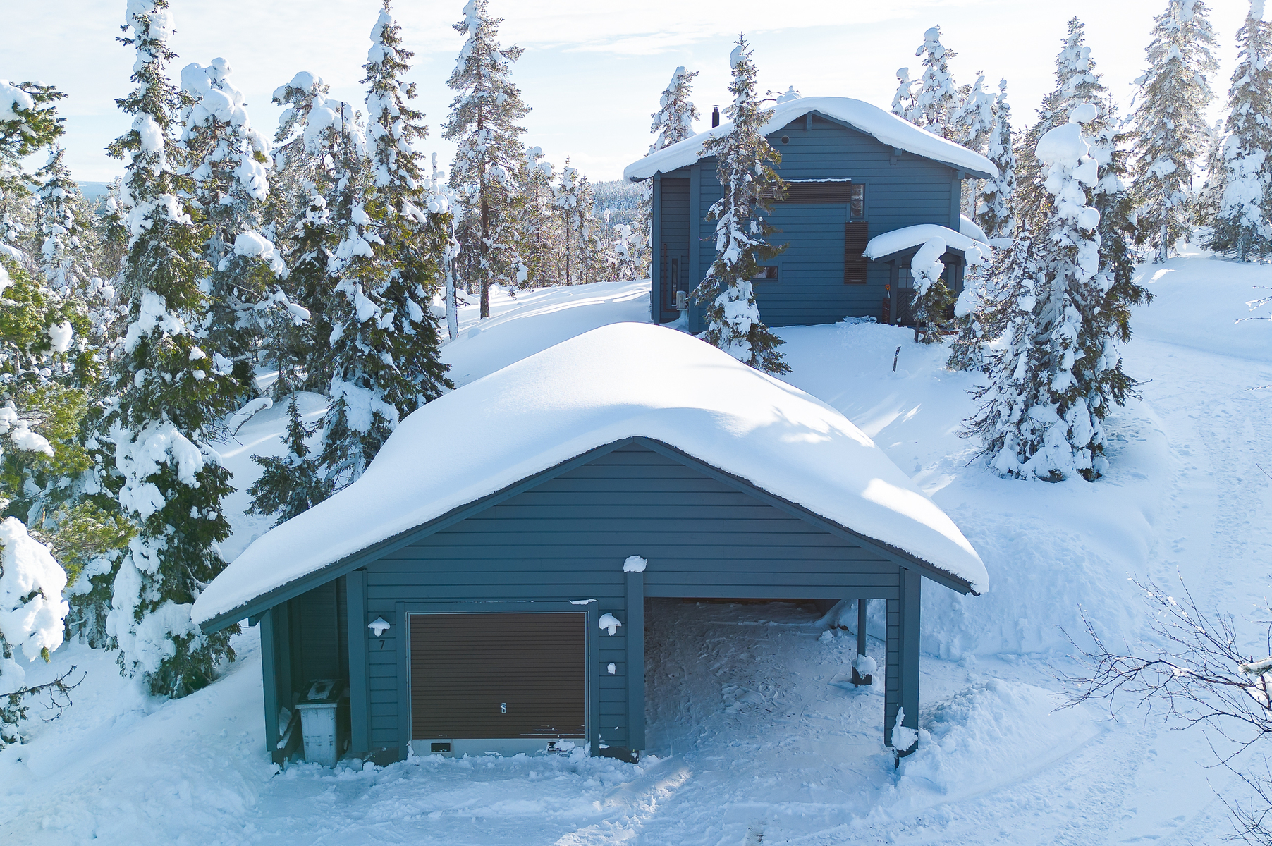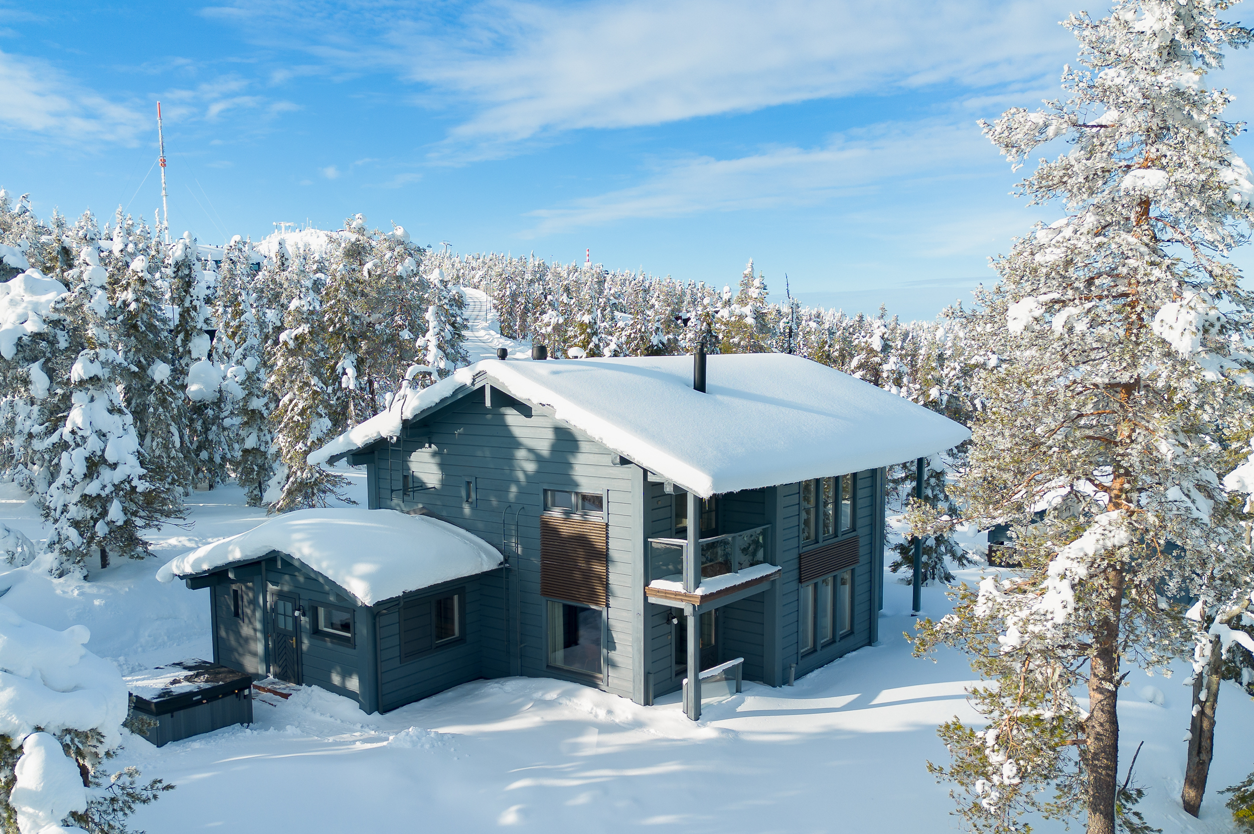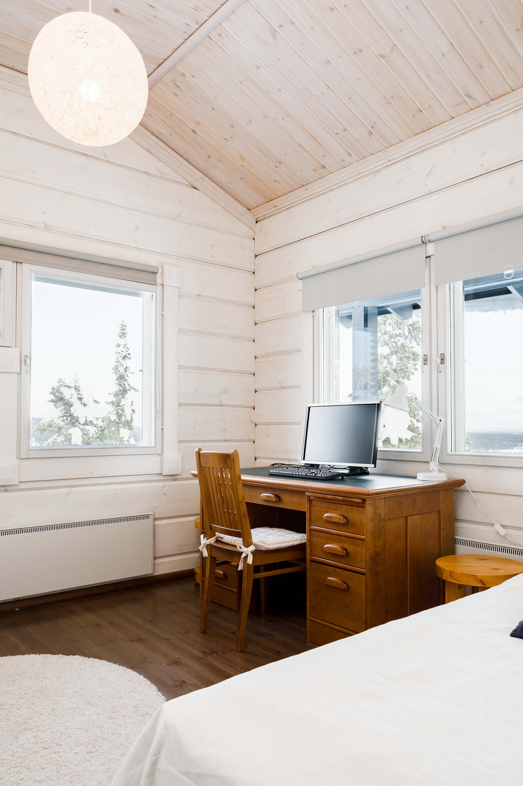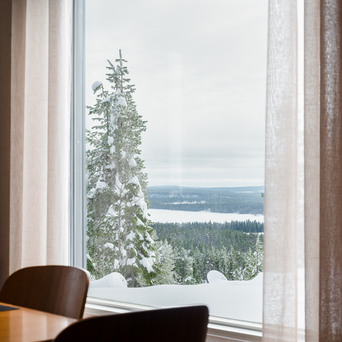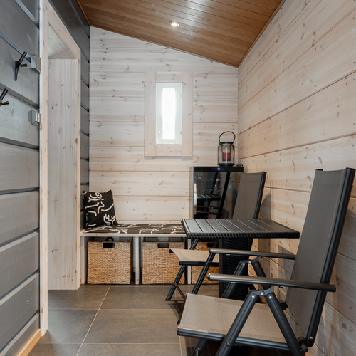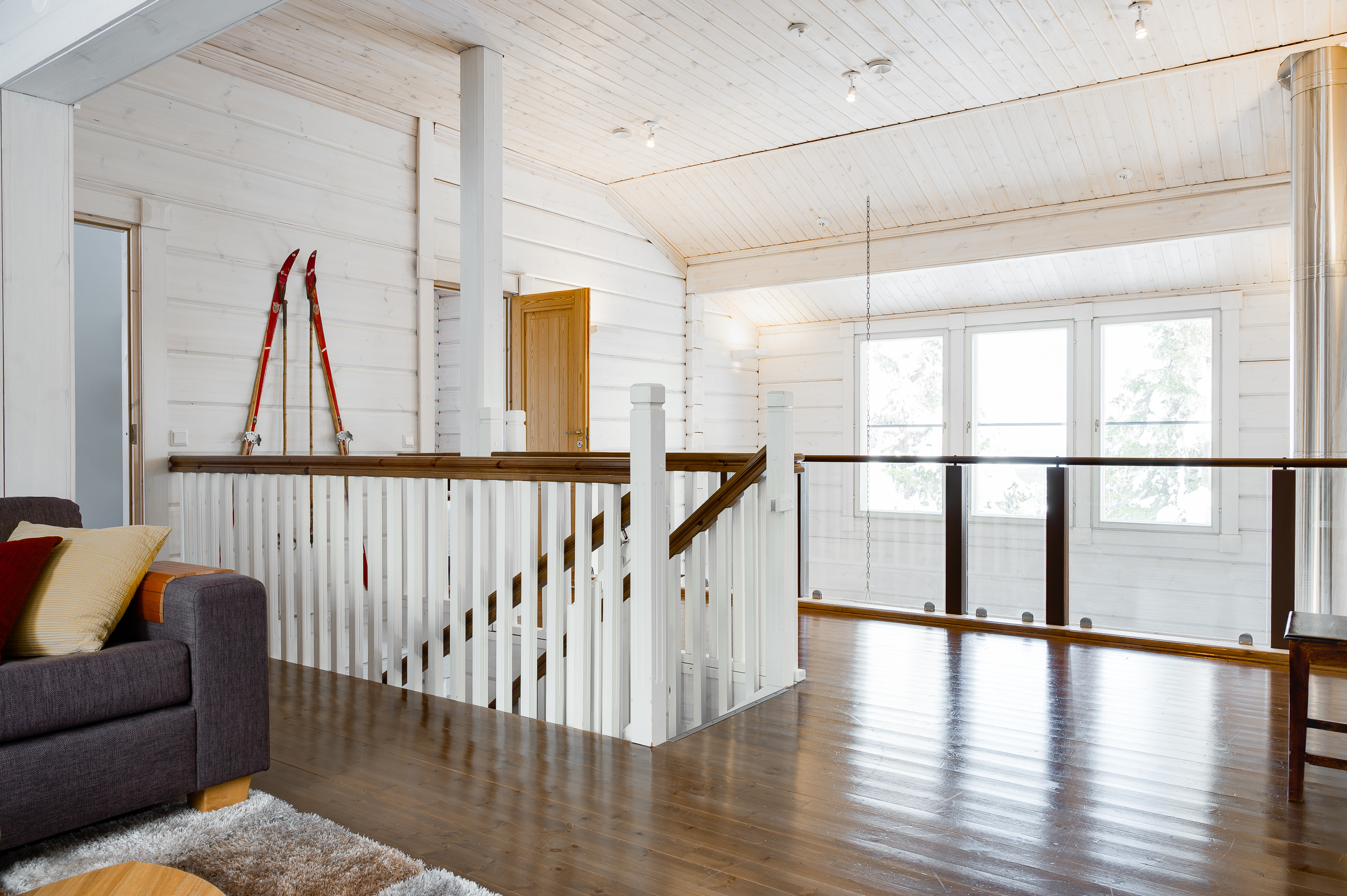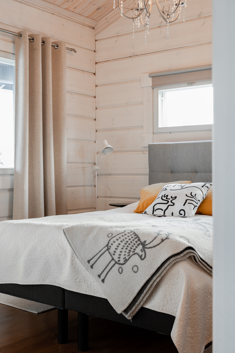 Tuulikaapissa liukuovikaapistot. Yläkerrassa avara aulatila, josta upeat näkymät tunturimaisemiin. Iso vaatehuonetila.