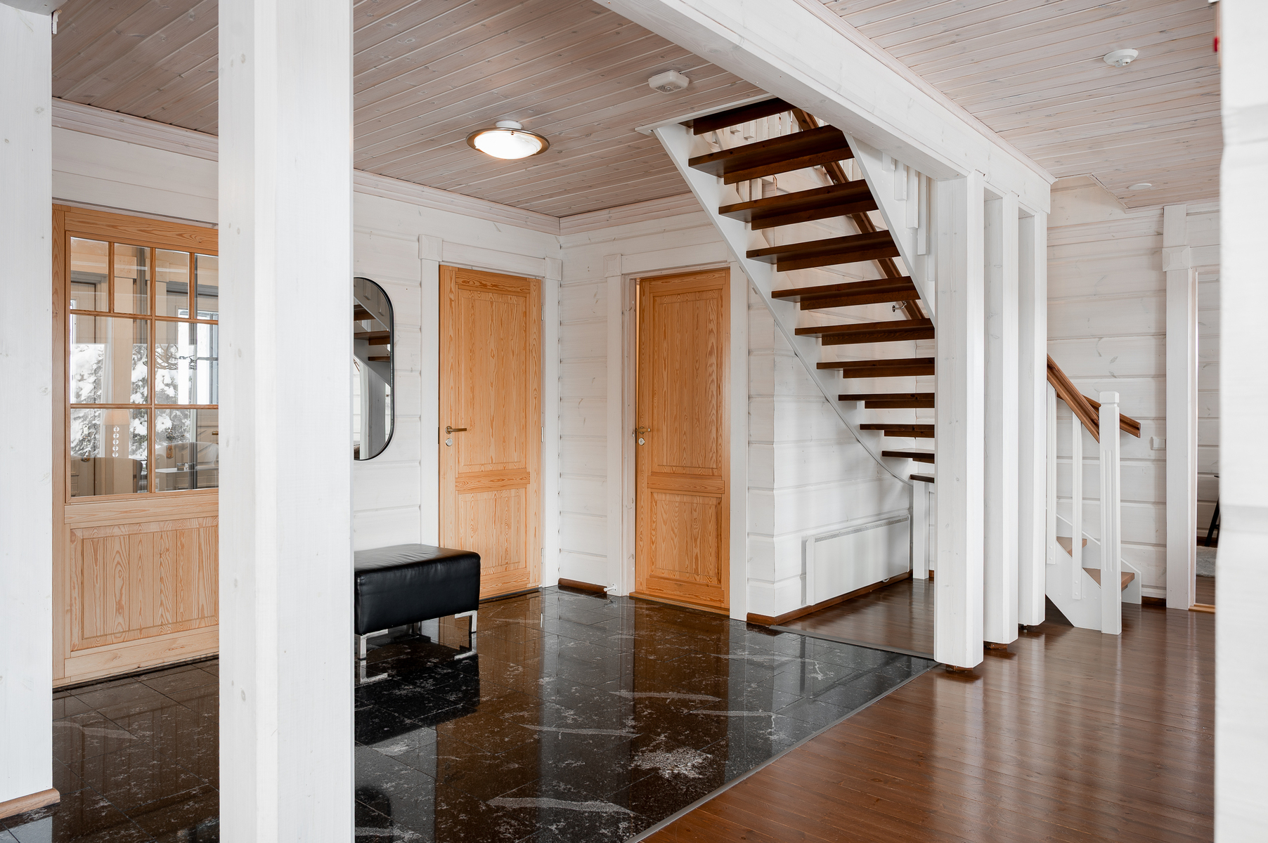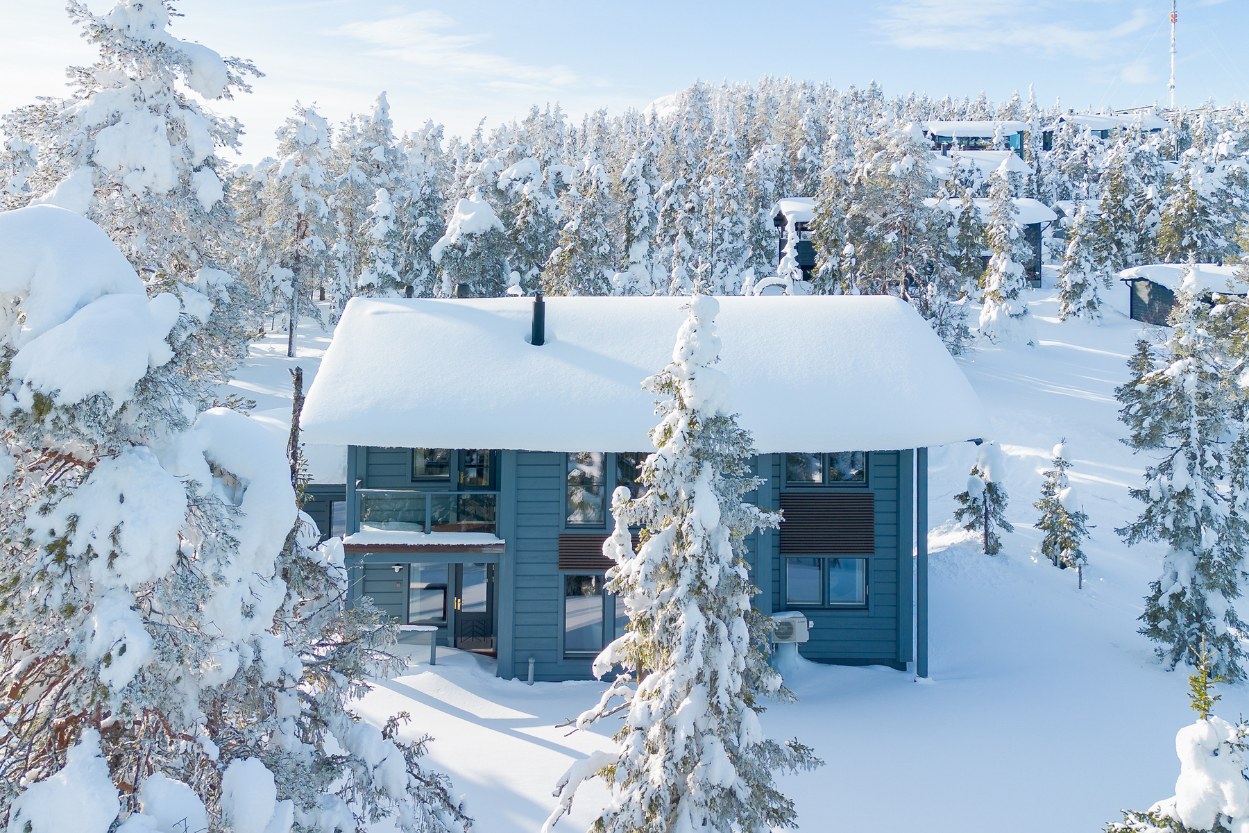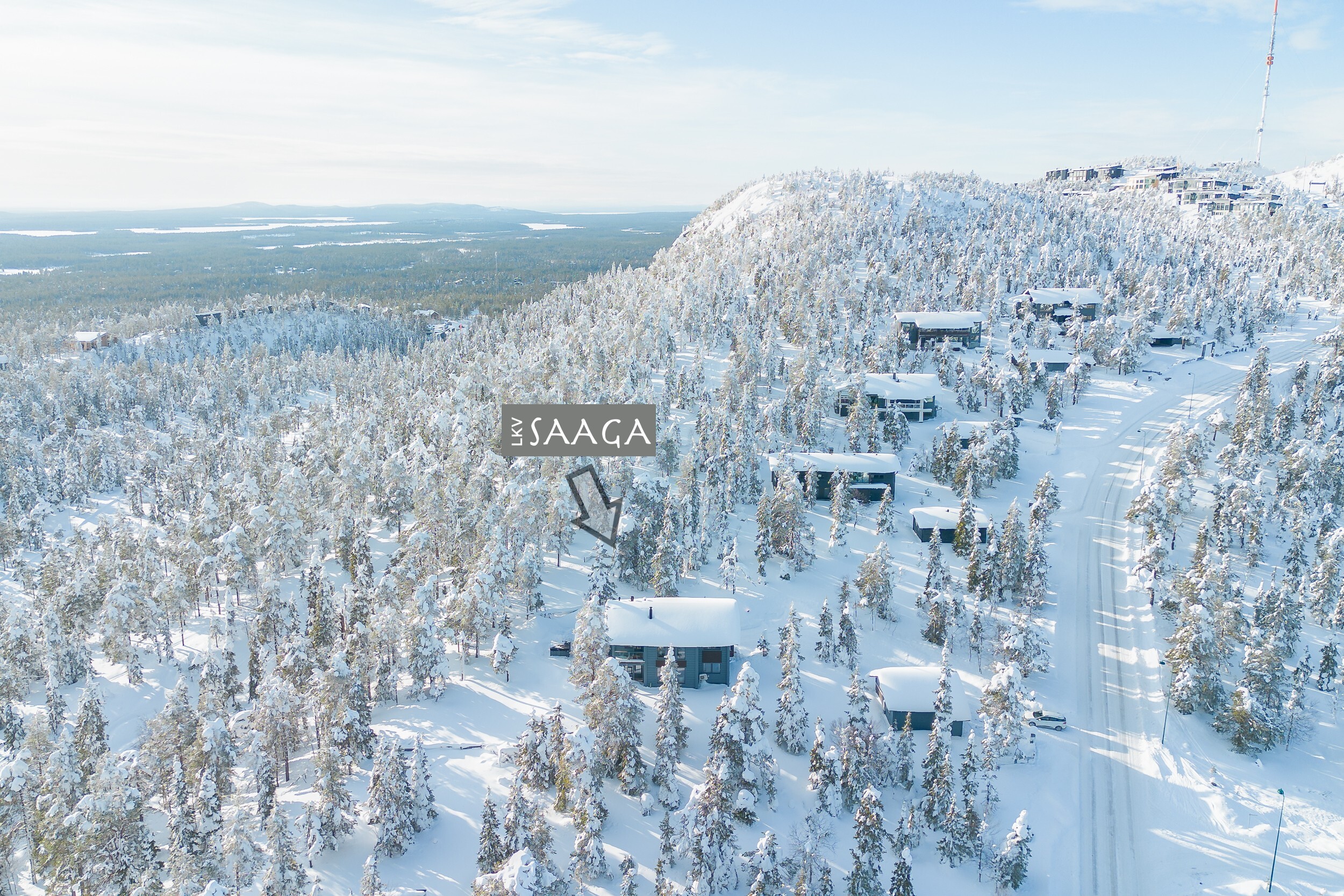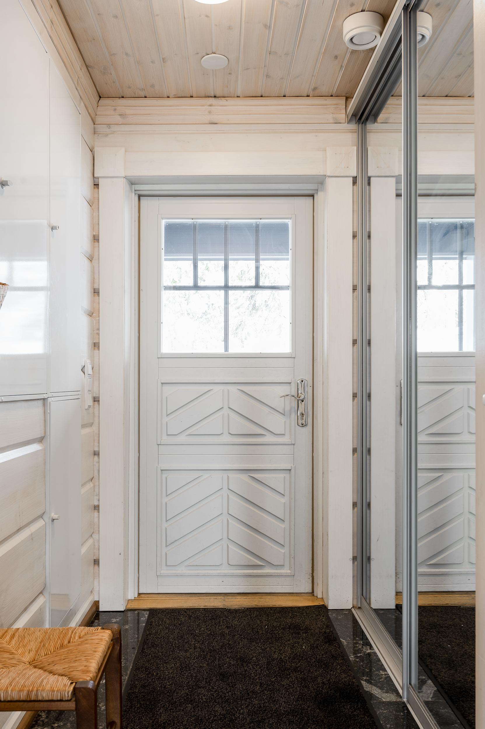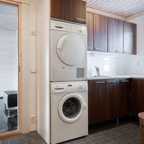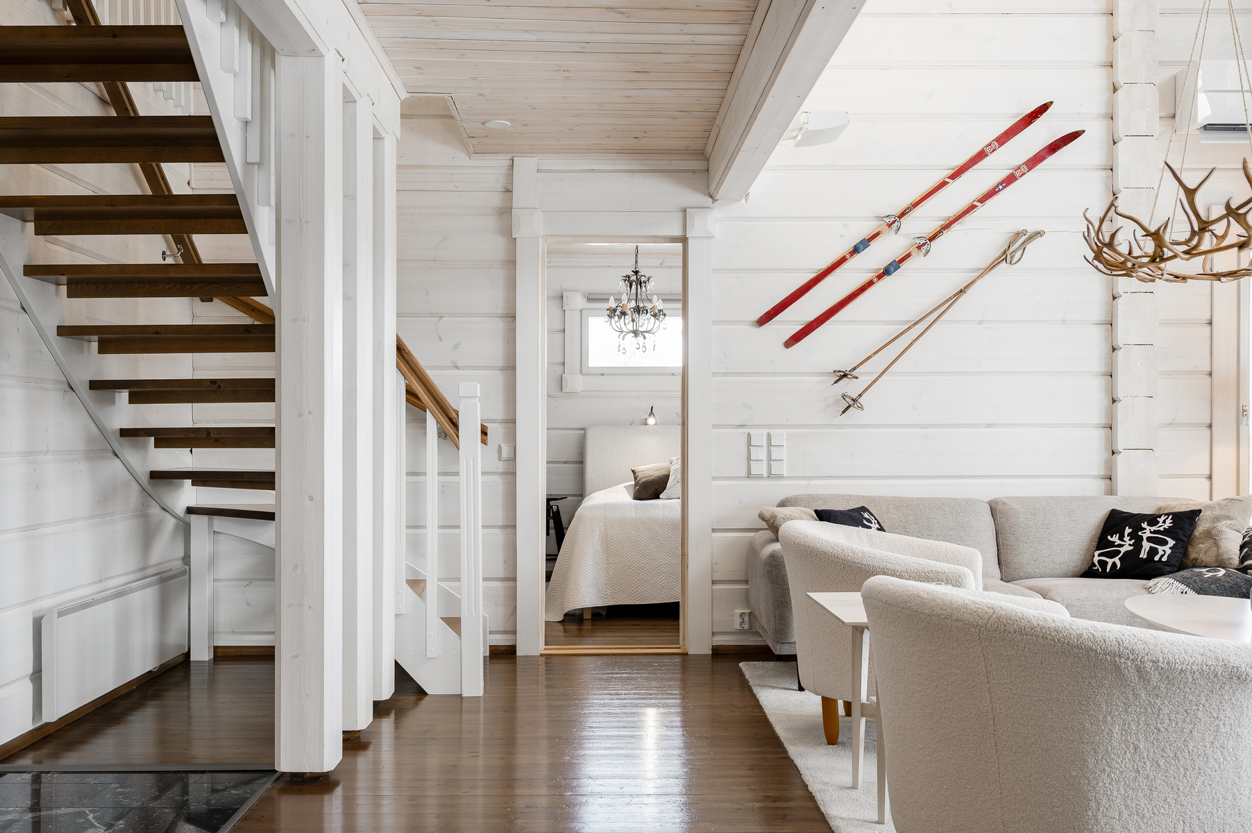 Tuulikaapissa liukuovikaapistot. Yläkerrassa avara aulatila, josta upeat näkymät tunturimaisemiin. Iso vaatehuonetila.