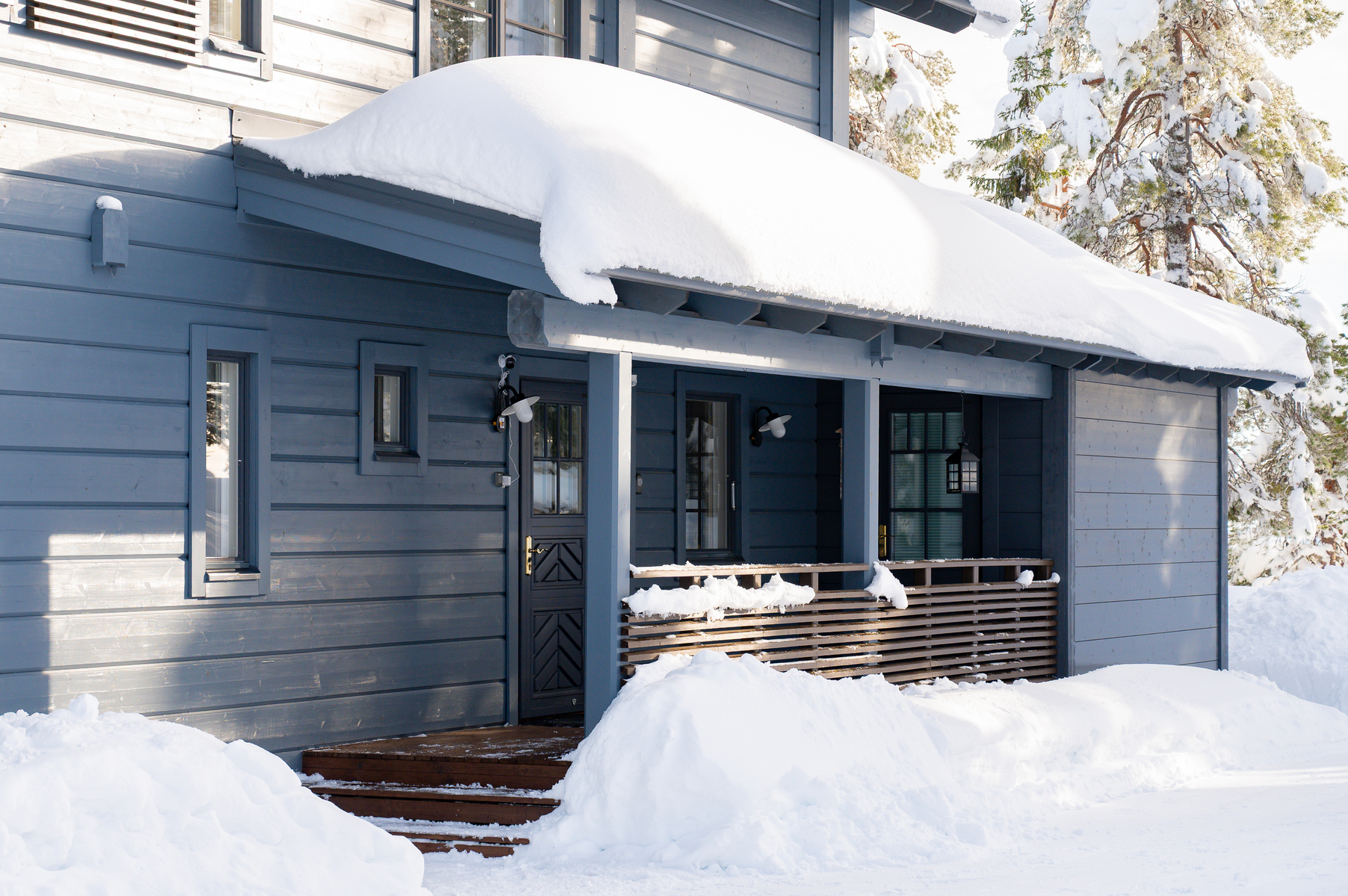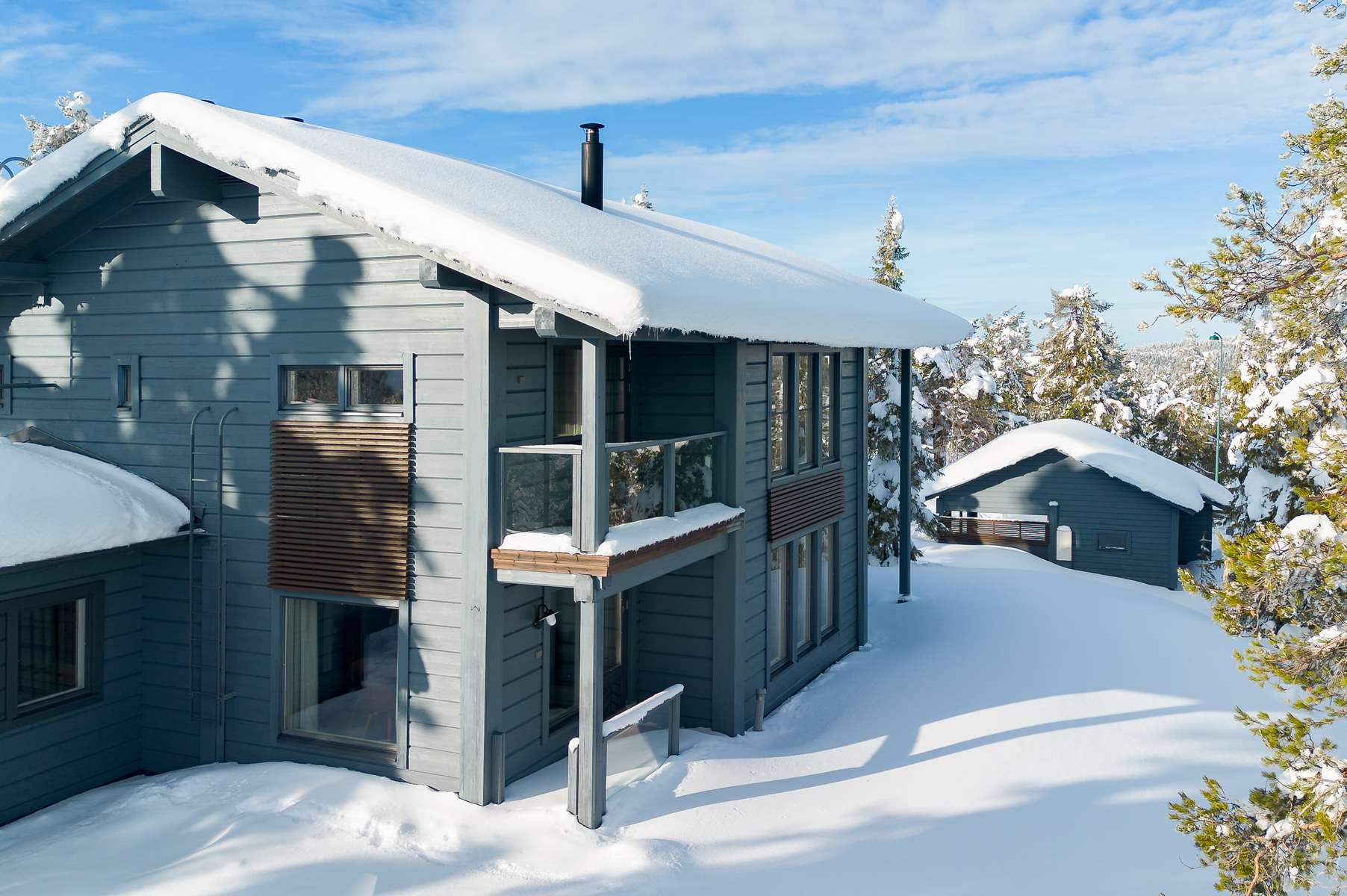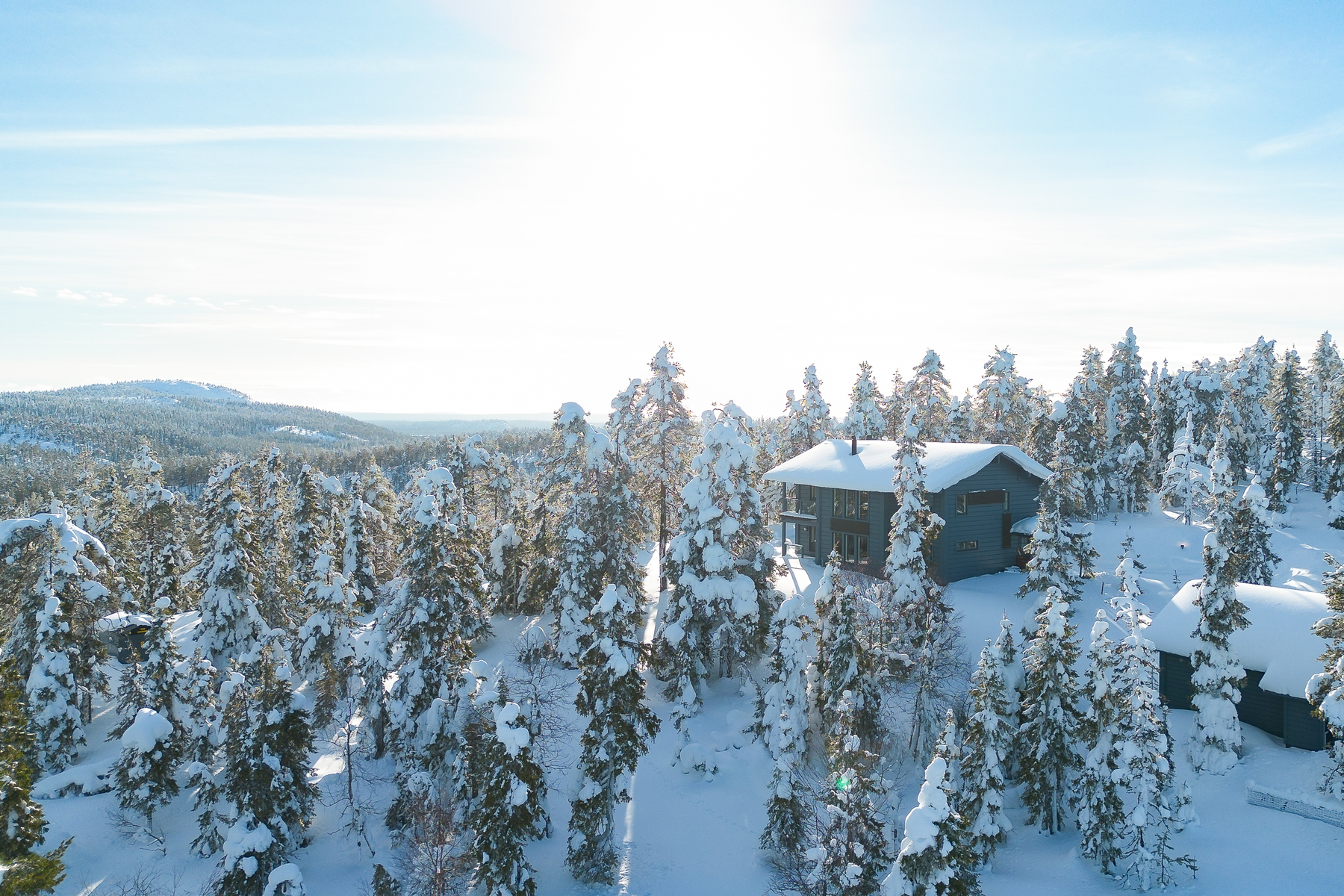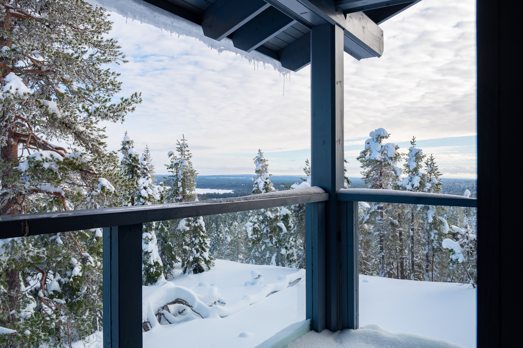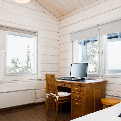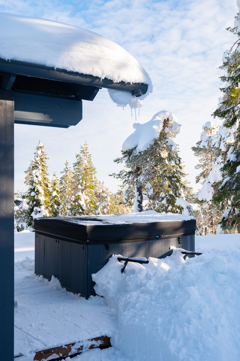 Tuulikaapissa liukuovikaapistot. Yläkerrassa avara aulatila, josta upeat näkymät tunturimaisemiin. Iso vaatehuonetila.