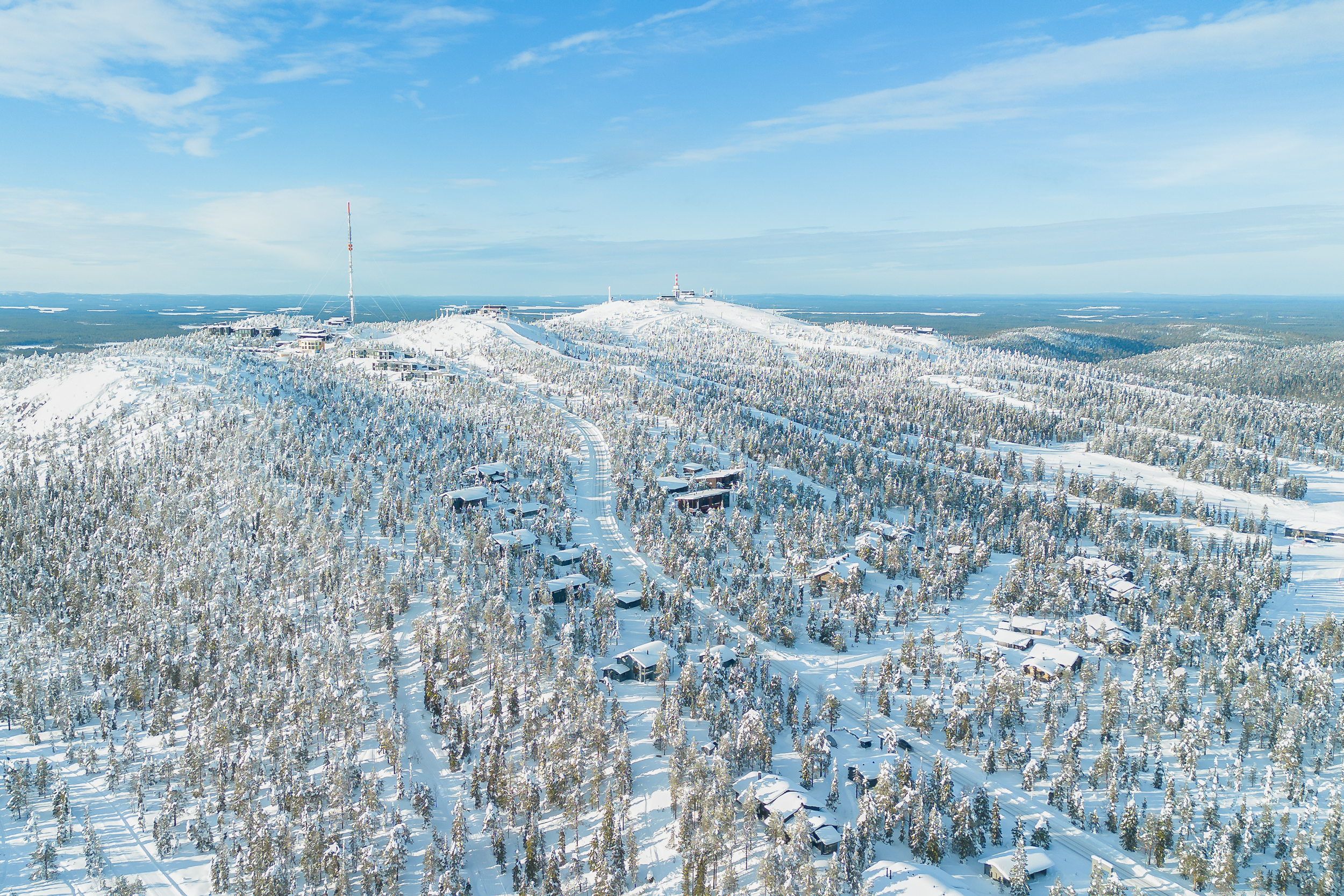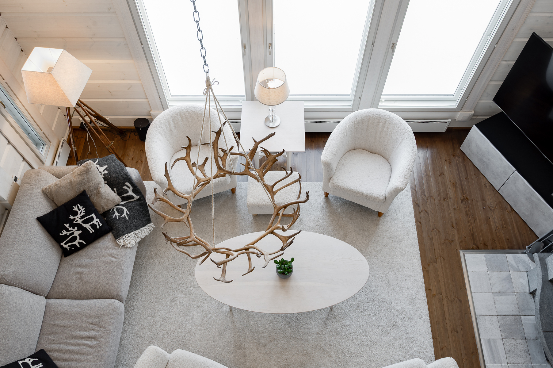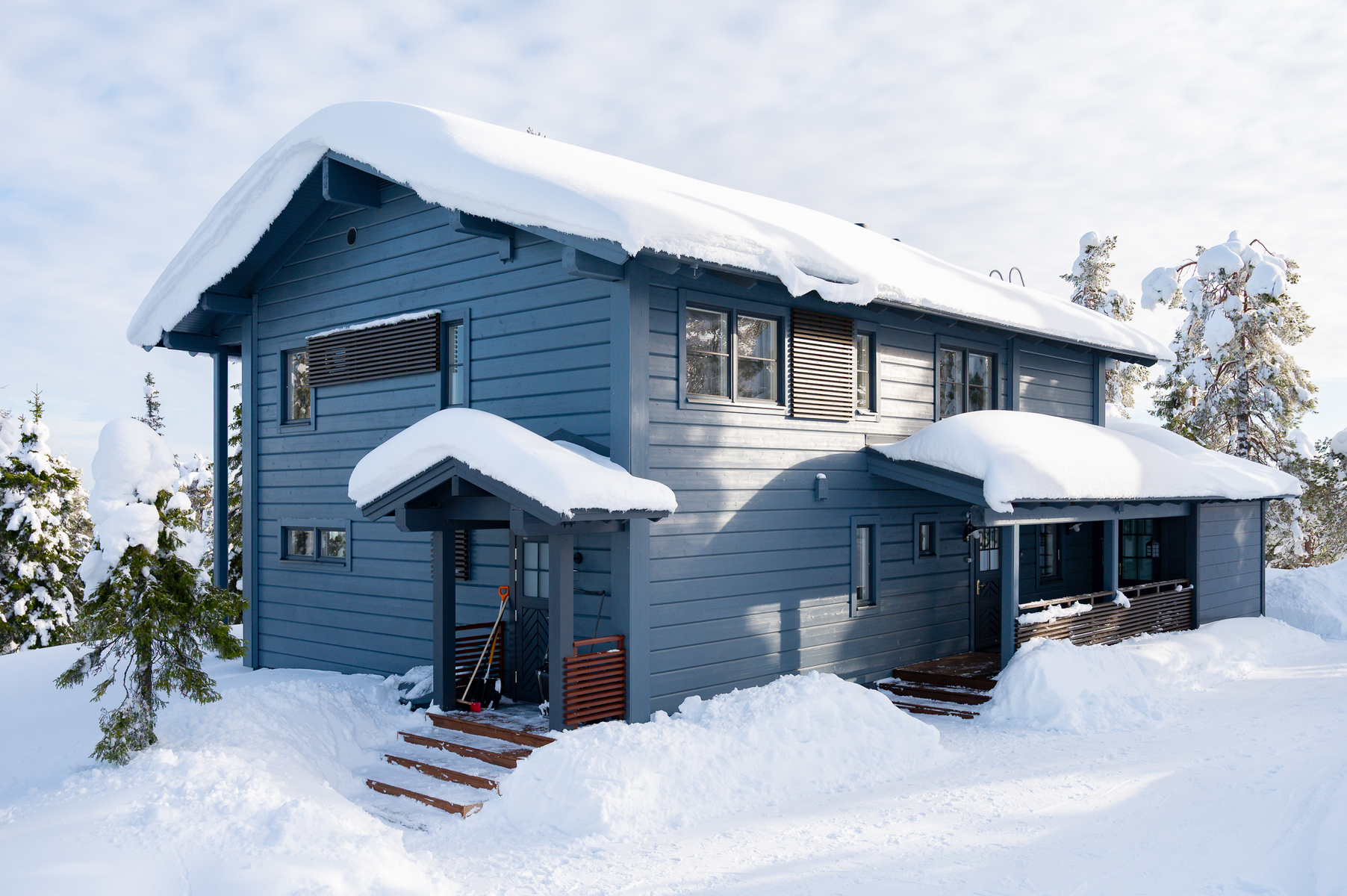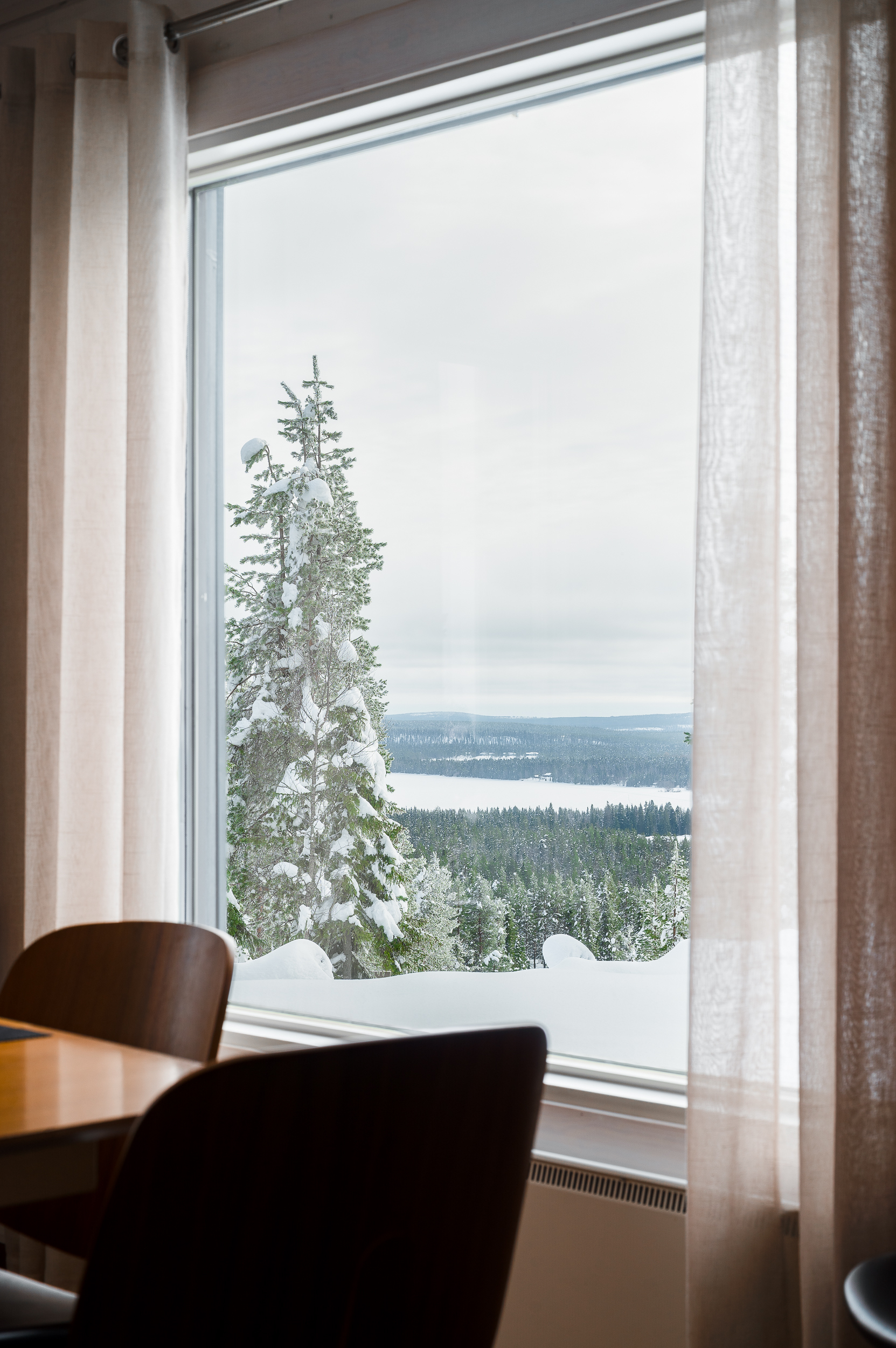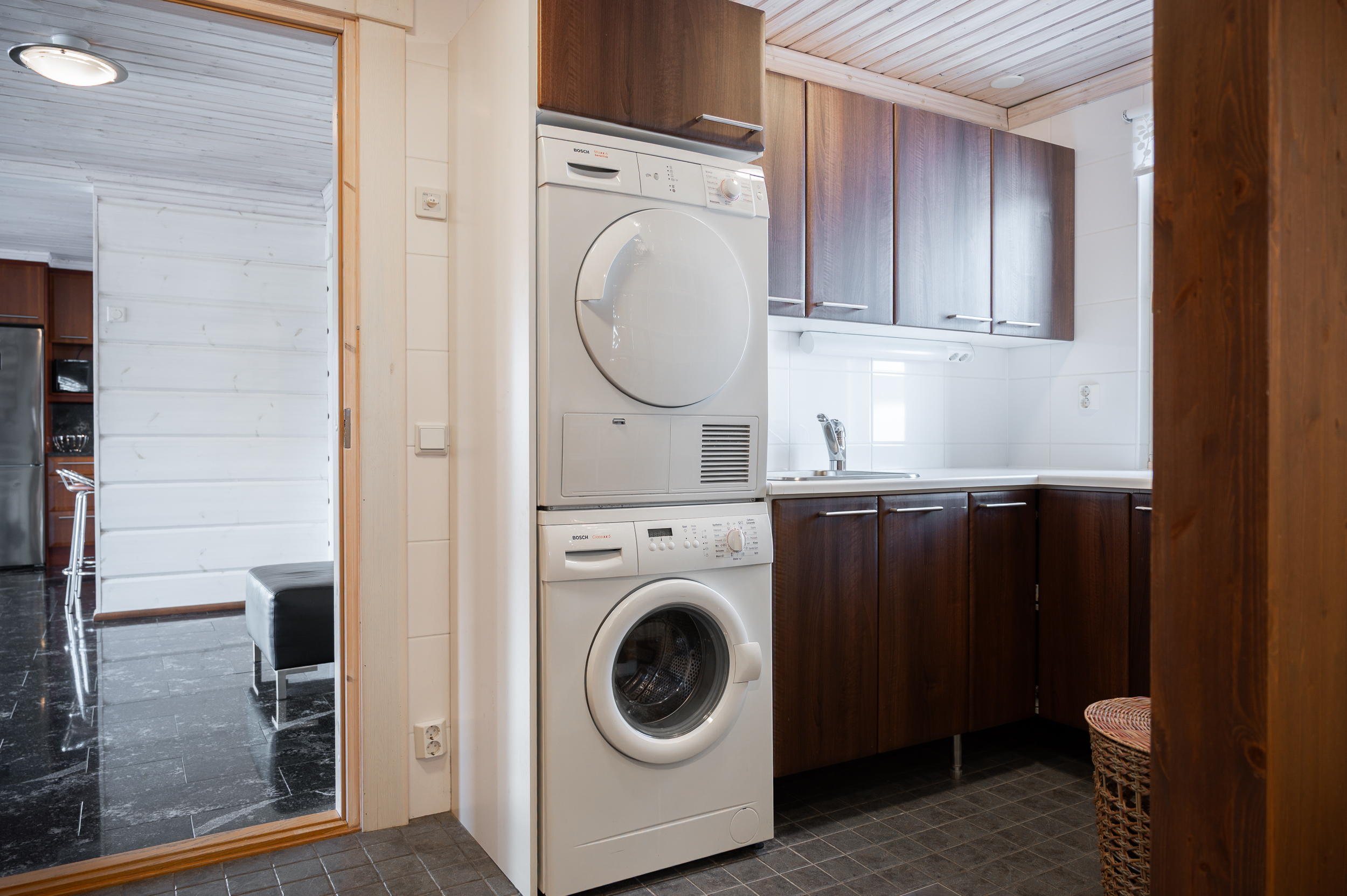 Tuulikaapissa liukuovikaapistot. Yläkerrassa avara aulatila, josta upeat näkymät tunturimaisemiin. Iso vaatehuonetila.