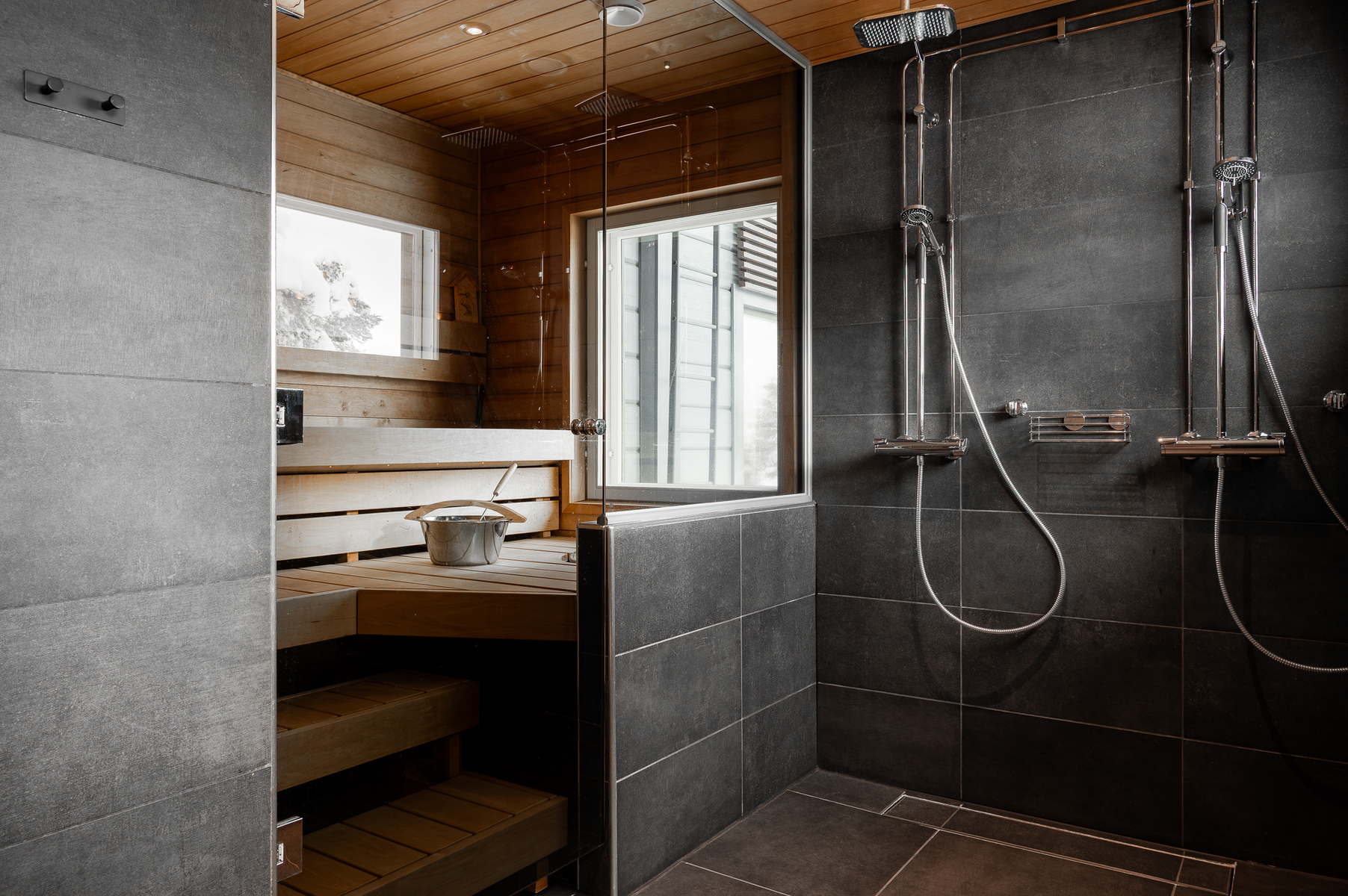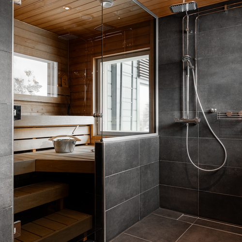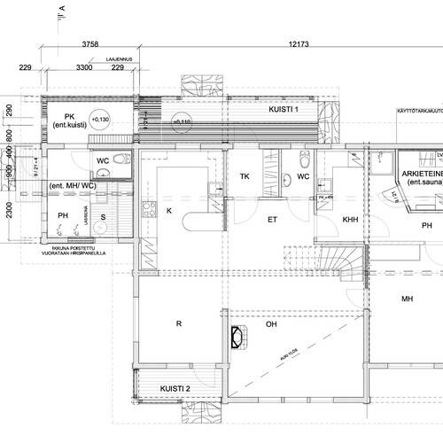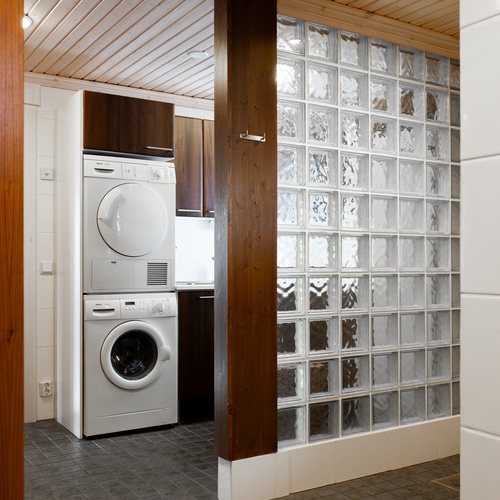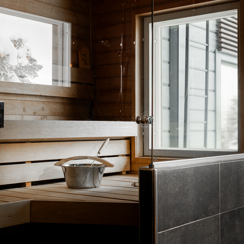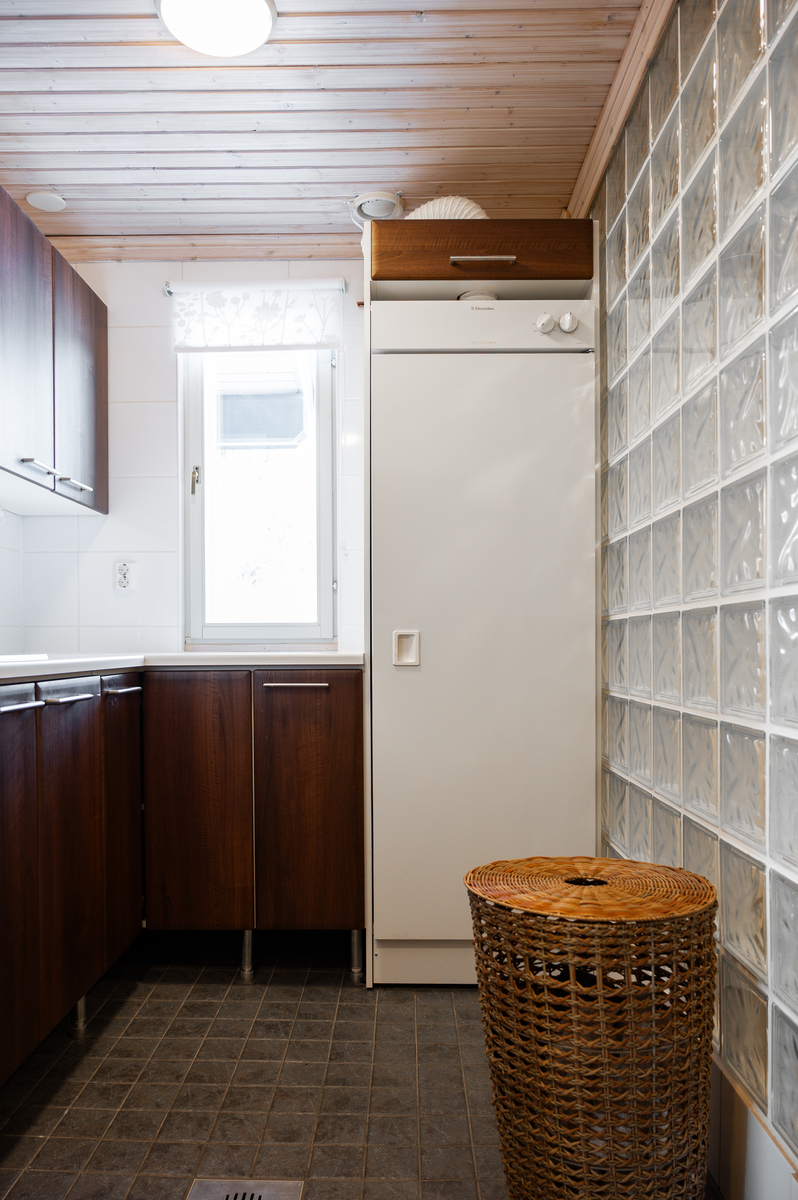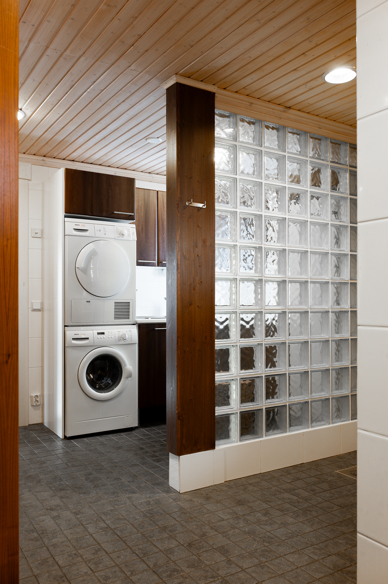 Laajennus: vierashuone muutettu saunaksi, uusi pesu- ja pukuhuone, uudessa saunassa ainavalmis kiuas.