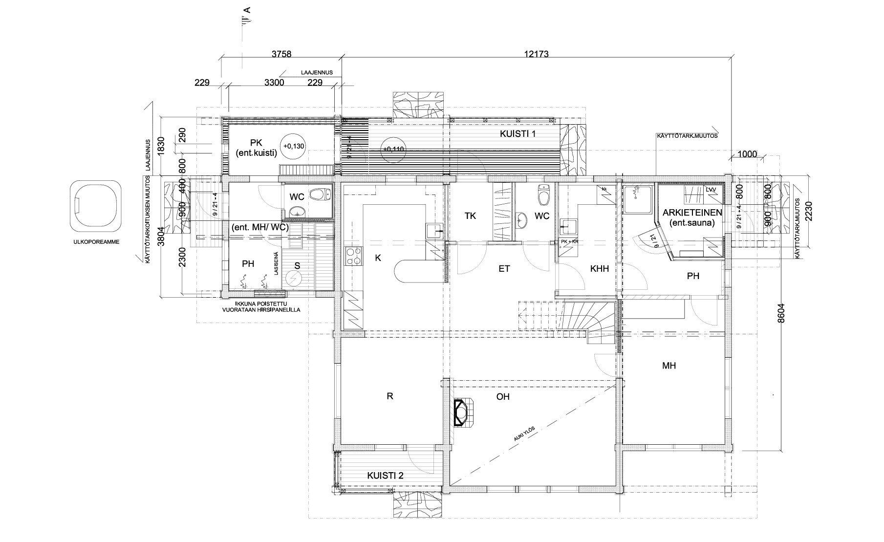 Terassi laajennettu ja uusi uloskäynti saunaosastolta ulkoporealtaalle.