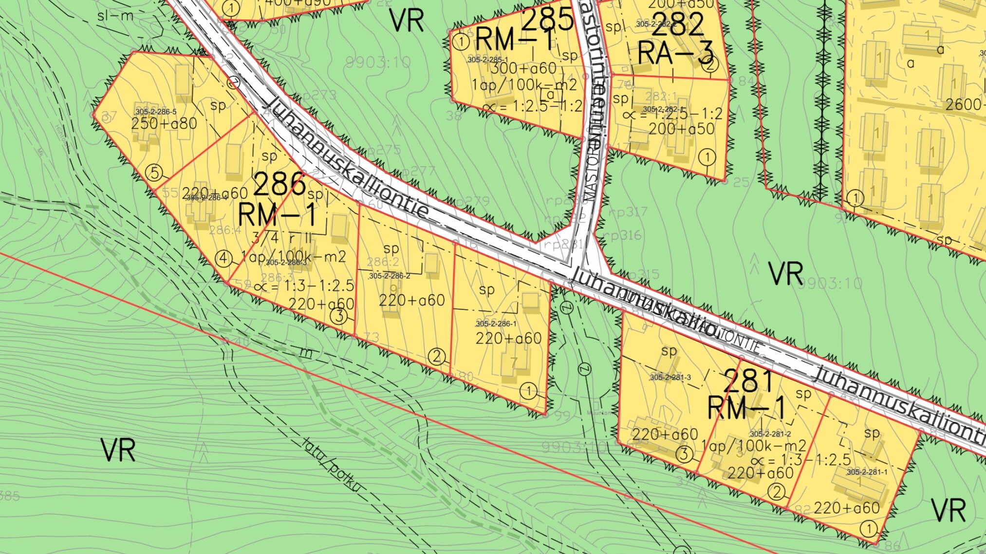 Rukan asemakaava, RM-1 3/4 r II. 1 ap /100k-m², 220 +a60. Osittain suojapuustoaluetta.