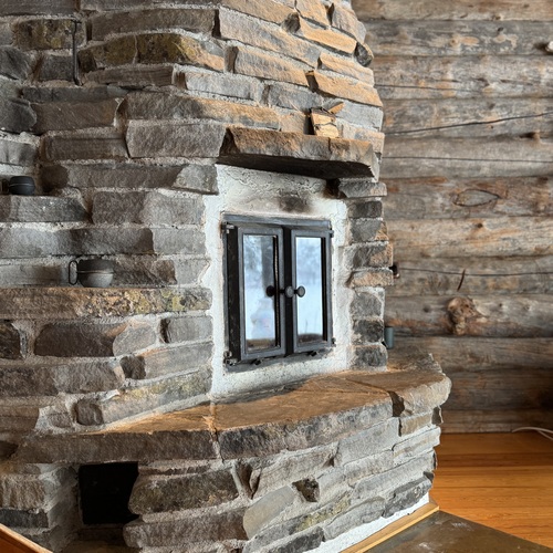 Perinteinen grillikota lasi-ikkunoin ja rakoliiteri polttopuille.