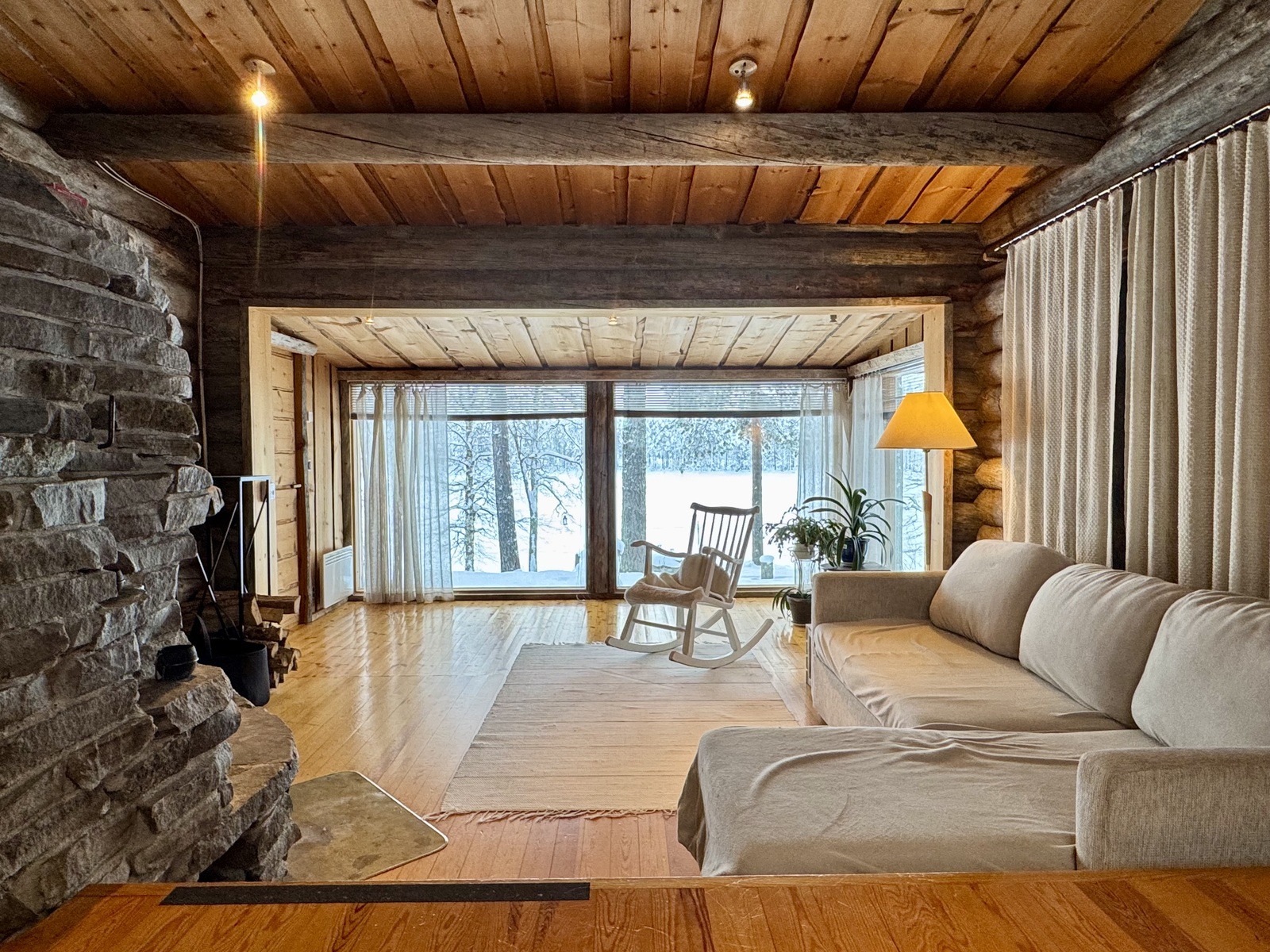 Olohuoneen isoista ikkunoista avautuu suoraan näkymä järvelle, täydellinen paikka aamukahveille.