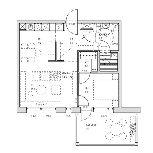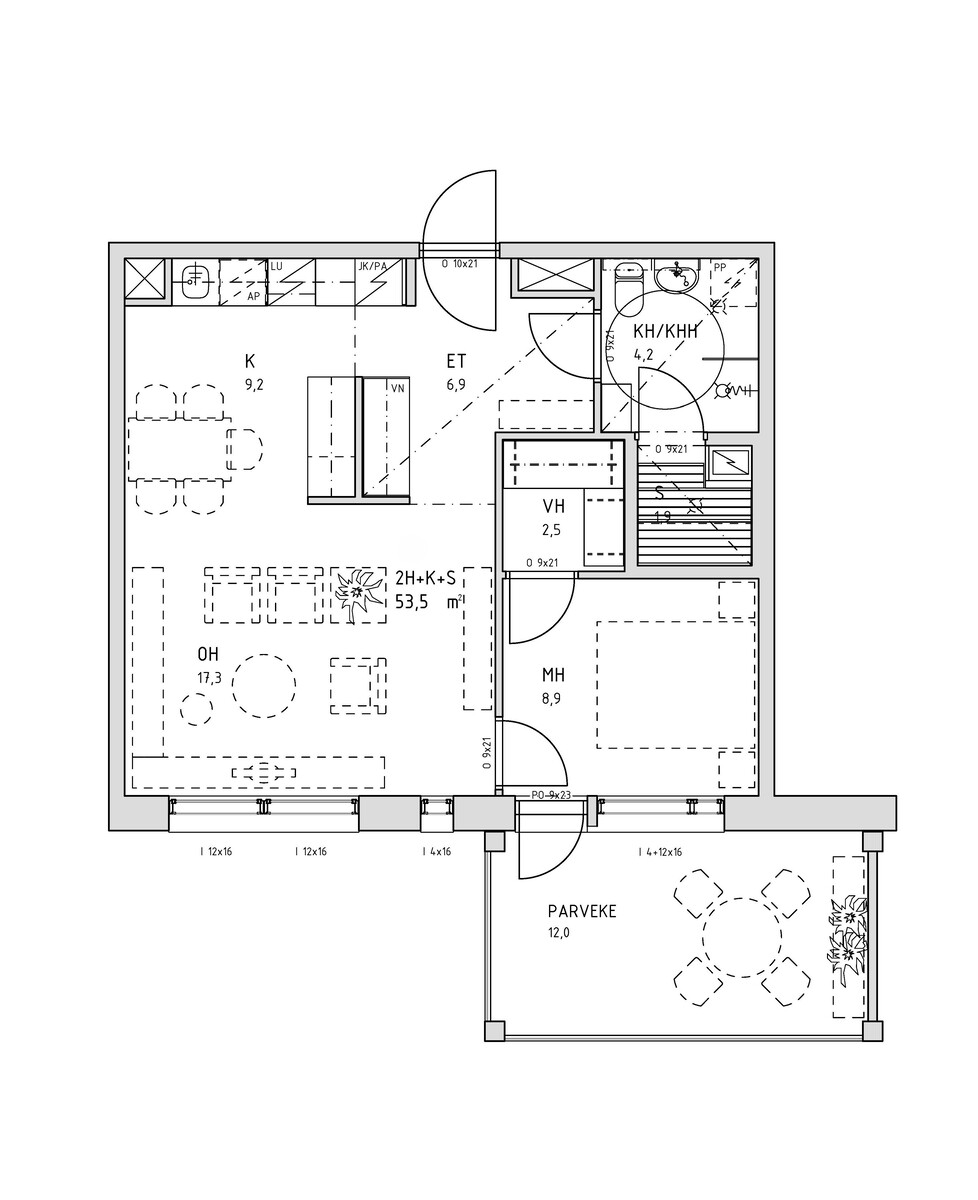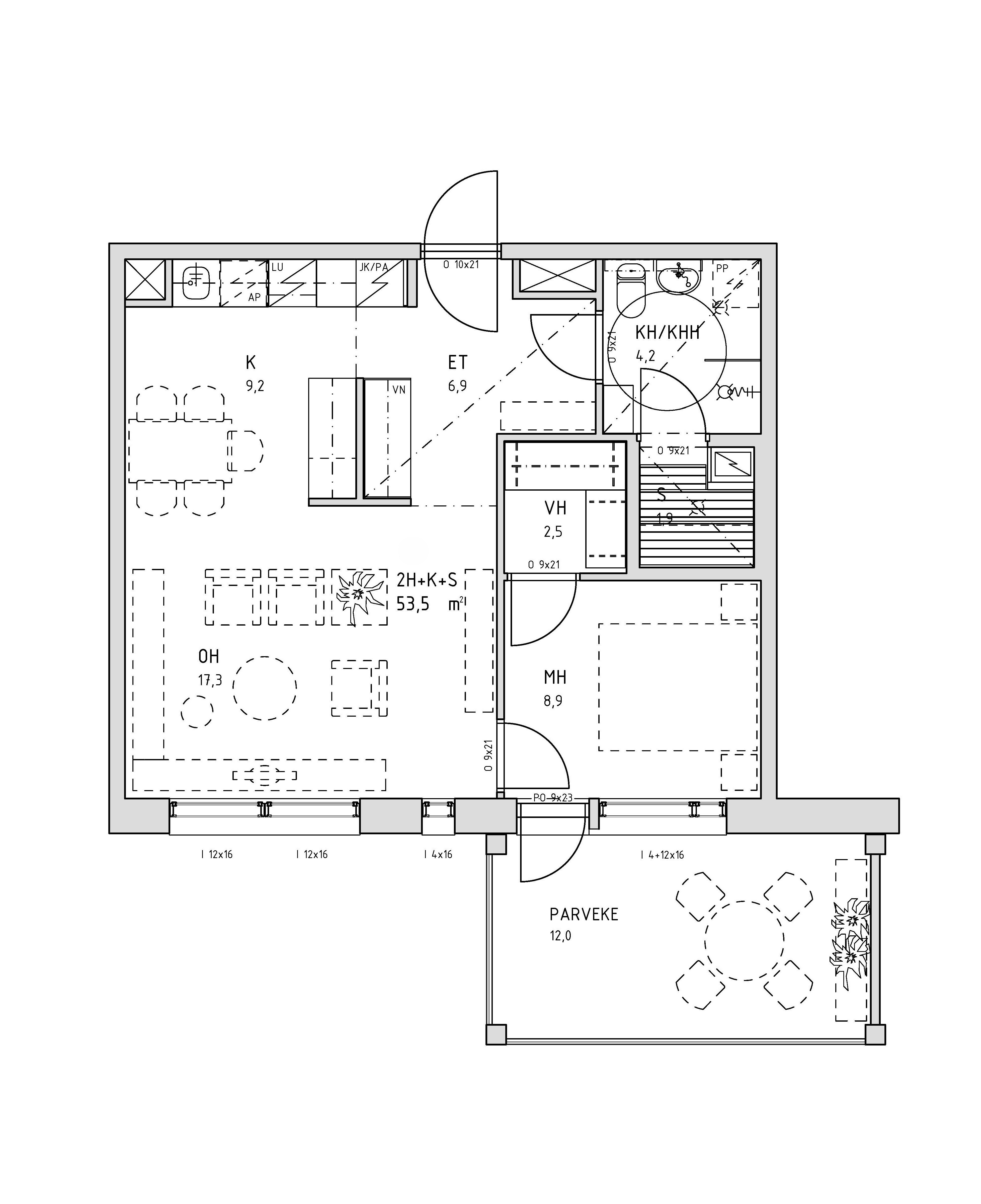 Ensimmäisessä kerroksessa lämmin huoneistovarasto.