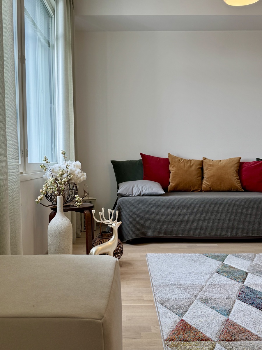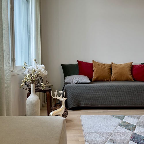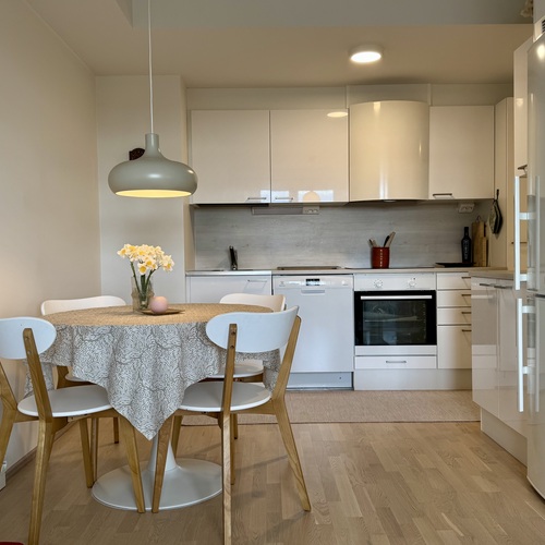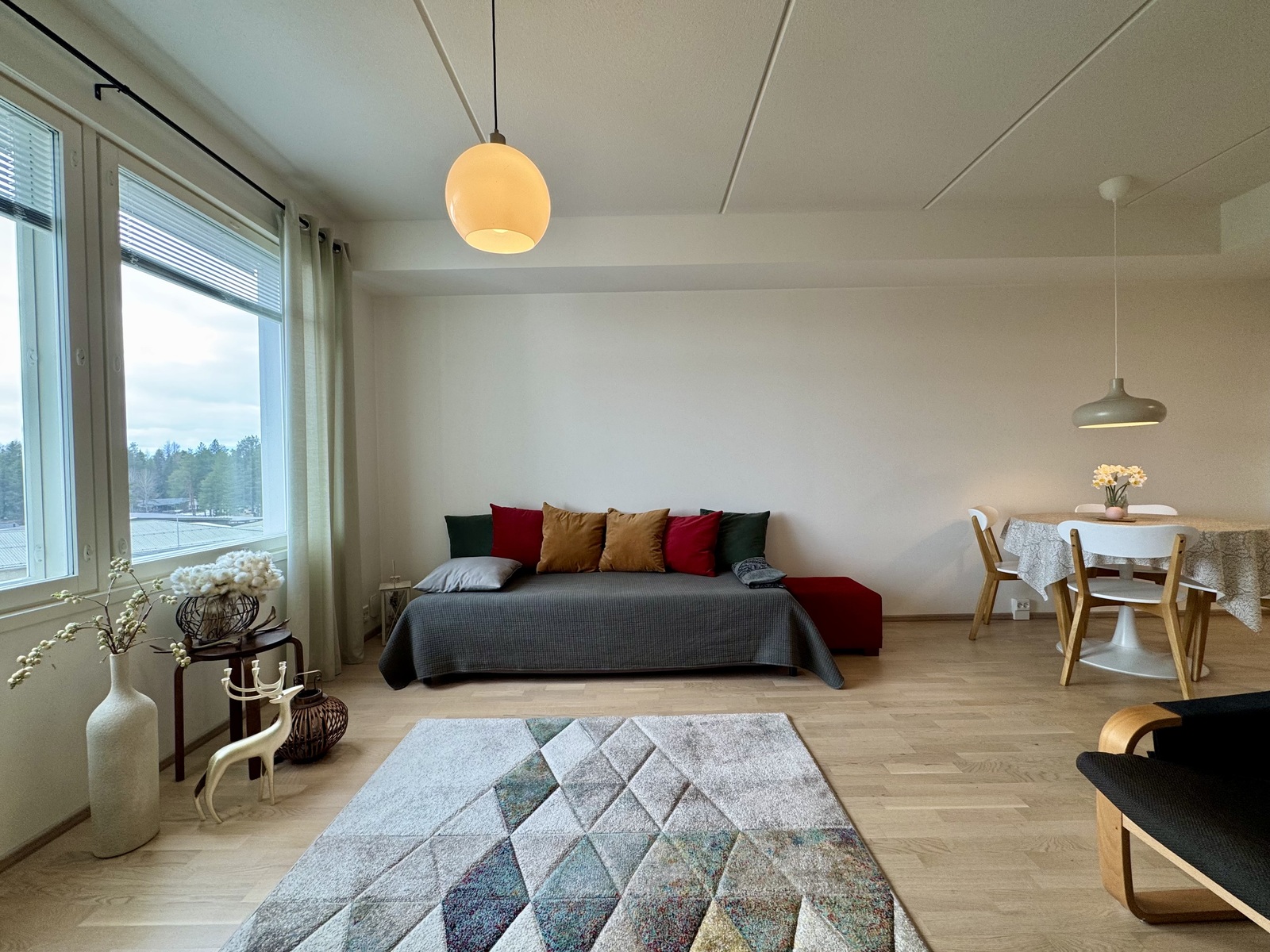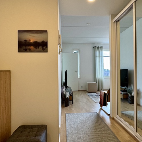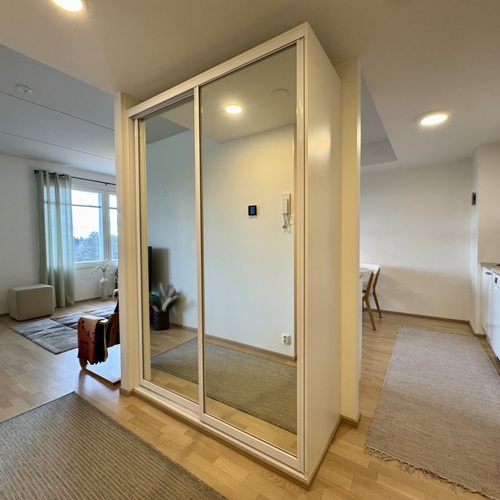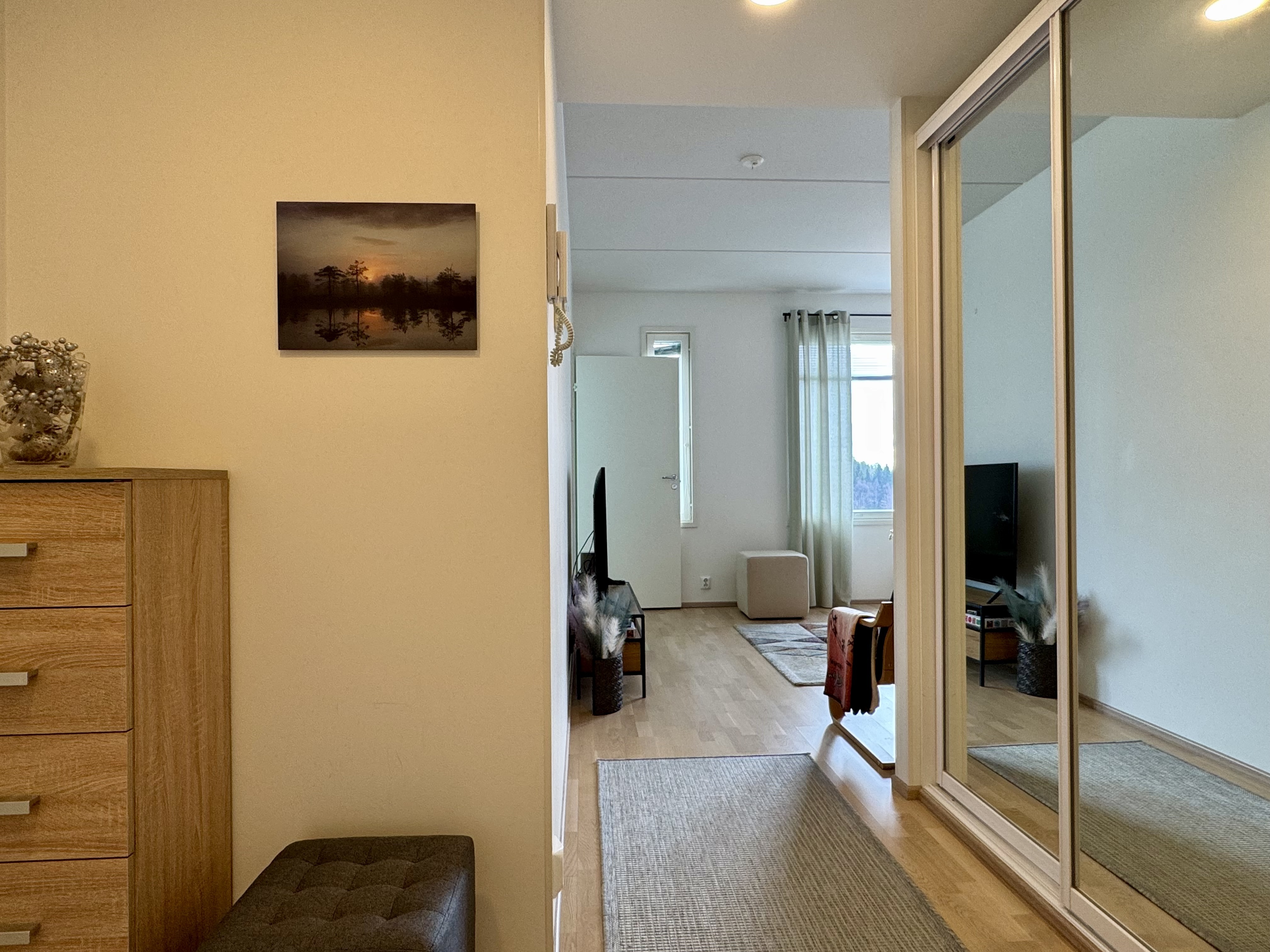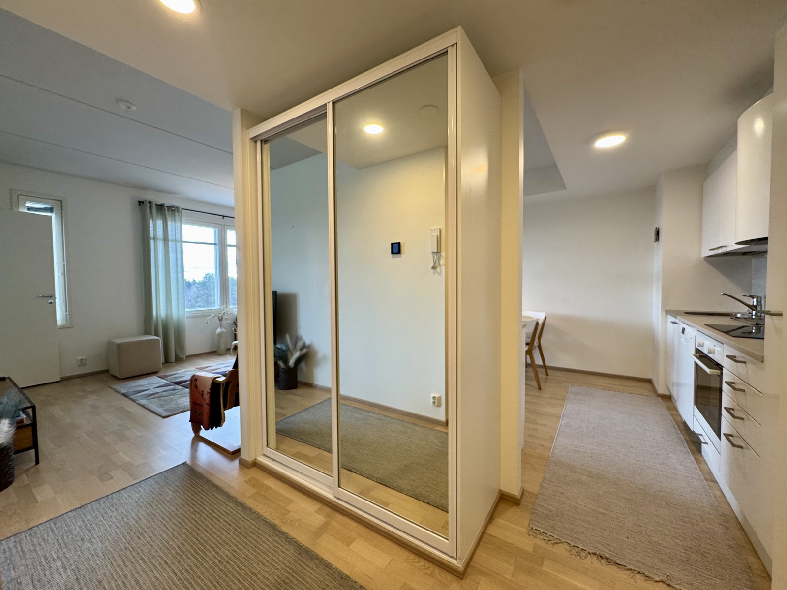 Olohuoneeseen yhdistyy moderni keittiö, jossa runsaasti kaappitilaa. Tilavan makuuhuoneen yhteydessä vaatehuone, makuuhuoneesta kulku parvekkeelle. Tunnelmallinen sauna on lämpökäsitellyillä paneeleilla paneloitu ja saunaosastolla on wc-tila allaskaapilla sekä erillinen suihkunurkkaus. Vaatesäilytystilaa on runsaasti eteisen peililiukuovien takana ja taloyhtiön ensimmäisessä kerroksessa lisäksi lämmin huoneistovarasto.