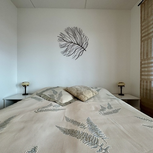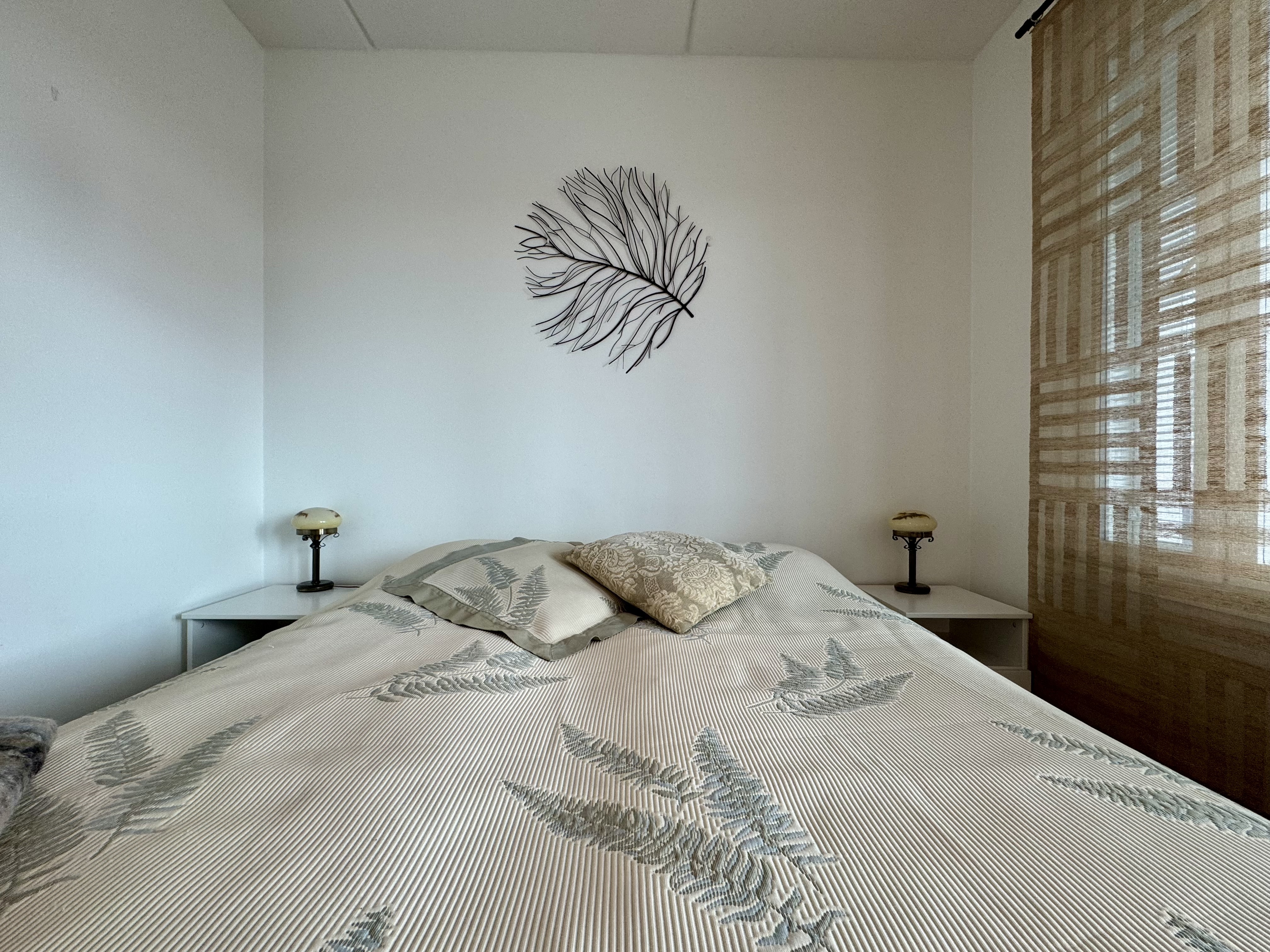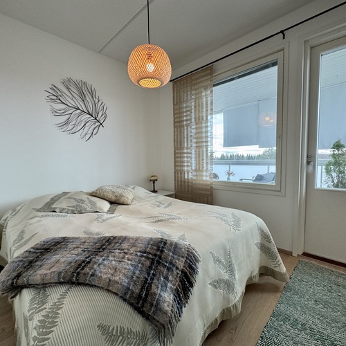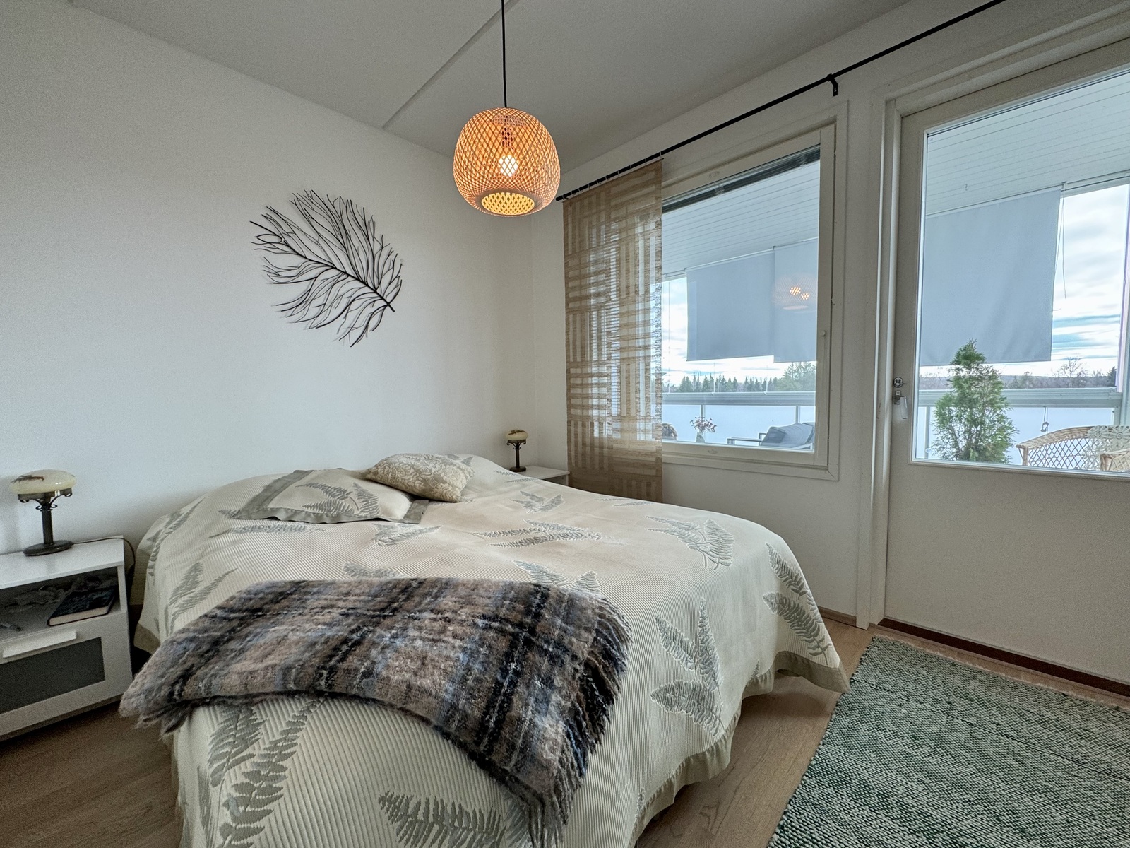 Makuuhuoneen yhteydessä vaatehuone, makuuhuoneesta kulku lasitetulle parvekkeelle.