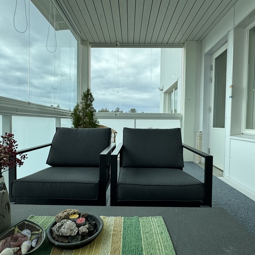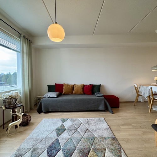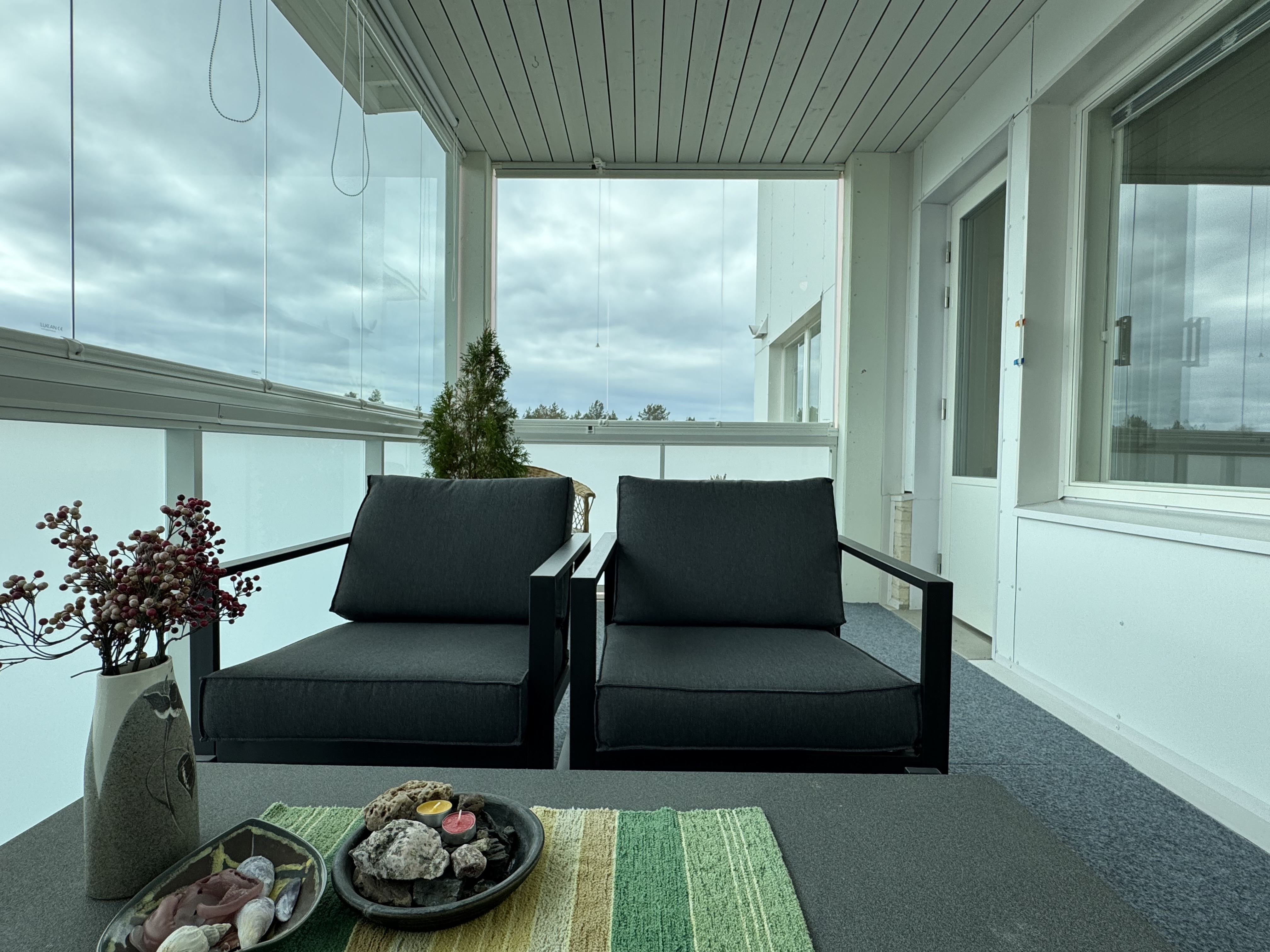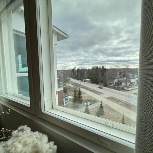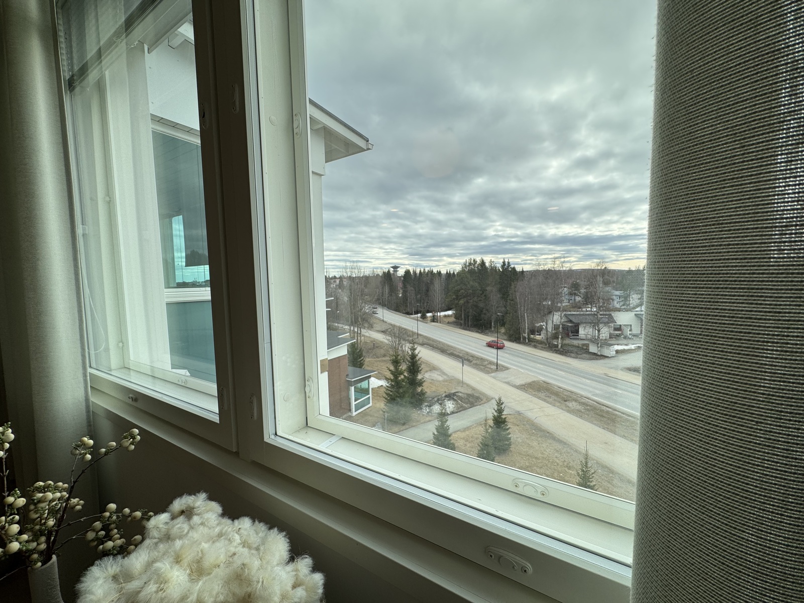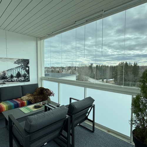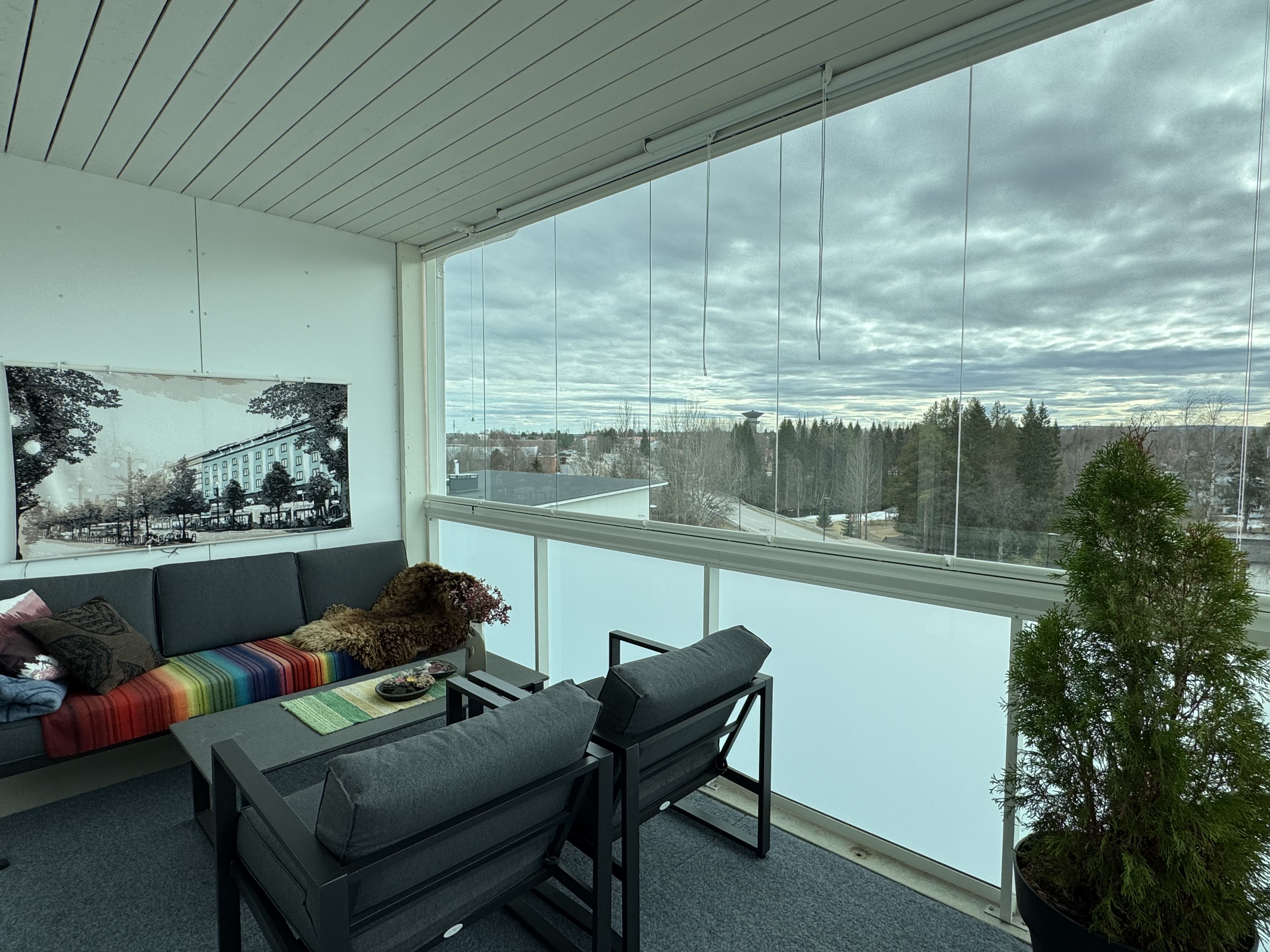 Asunto Oy Kuusamon Nilojoenmutka II:ssa ylimmän kerroksen viihtyisä kaksio, jossa iso lasitettu parveke.