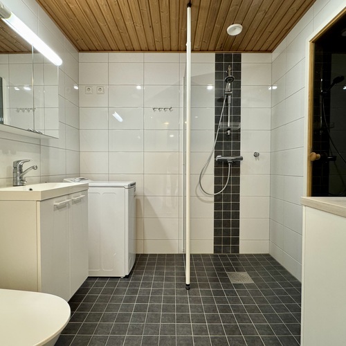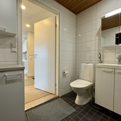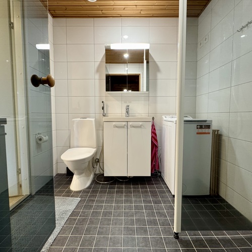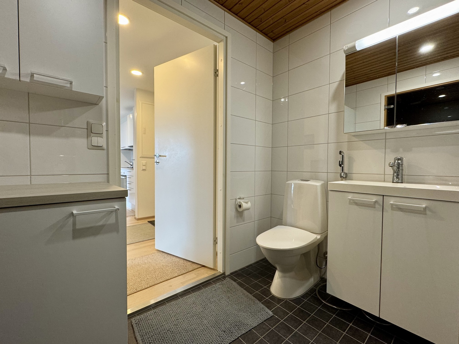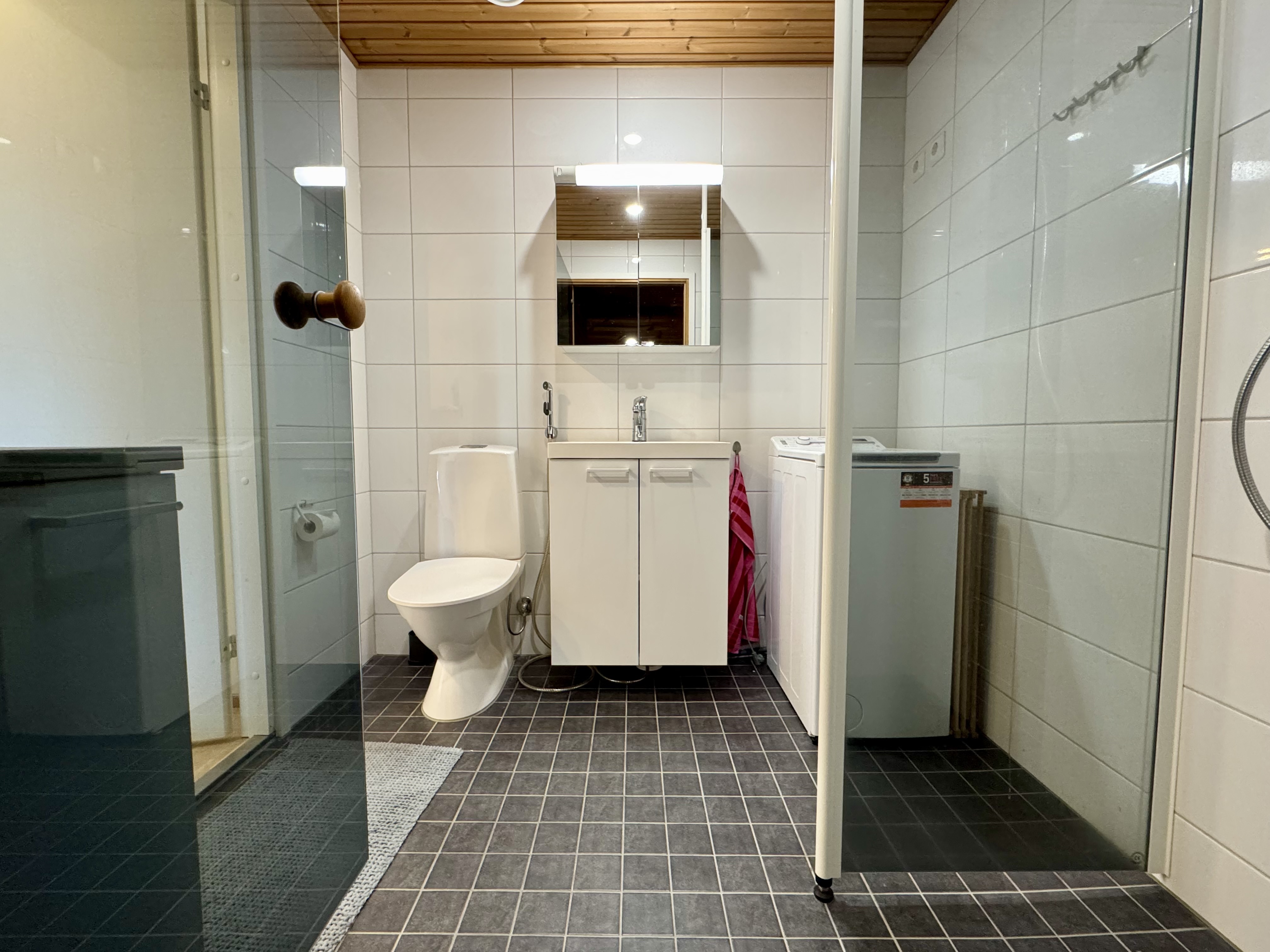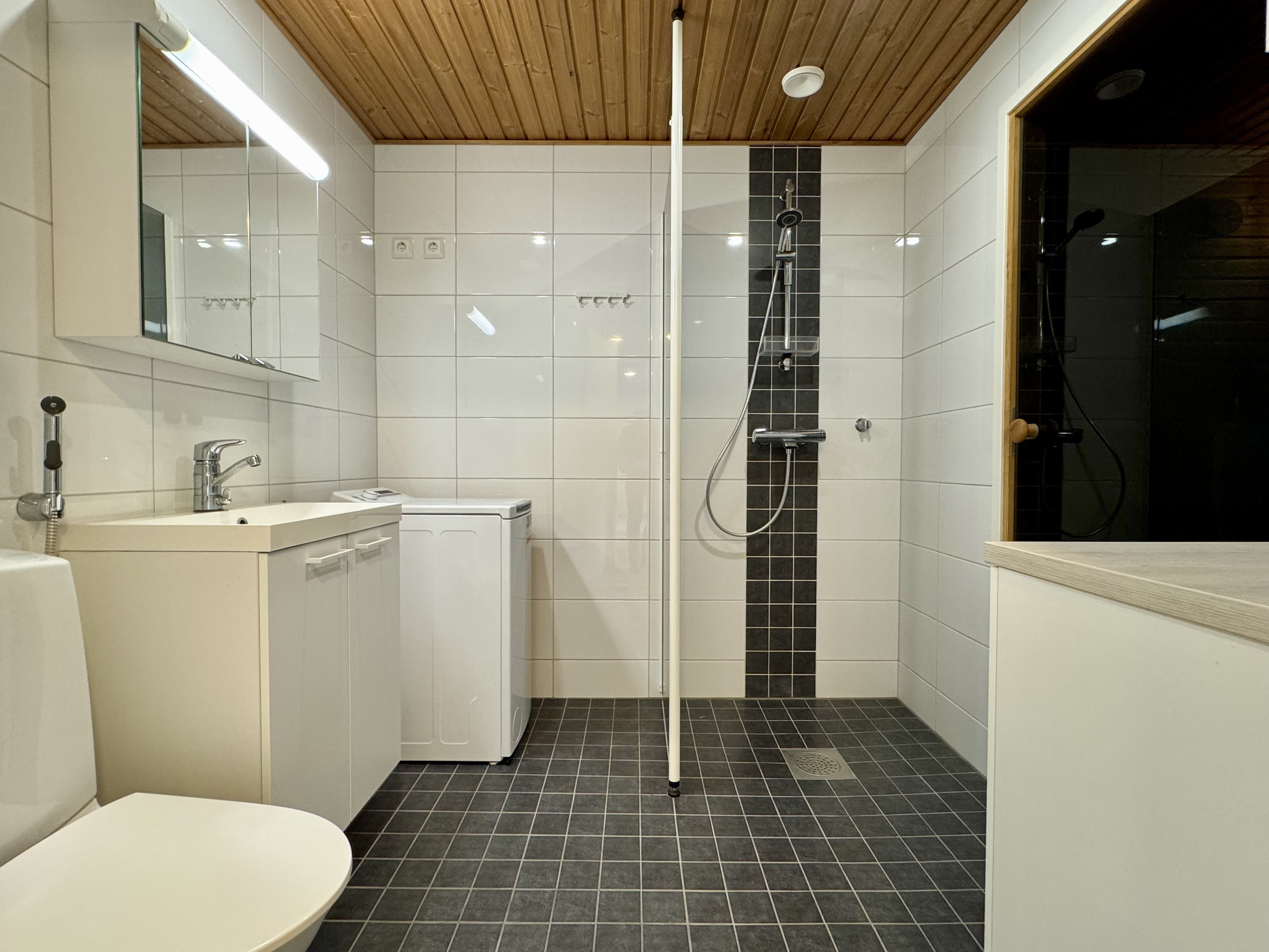 Varusteet: suihkuseinä, pesukoneliitäntä, wc-istuin, suihku, peilikaappi, kiinteät valaisimet, kylpyhuonekaapisto