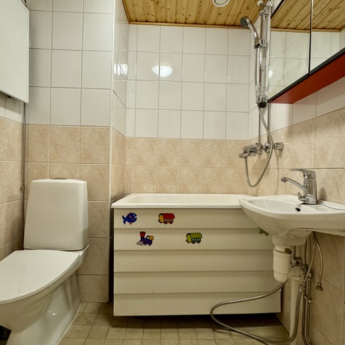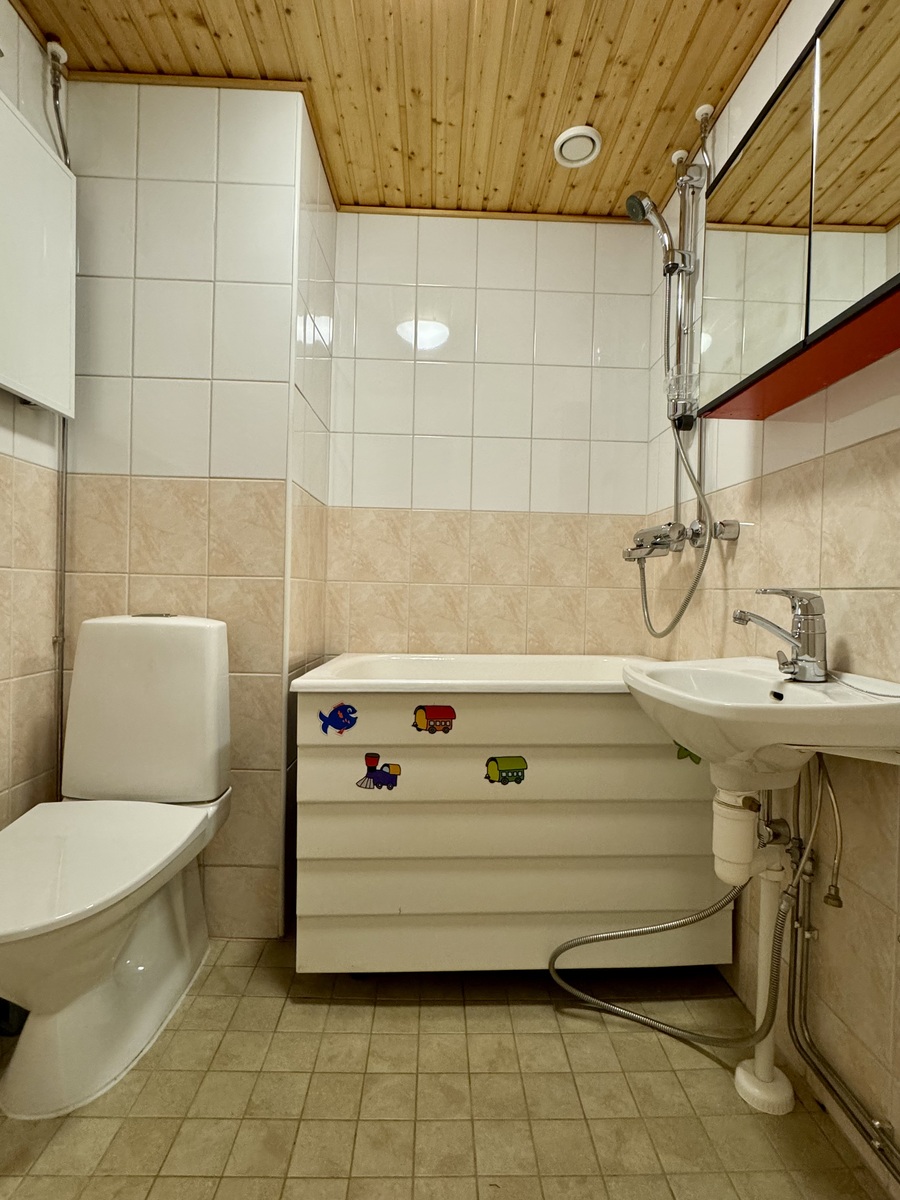 Varusteet: kylpyamme, wc-istuin, suihku, peilikaappi, kiinteät valaisimet