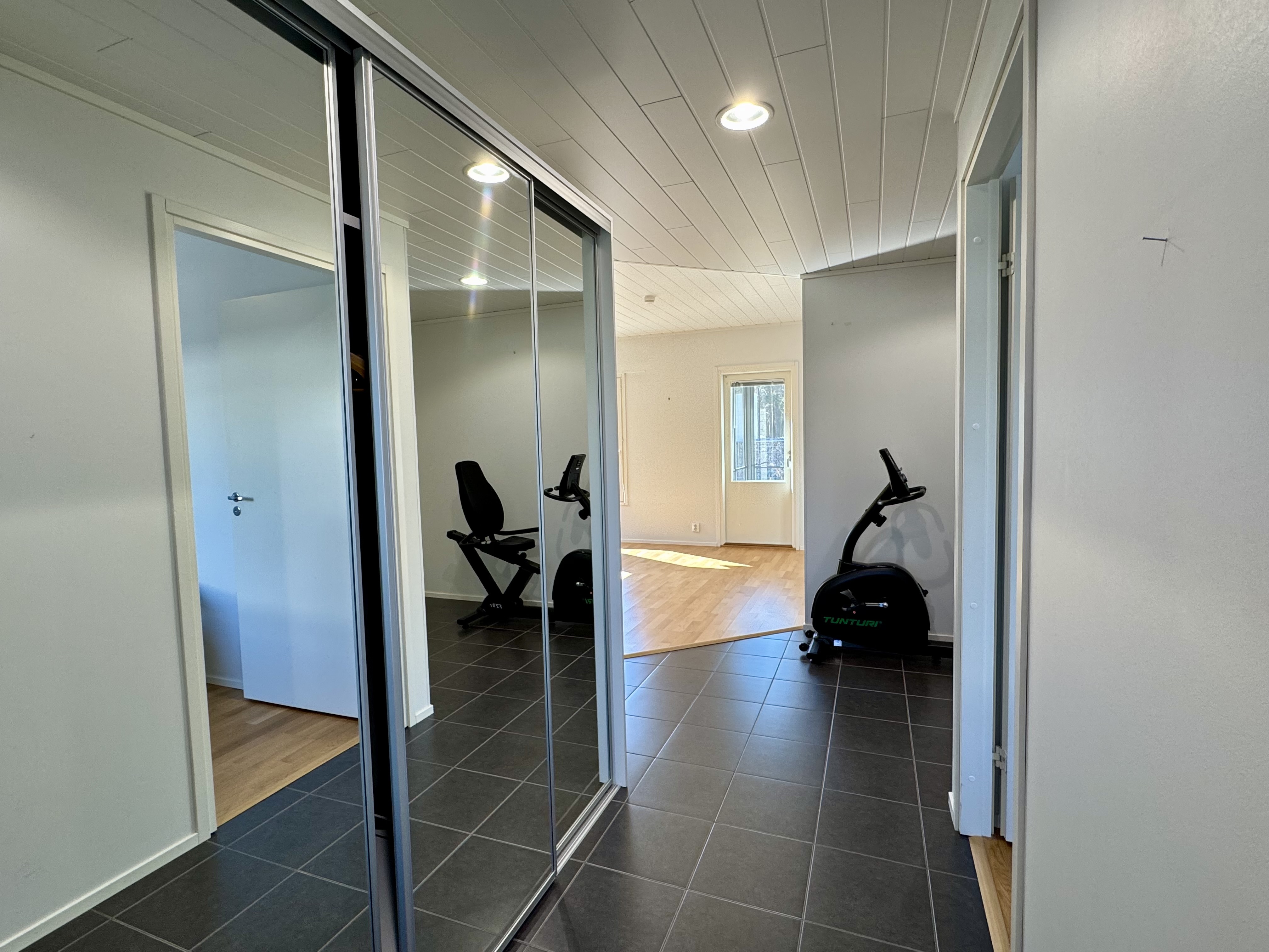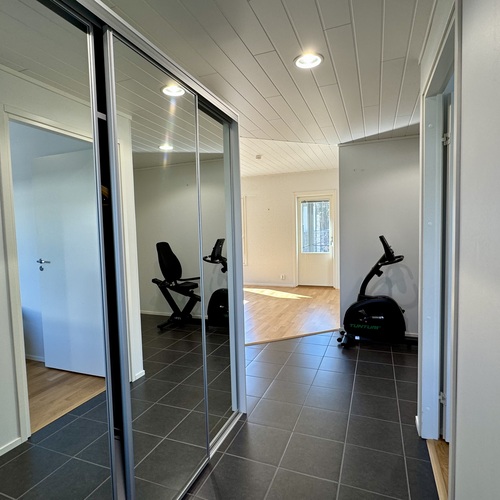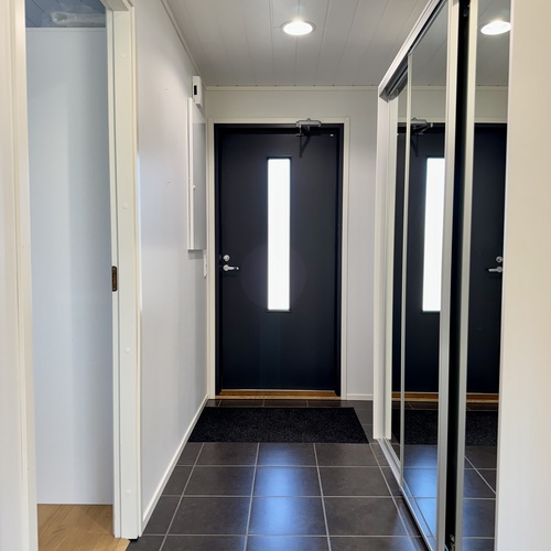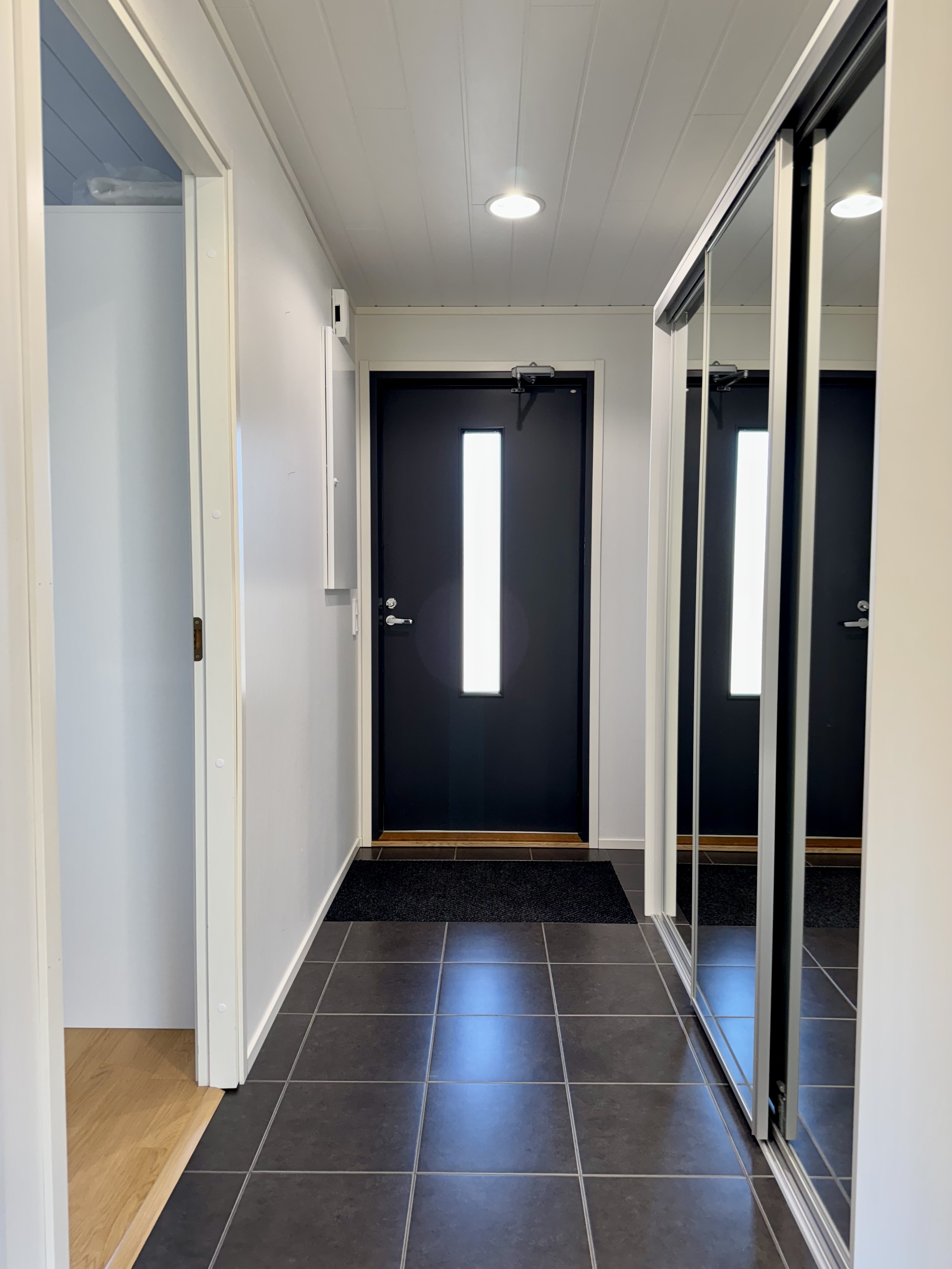 eteisessä laattalattia ja korkeat peililiukuovikaapit