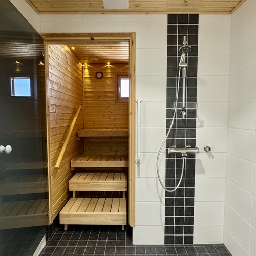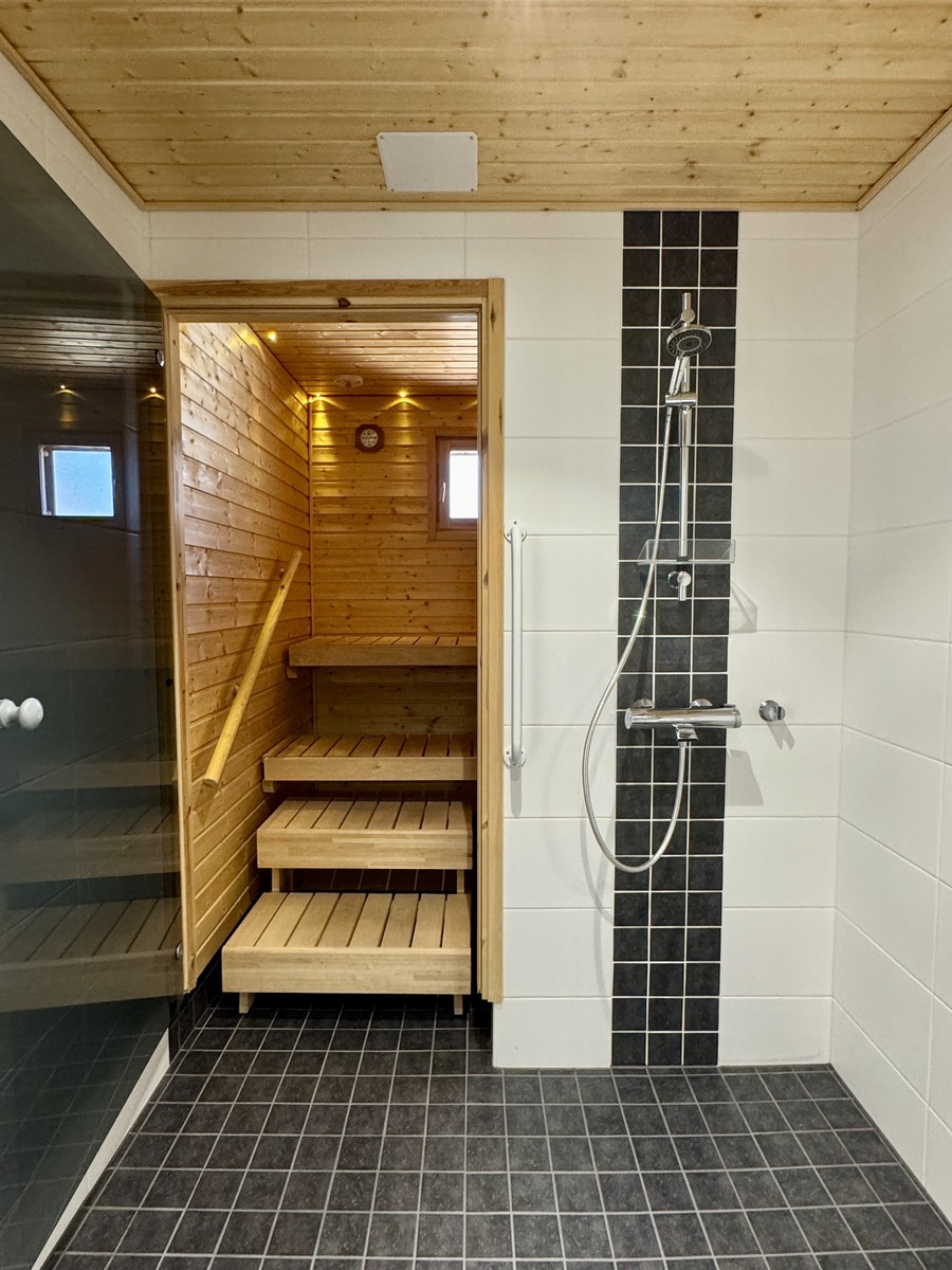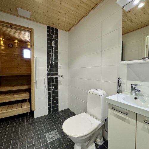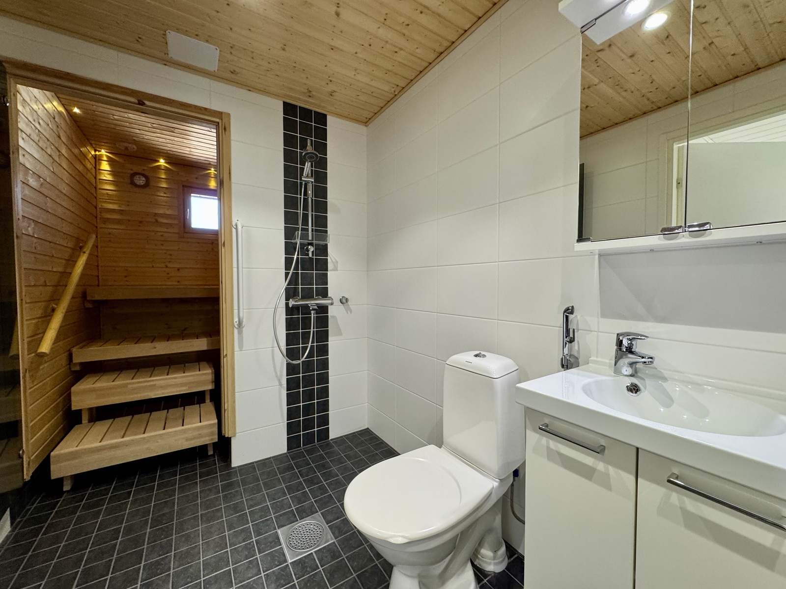 Varusteet: suihkuseinä, lattialämmitys, wc-istuin, suihku, peilikaappi, kiinteät valaisimet, kylpyhuonekaapisto