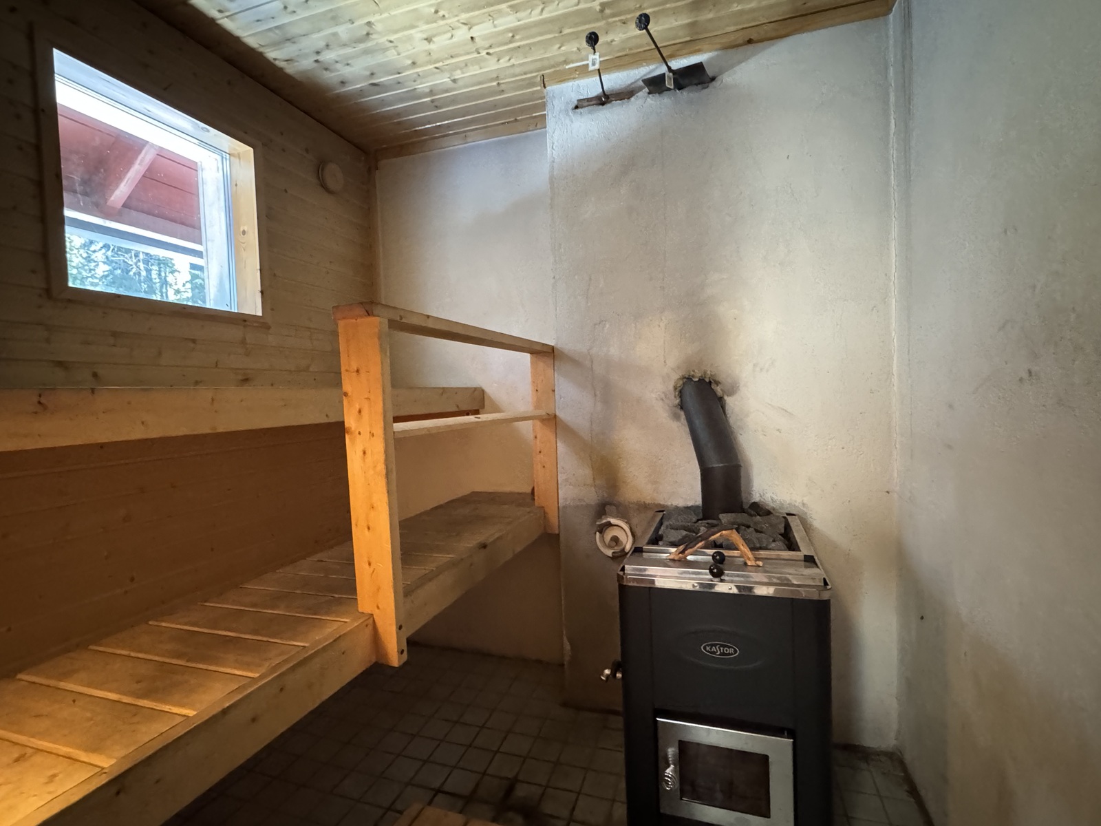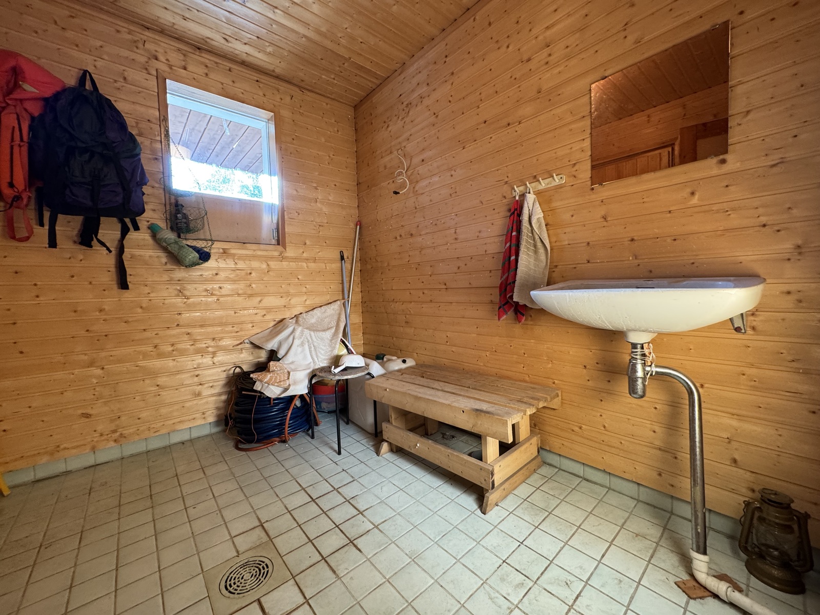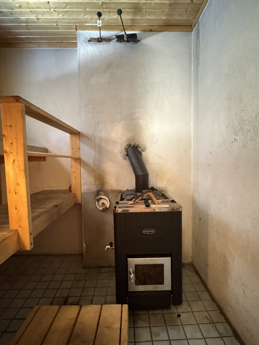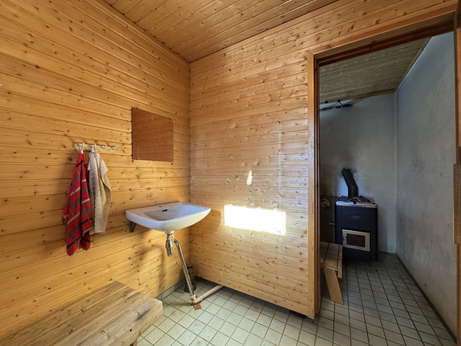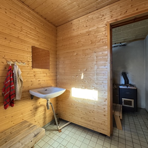 Puukiuasosa laatoista haljennut ja silikonisaumat ratkeilleet. Sauna ja pesuhuone vaativat remontoinnin.