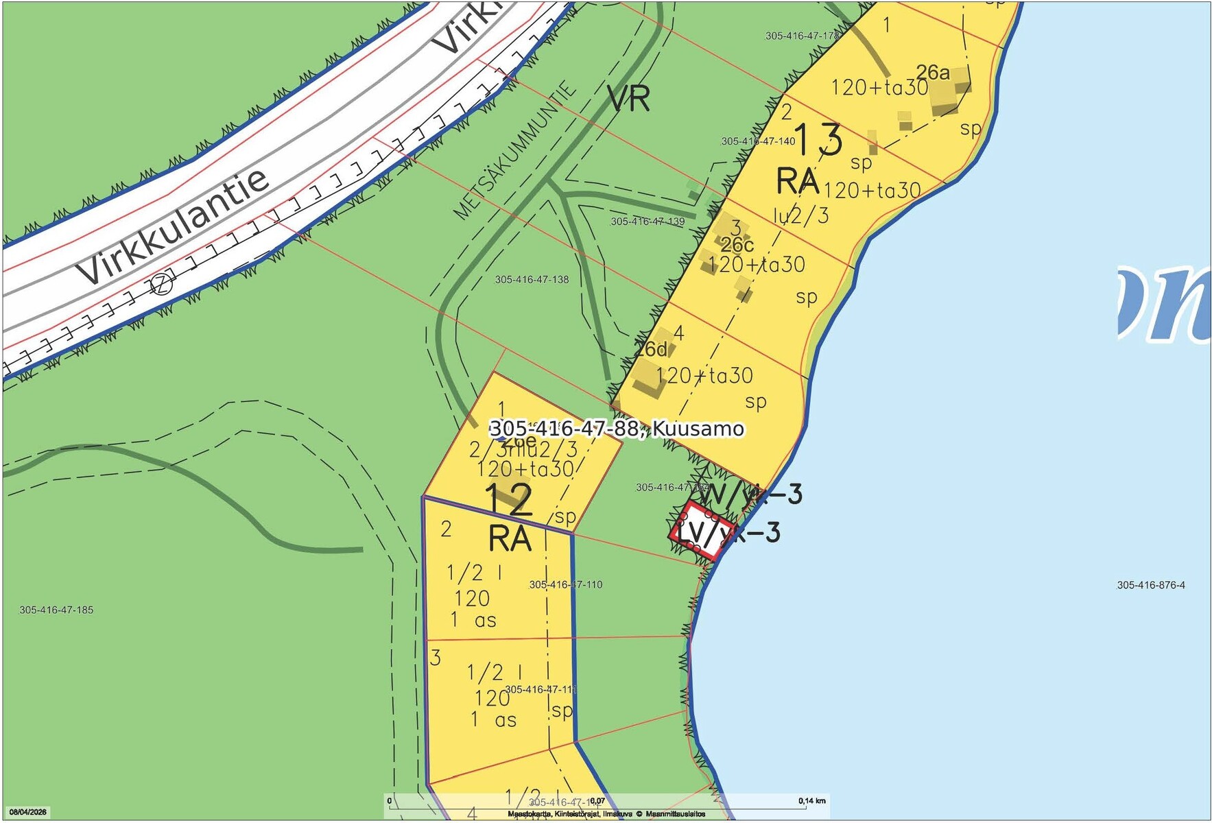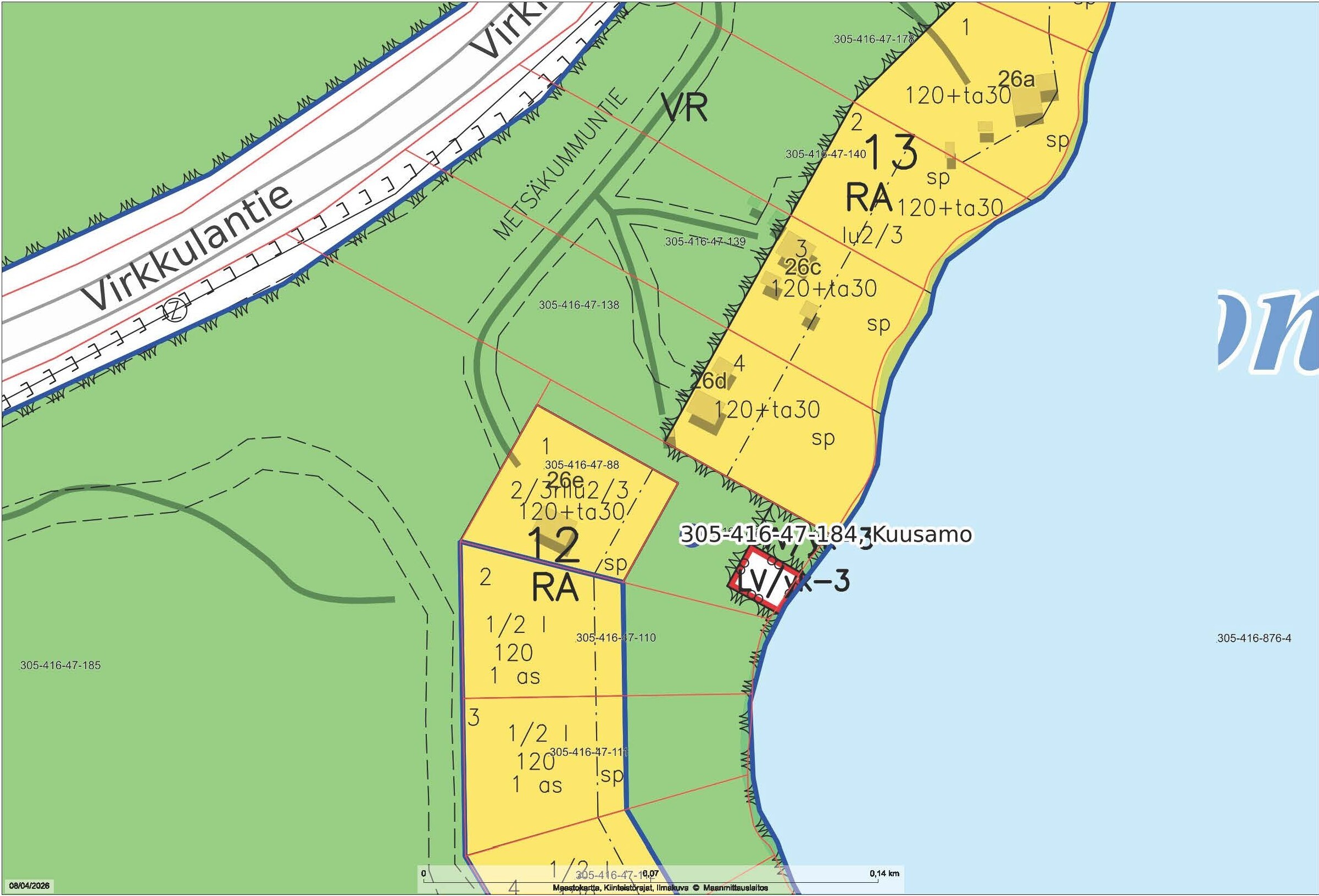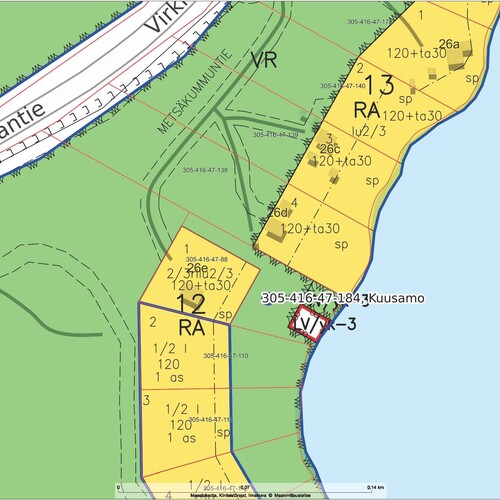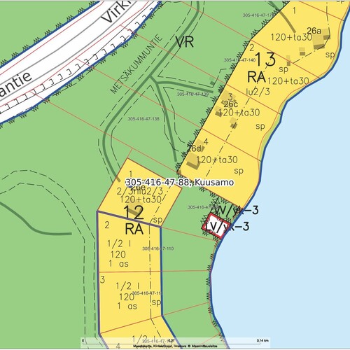 RA (loma-asuntojen korttelialue), lisäksi VR retkeily- ja ulkoilualue, sp, VV/yk-3 ja LV/yk-3 (uimaranta ja venevalkama; alue tarkoitettu korttelin 12 yhteiskäyttöön)