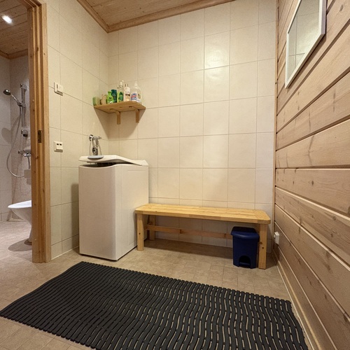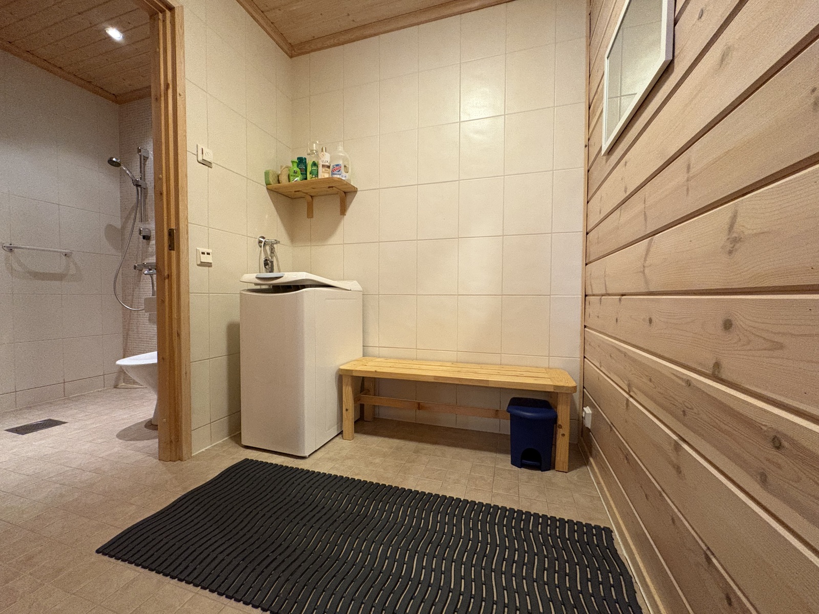 Kylpyhuoneen kuvaus Varusteet: pesukone, lattialämmitys, wc-istuin, suihku, kiinteät valaisimet