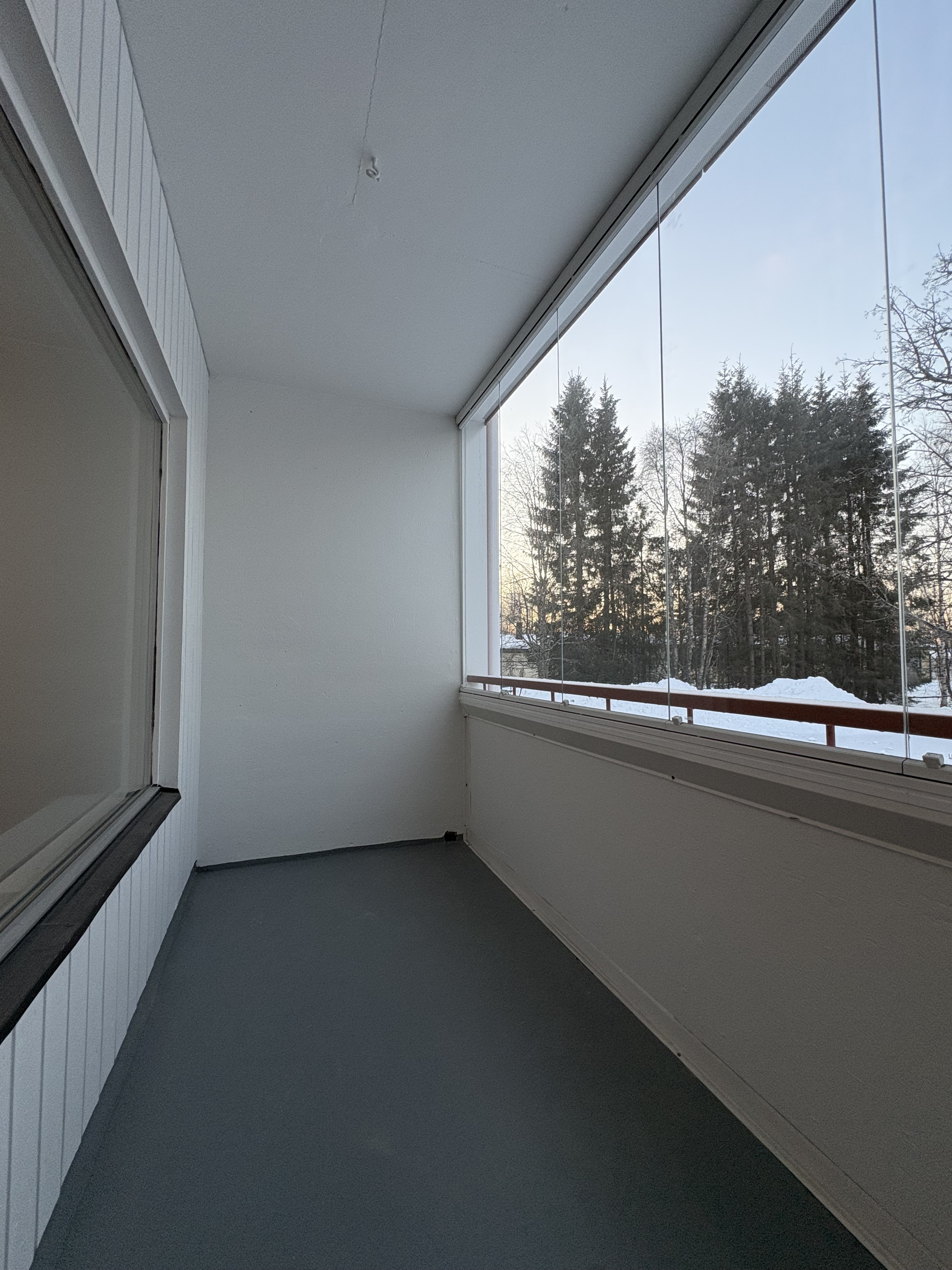 Parvekkeelta rauhallinen maisema taloyhtiön sisäpihalle päin.