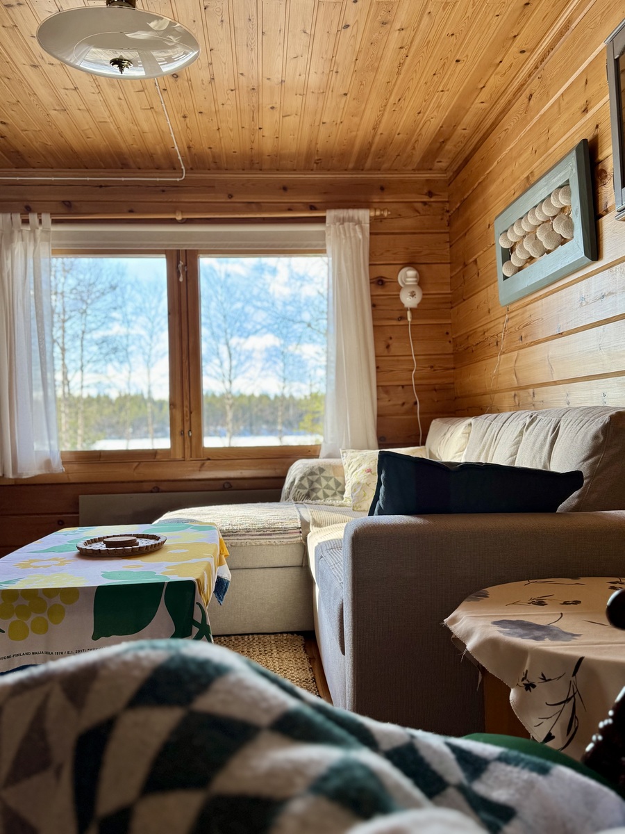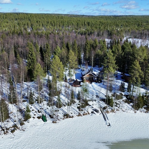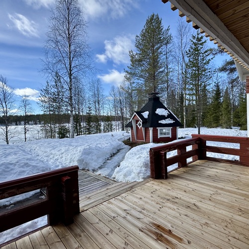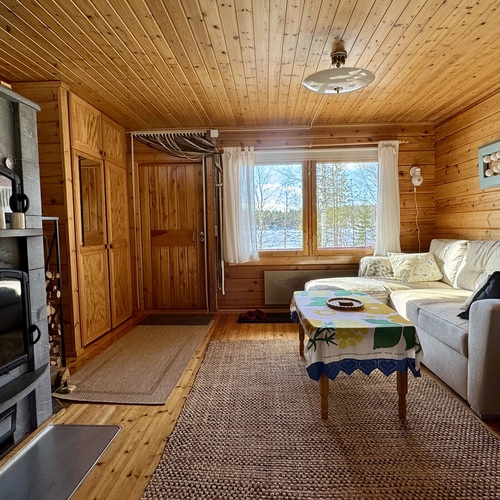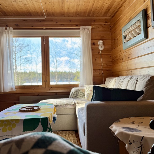 Viihtyisä kompakti sähköistetty Kontiotuotteen hirsimökki Saapunkijärven rannalla, vain 10 km Kuusamon keskustasta.