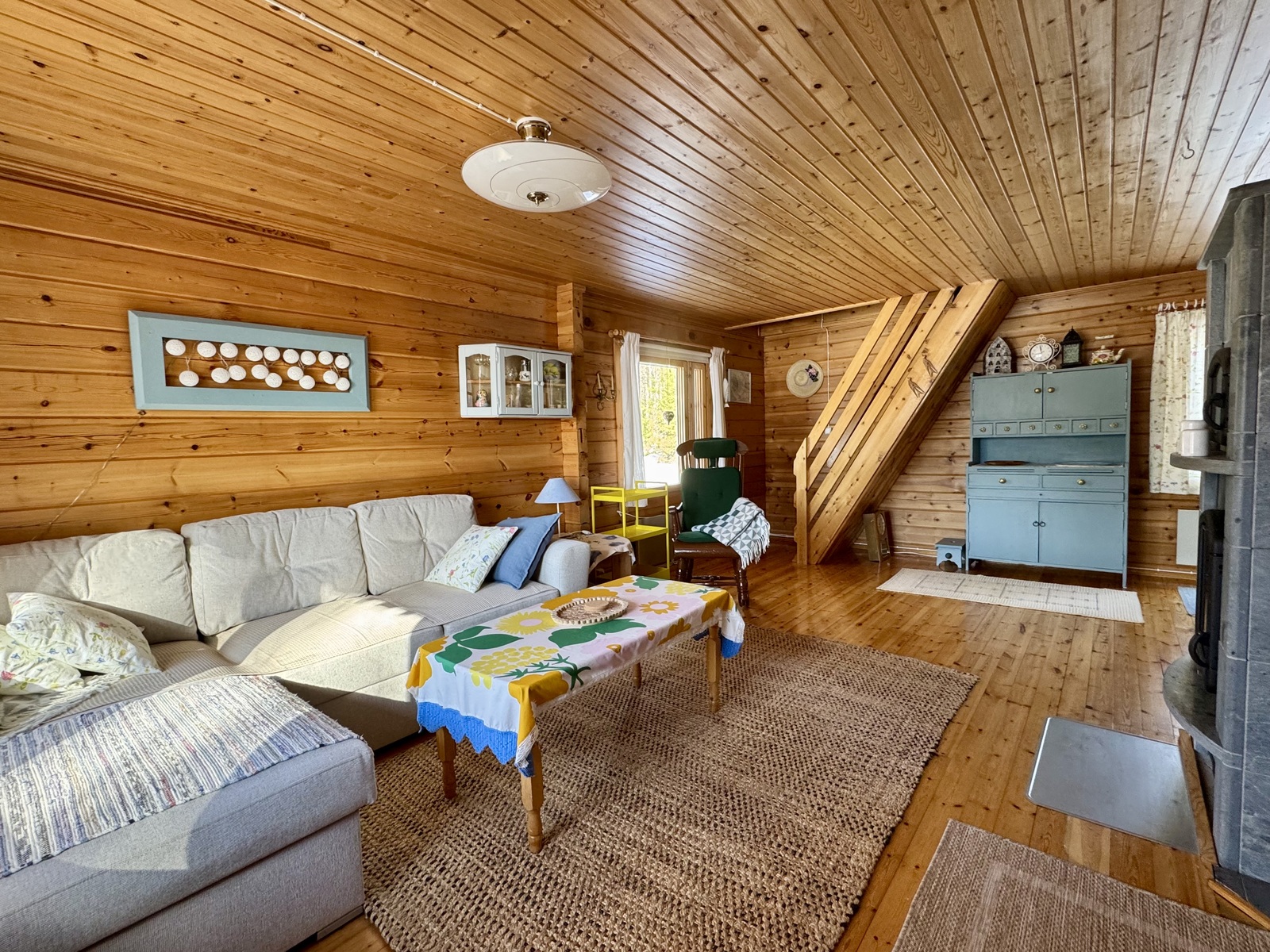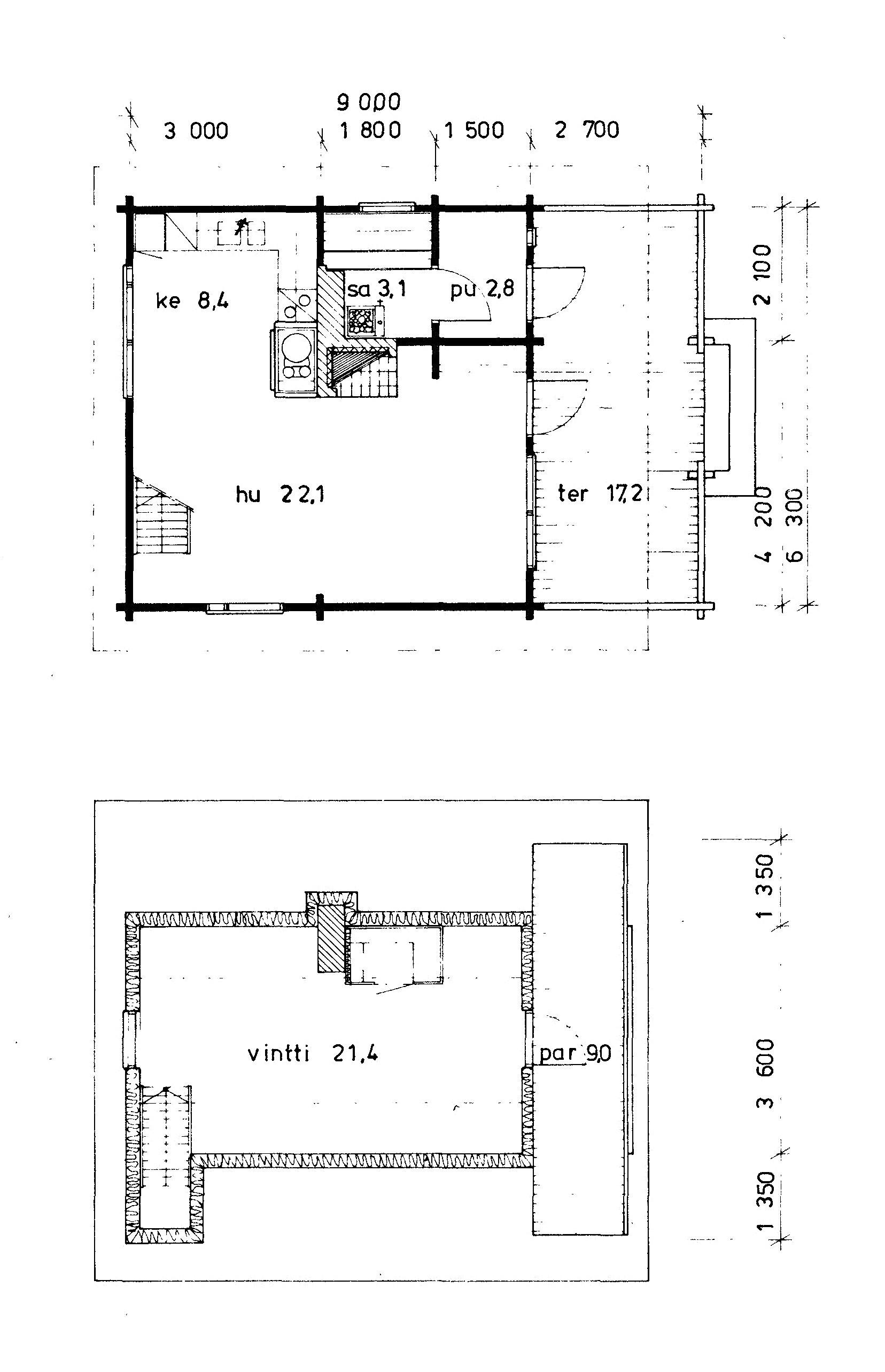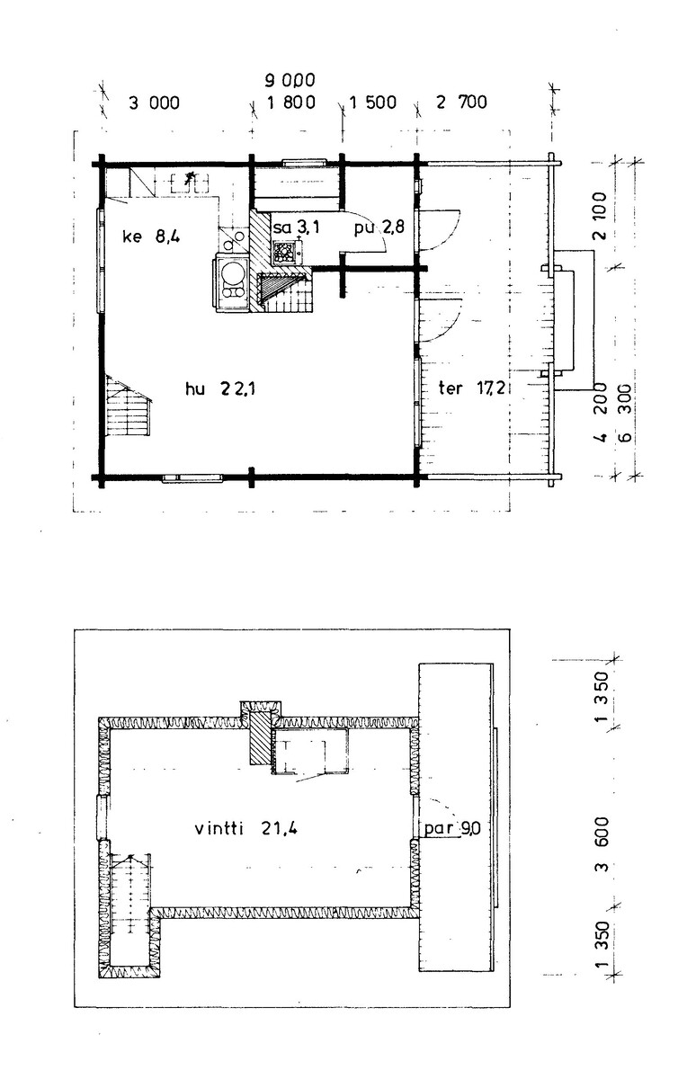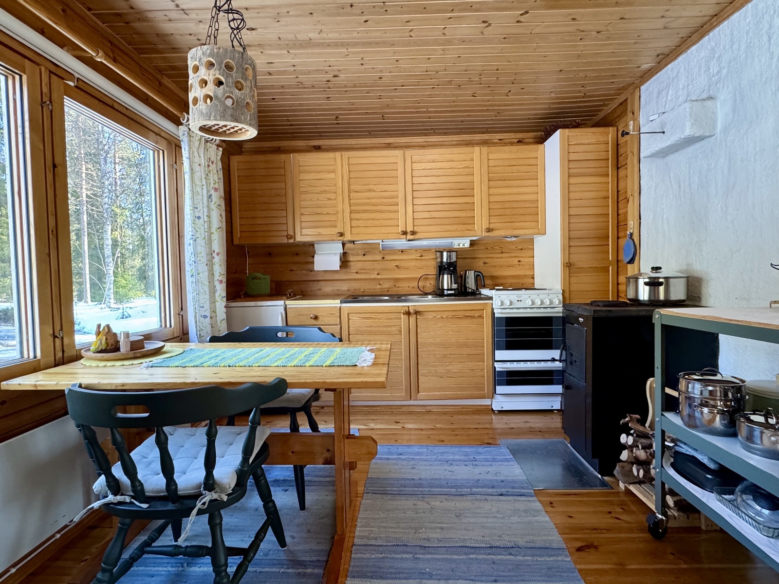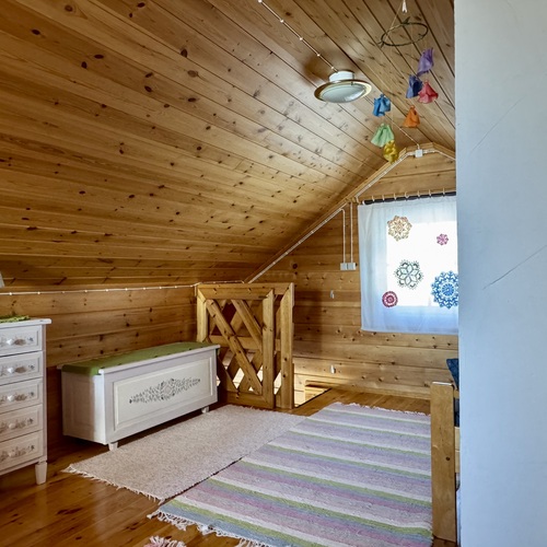 Alakerrassa tupakeittiö, jossa takka-leivinuuni. Parvella nukkumapaikat neljälle.
