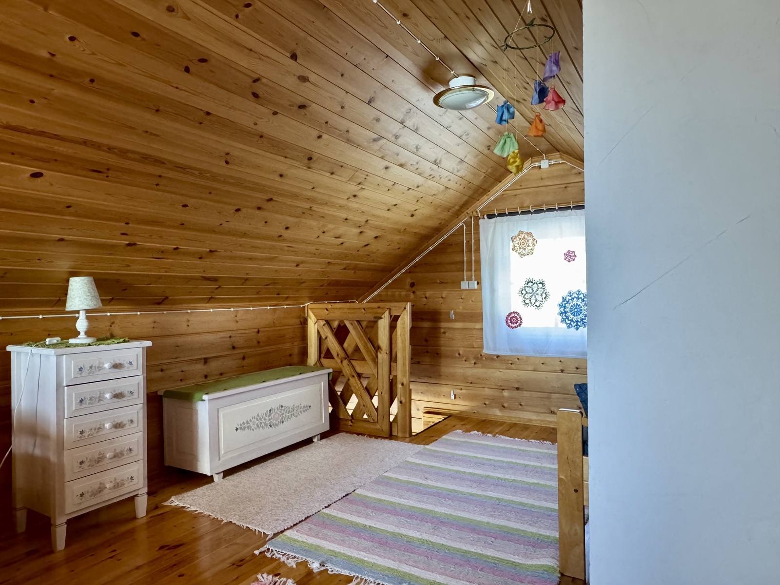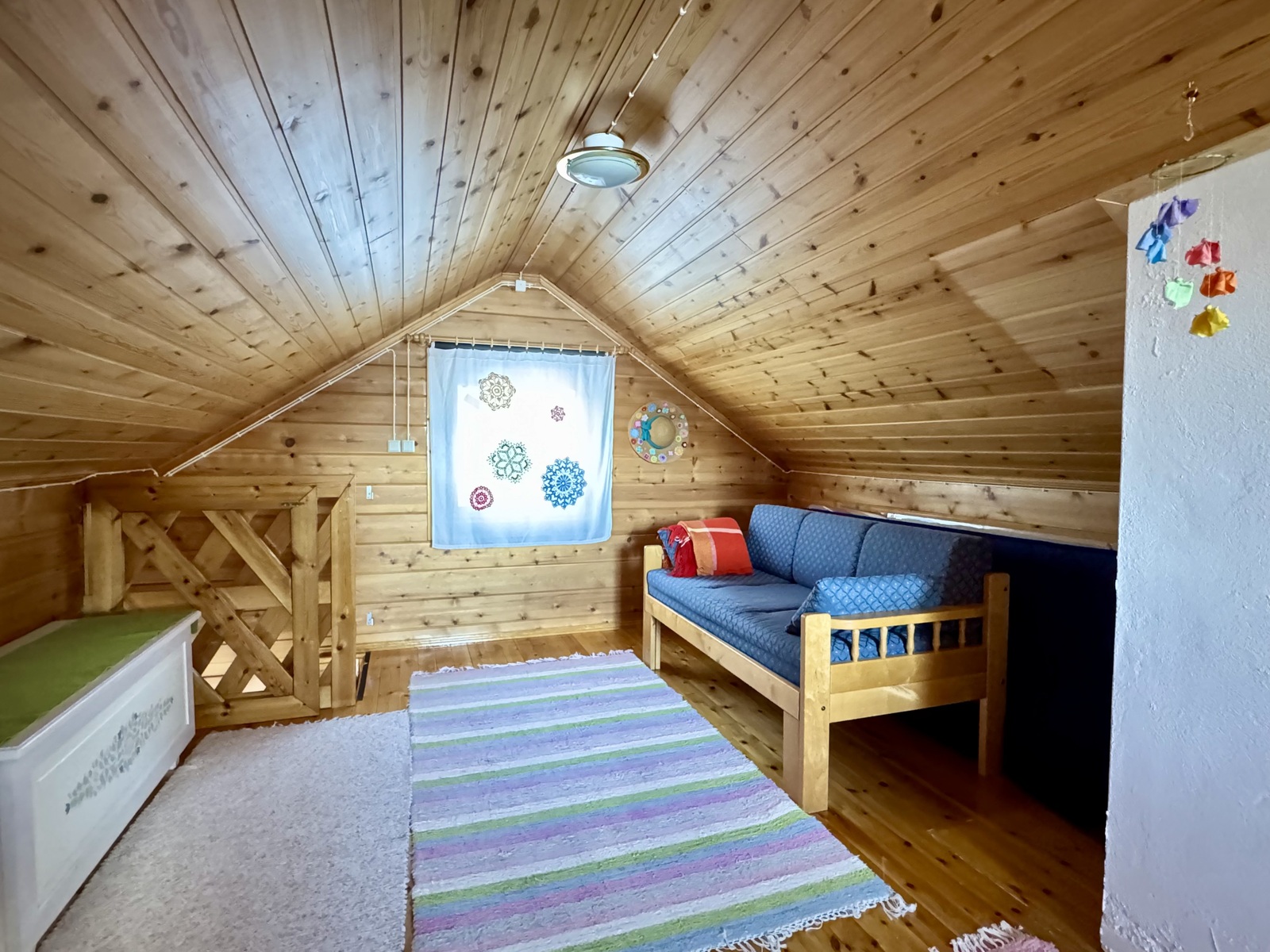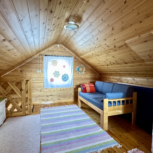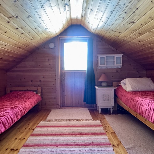 Parven sängyt ja soutuvene.