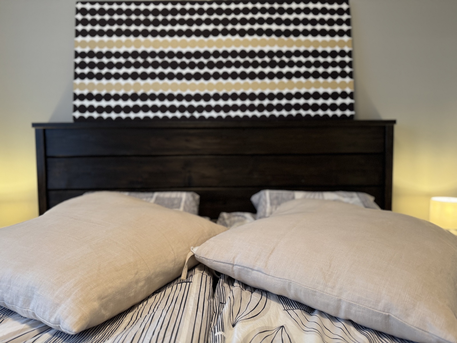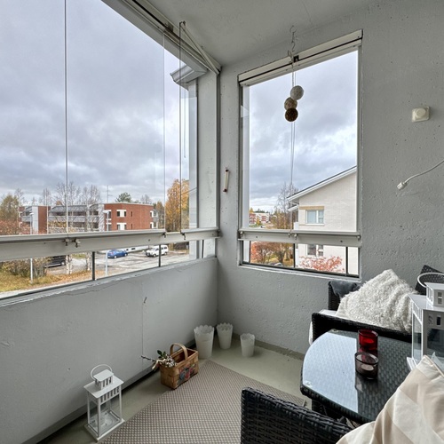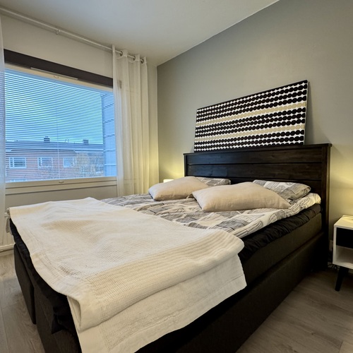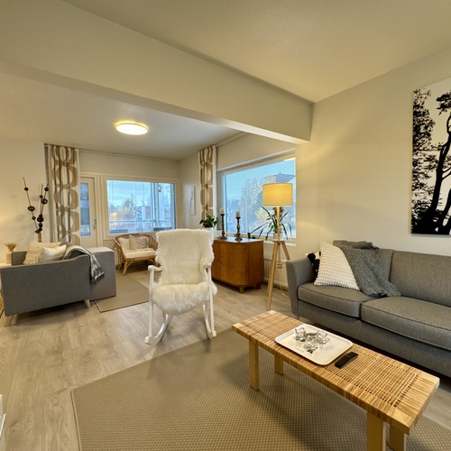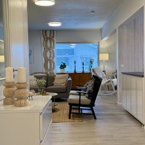 Makuuhuoneita kaksi, joista toisesta väliseinä poistettu ja yhdistetty olohuoneeseen
