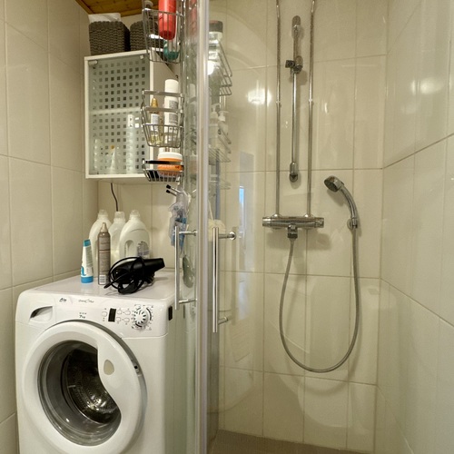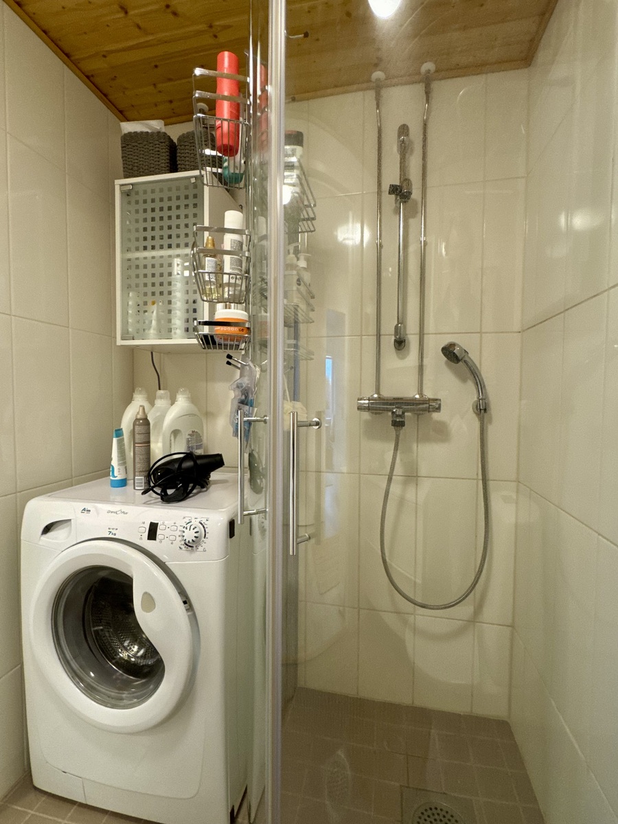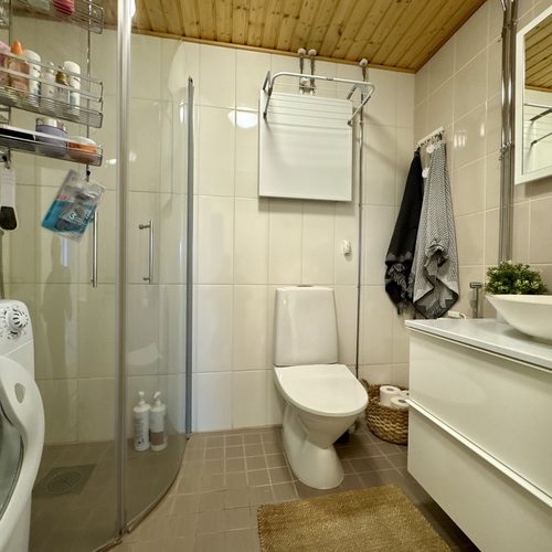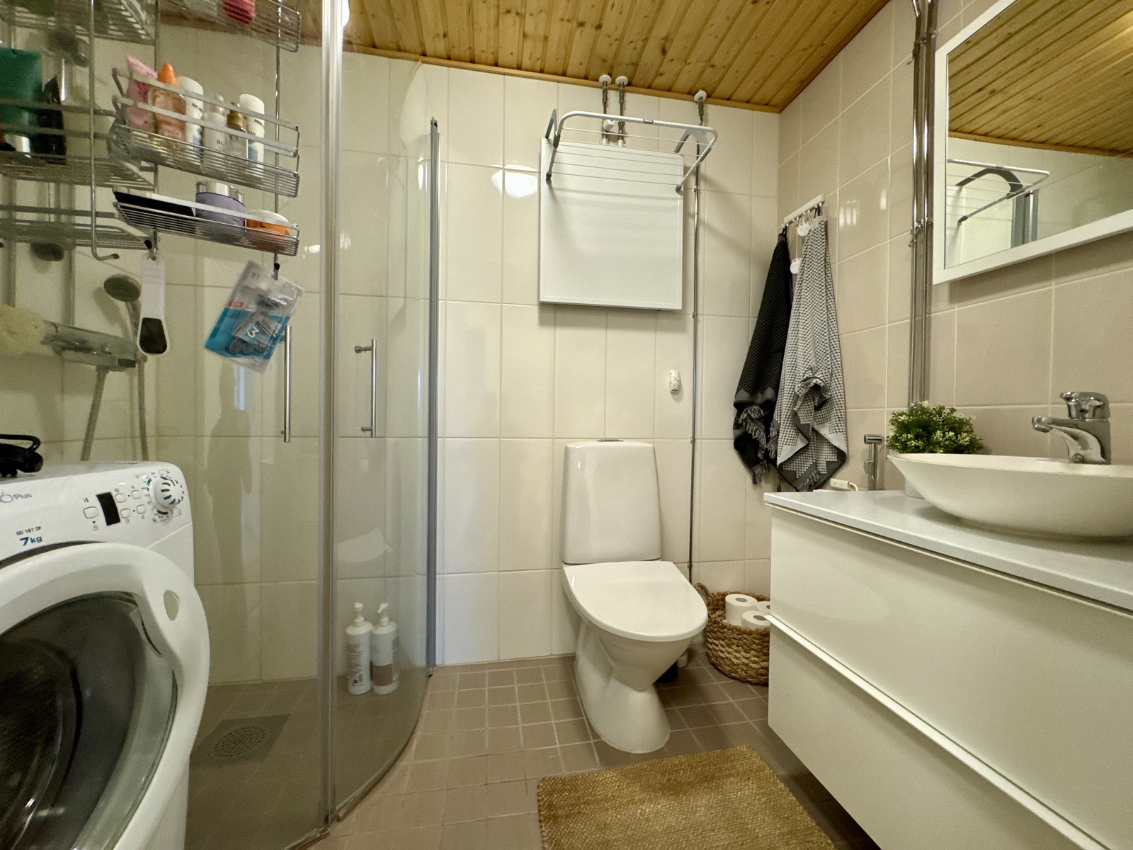 Varusteet: suihkukaappi, pesukoneliitäntä, lattialämmitys, wc-istuin, suihku, peili, kiinteät valaisimet