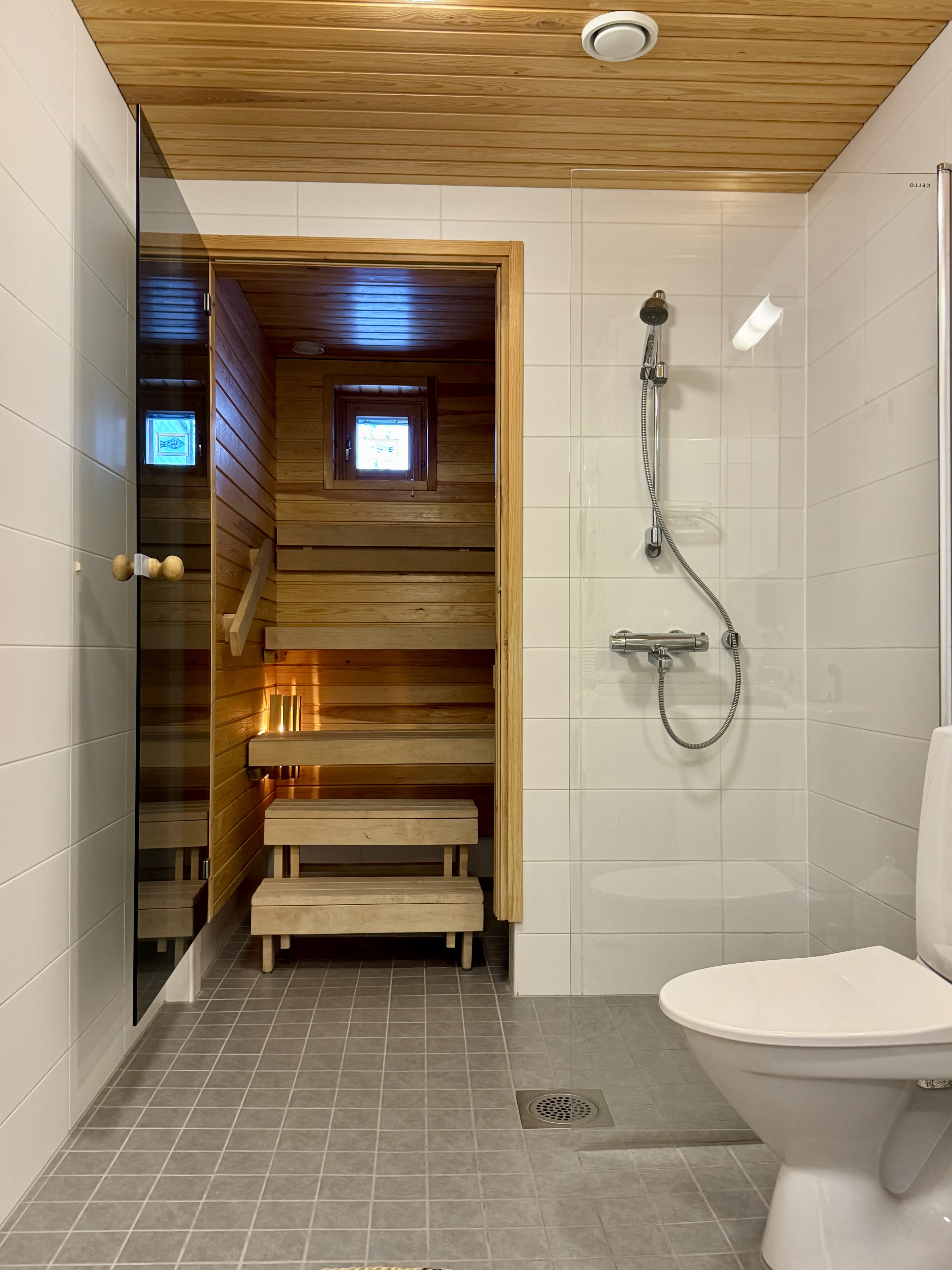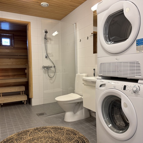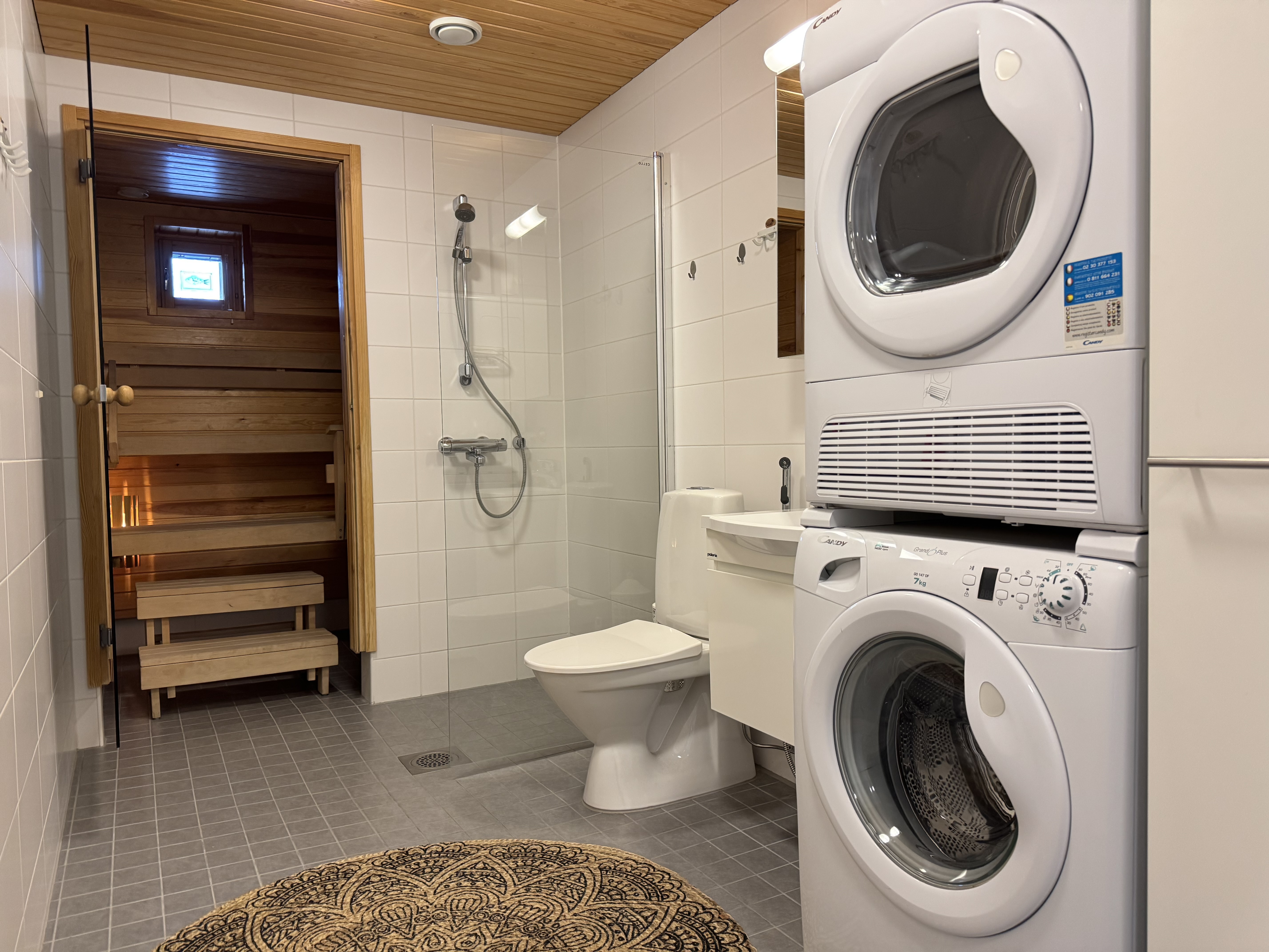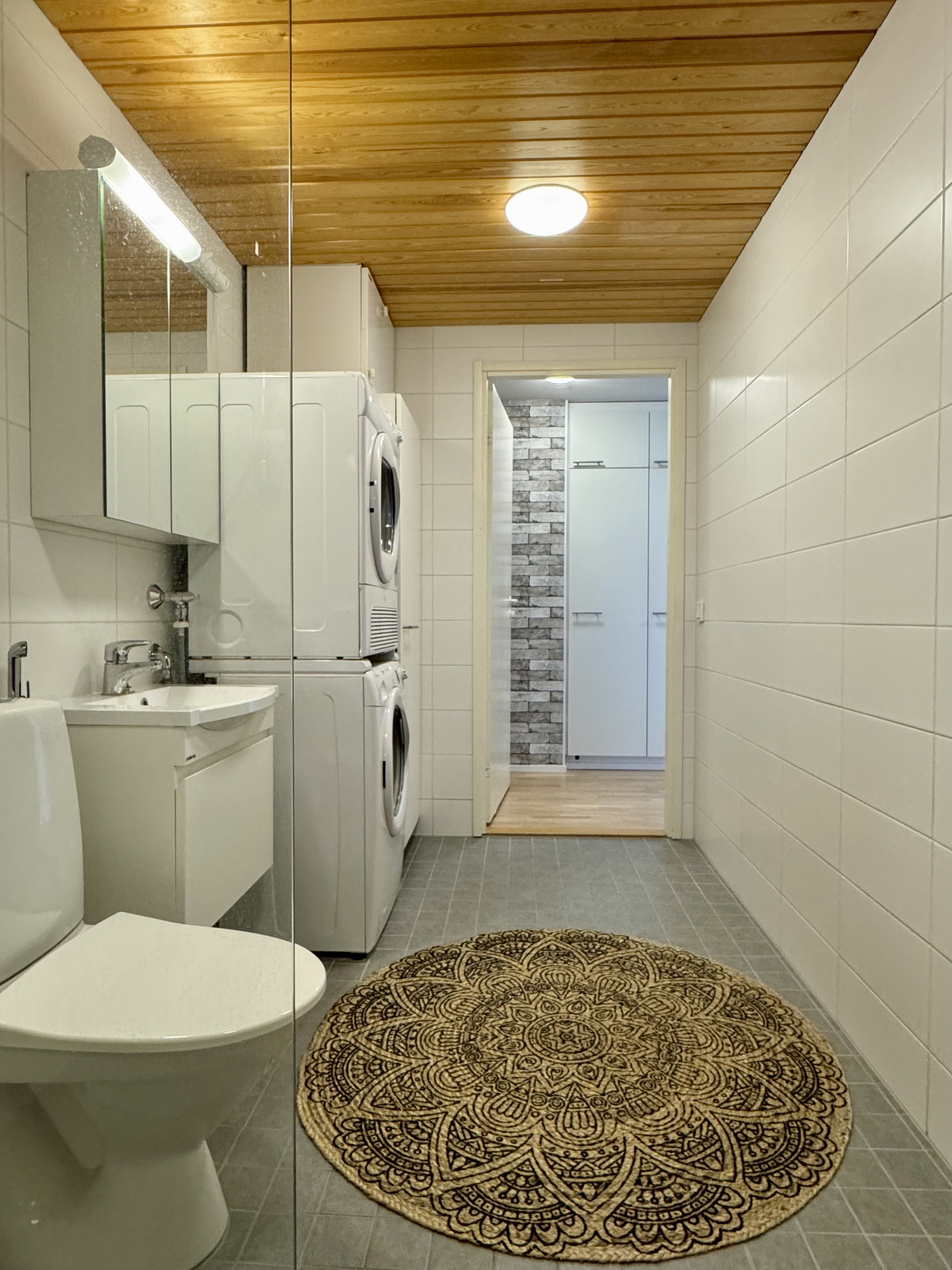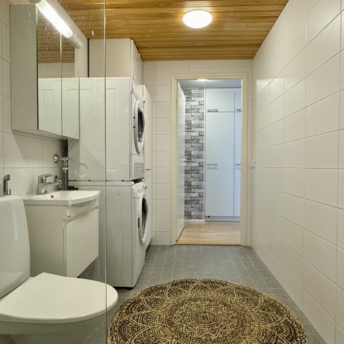 Varusteet: pesukone, kuivausrumpu, pesukoneliitäntä, lattialämmitys, wc-istuin, suihku, peilikaappi, kiinteät valaisimet