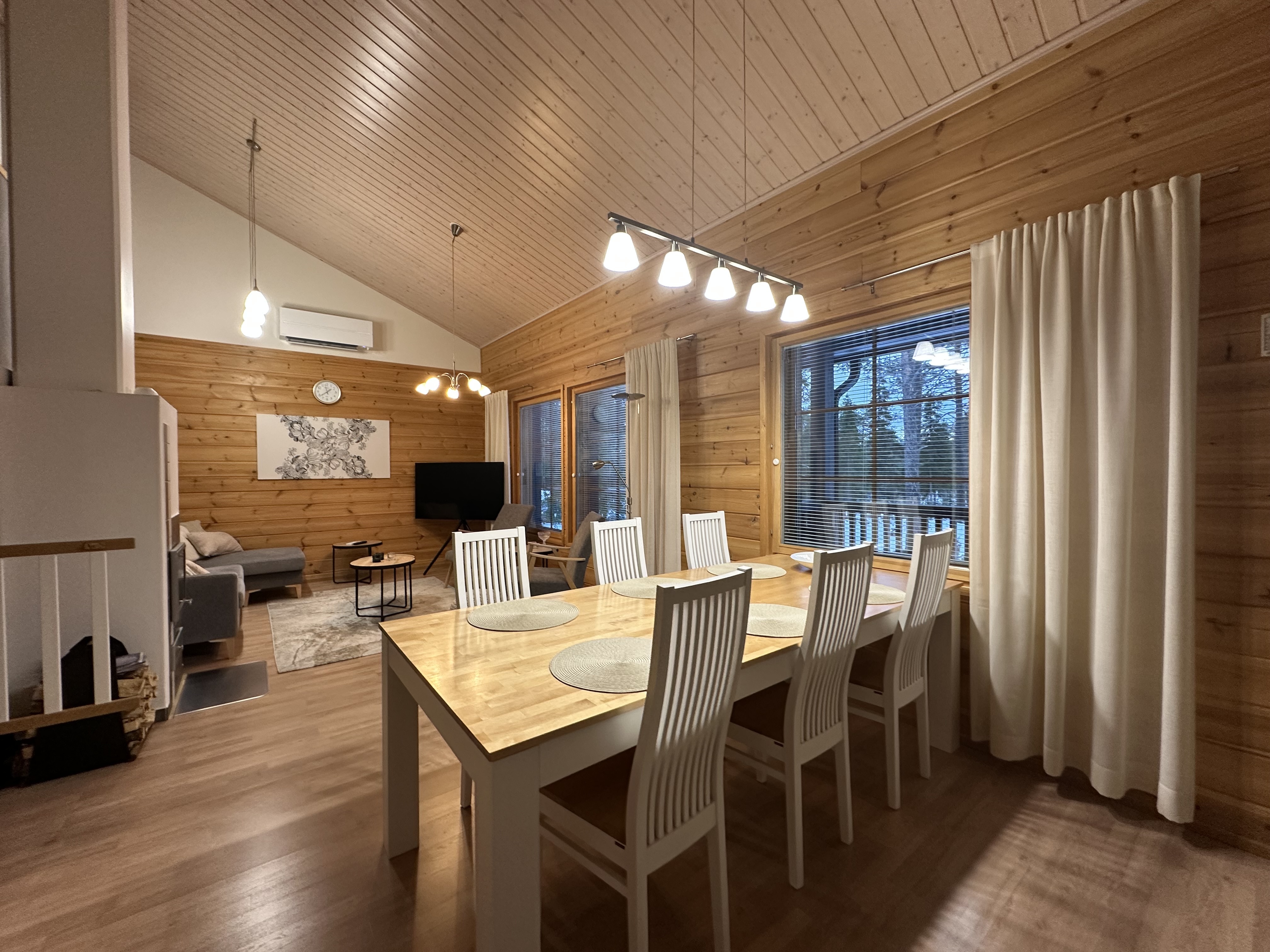 Huoneiston oleskelutilojen ikkunoista näkymät takapihalle ja Rukan Länsi-puolen eturinteille. Terassilta kulku takapihalle ja kodalle. Makuuhuoneiden ikkunoista näkymät paritalon etupihalle ja parkkipaikoille.