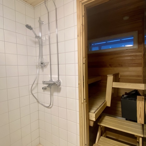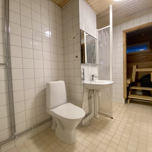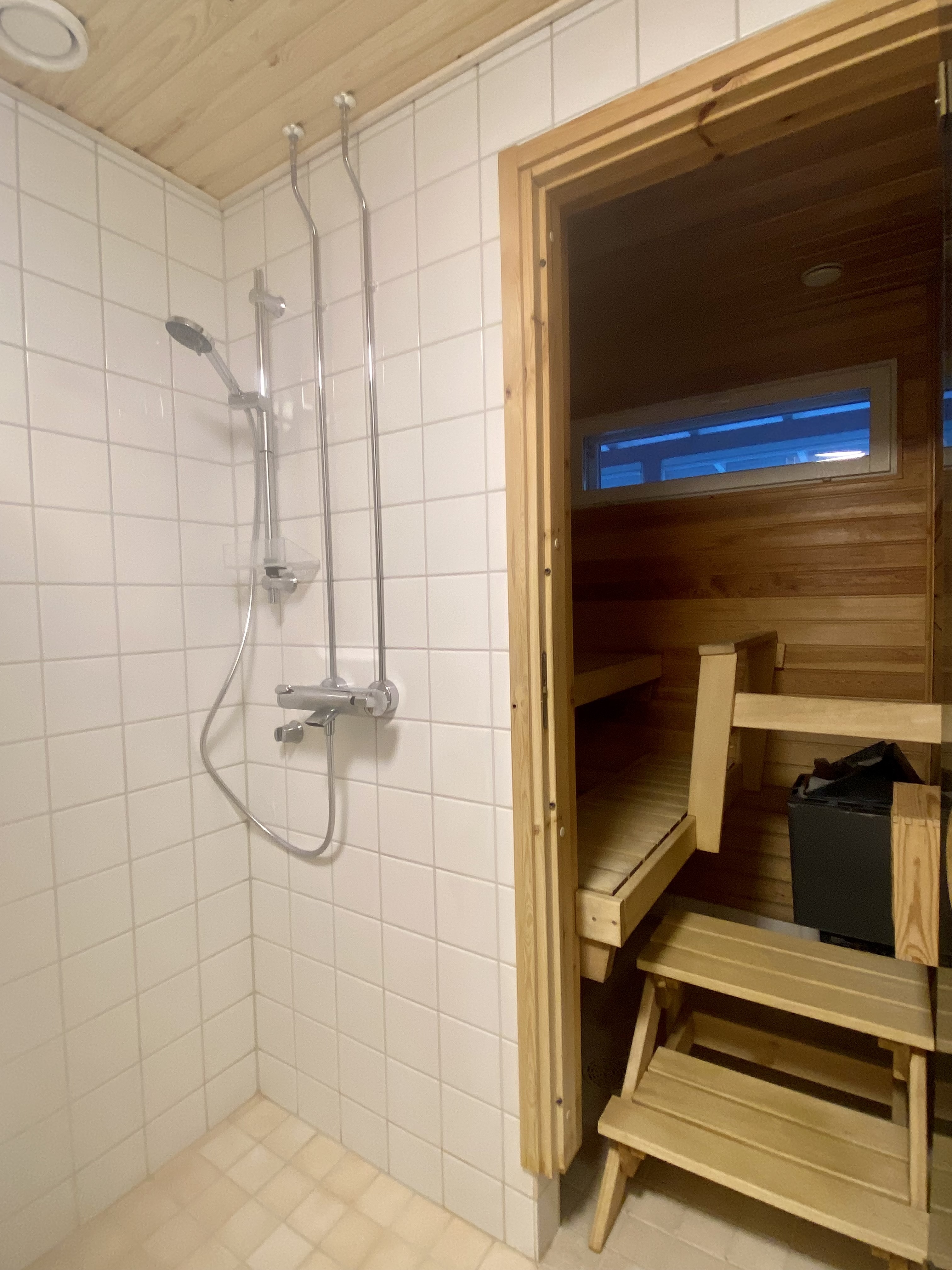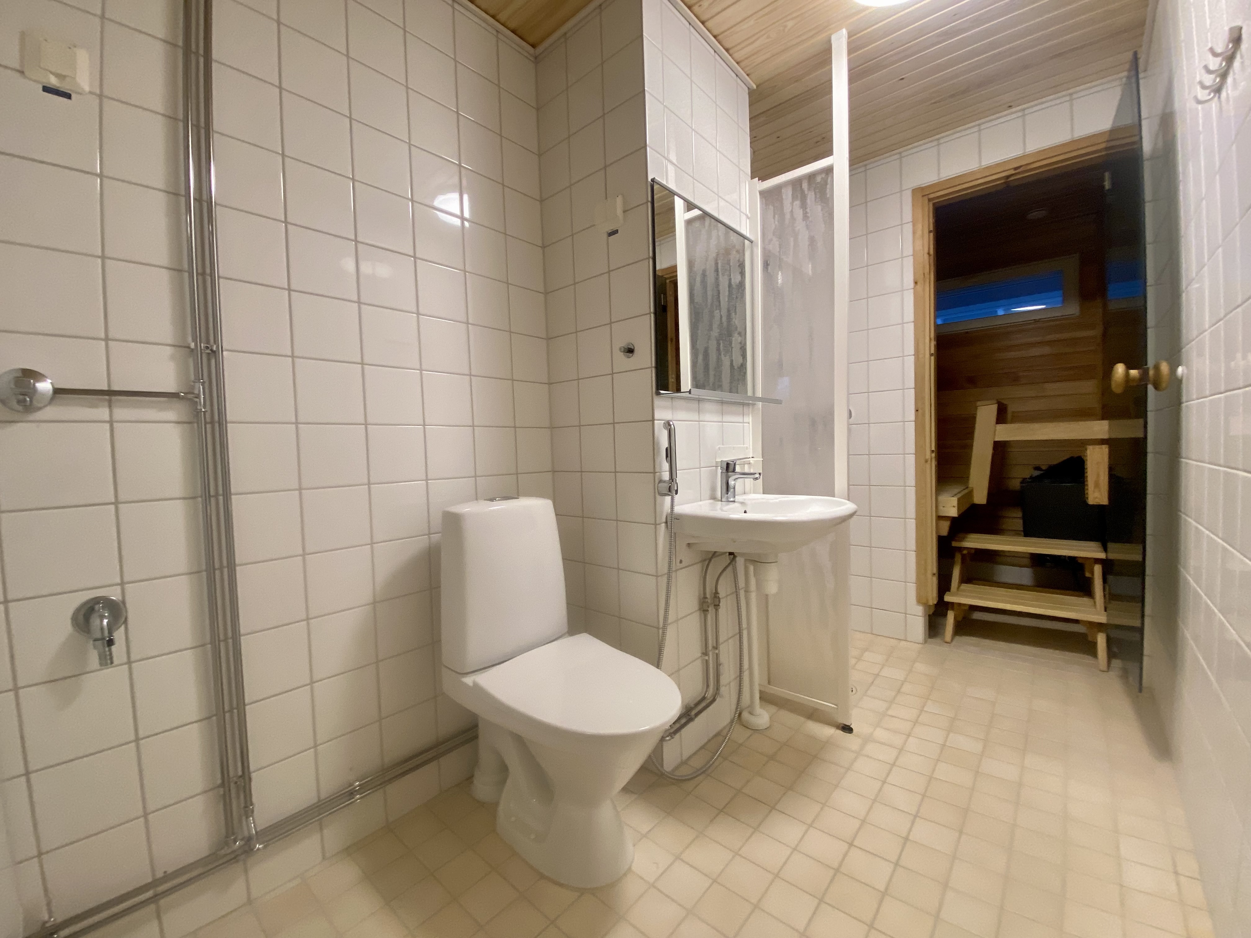 Varusteet: suihkuseinä, lattialämmitys, wc-istuin, suihku, peili, kiinteät valaisimet