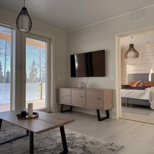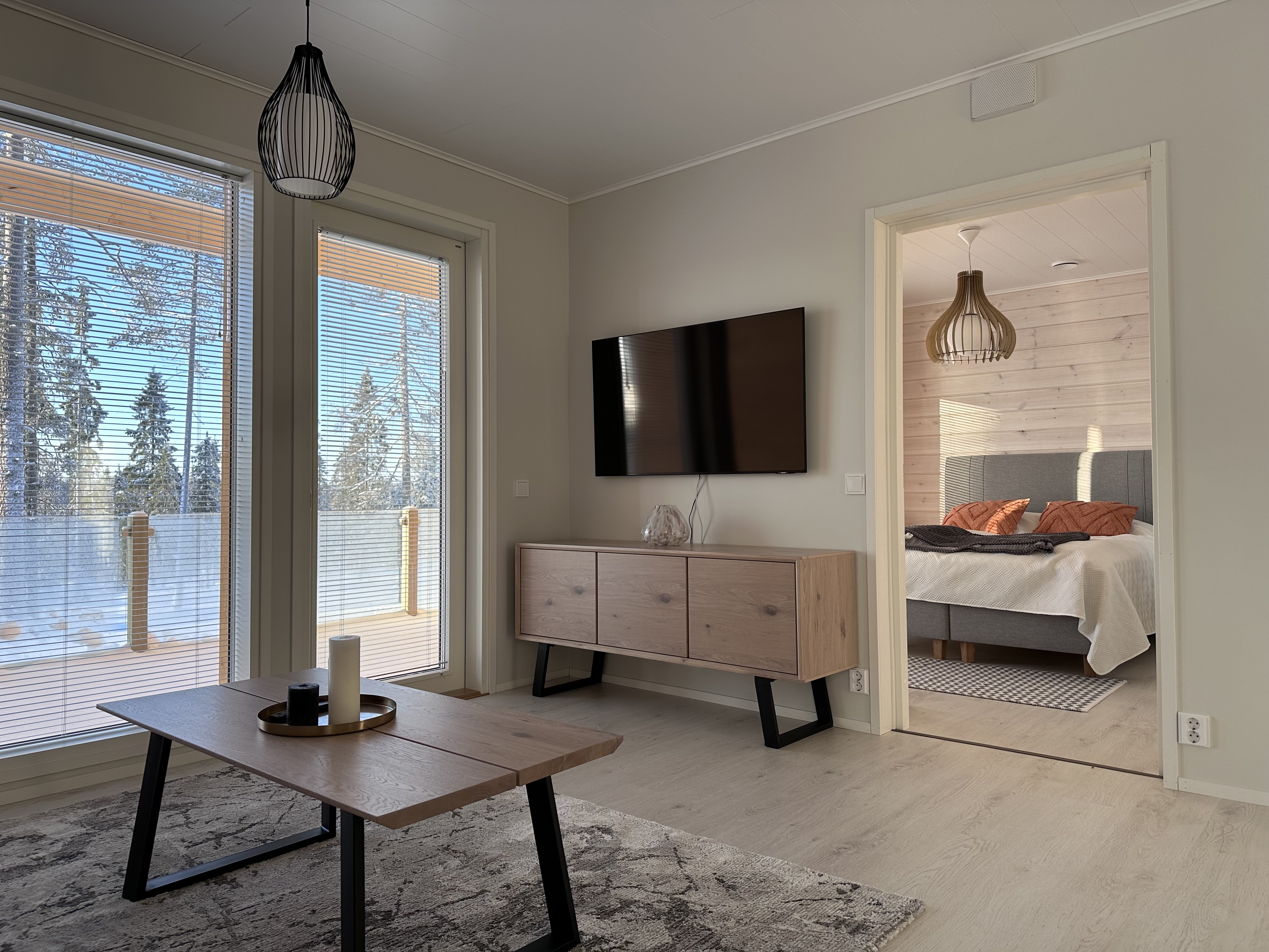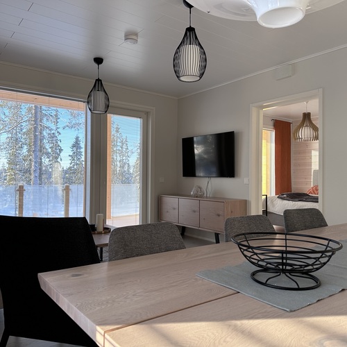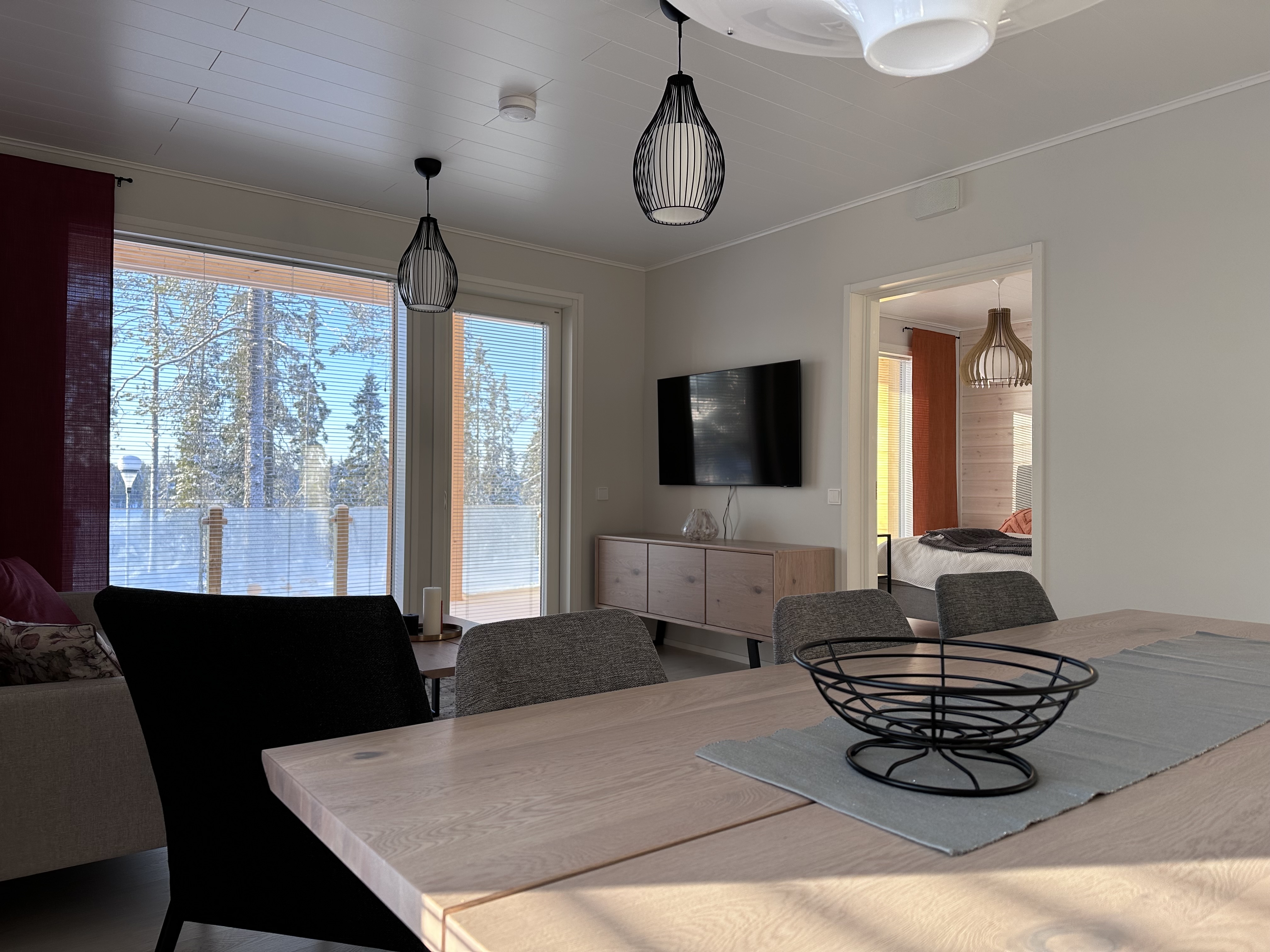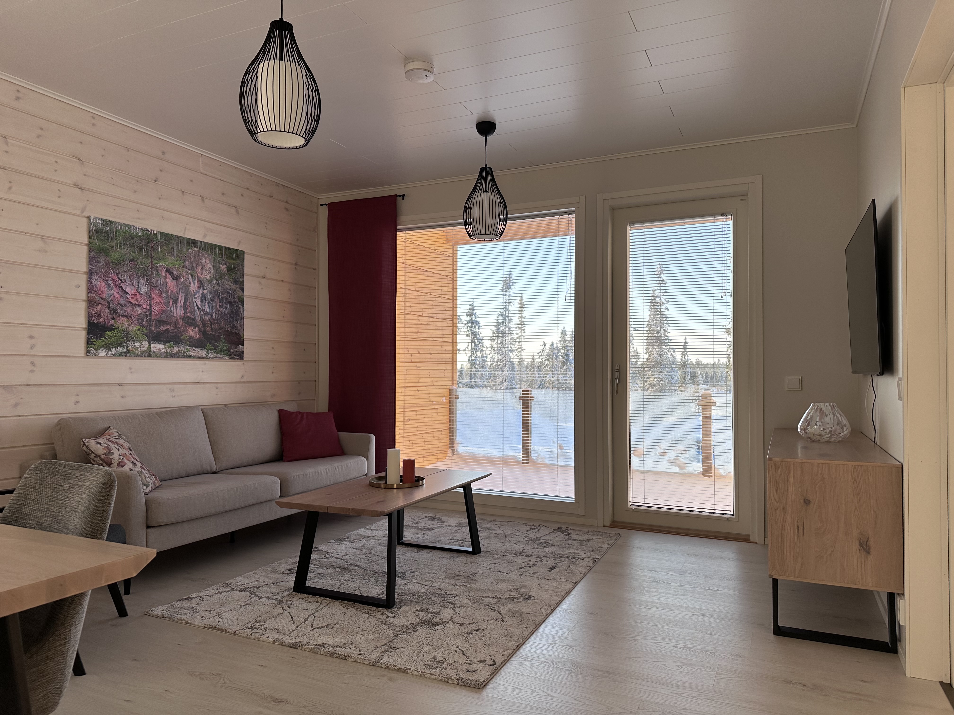 Tämän modernin vapaa-ajan asunnon sydämenä toimii olohuoneen, keittiön ja ruokailutilan muodostama avara kokonaisuus. Tilan suurista ikkunoista säteilee upeasti valoa sisään ja vuodenaikojen mukaan vaihtuvat maisemat maalaavat kuvankauniisti maiseman. Yhtenäinen avoin tila mahdollistaa kokkailun modernissa ja hyvin varustetussa keittiössä samalla perheen ja ystävien kanssa seurustellen. Kolme makuuhuonetta, joista suurimman yhteydessä pesuhuone wc:llä, joten täällä lomailee suurempikin seurue. Upeassa kahdella suihkulla varustetussa kylpyhuoneessa kelpaa rentoutua päivän päätteeksi. Kodinhoitohuone tarjoaa erinomaisesti tilaa vaatehuollolle.
