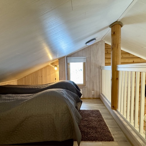 Saunatiloista käynti suoraan terassille. Parvella noin 6 m² yli 160 cm tilaa, jossa makuupaikat 4 henkilölle. Erillinen ulkovarasto suksille ja polttopuille.