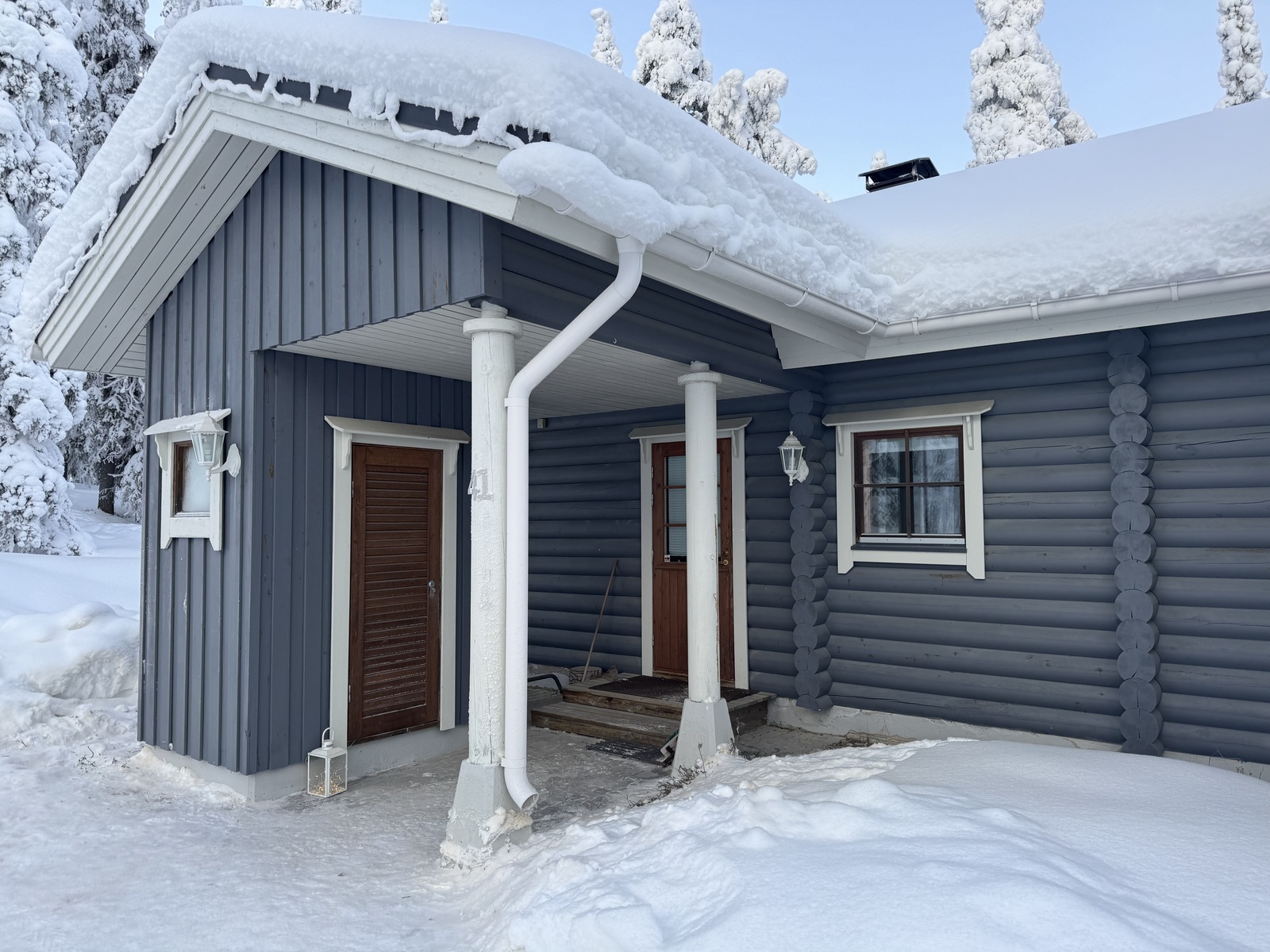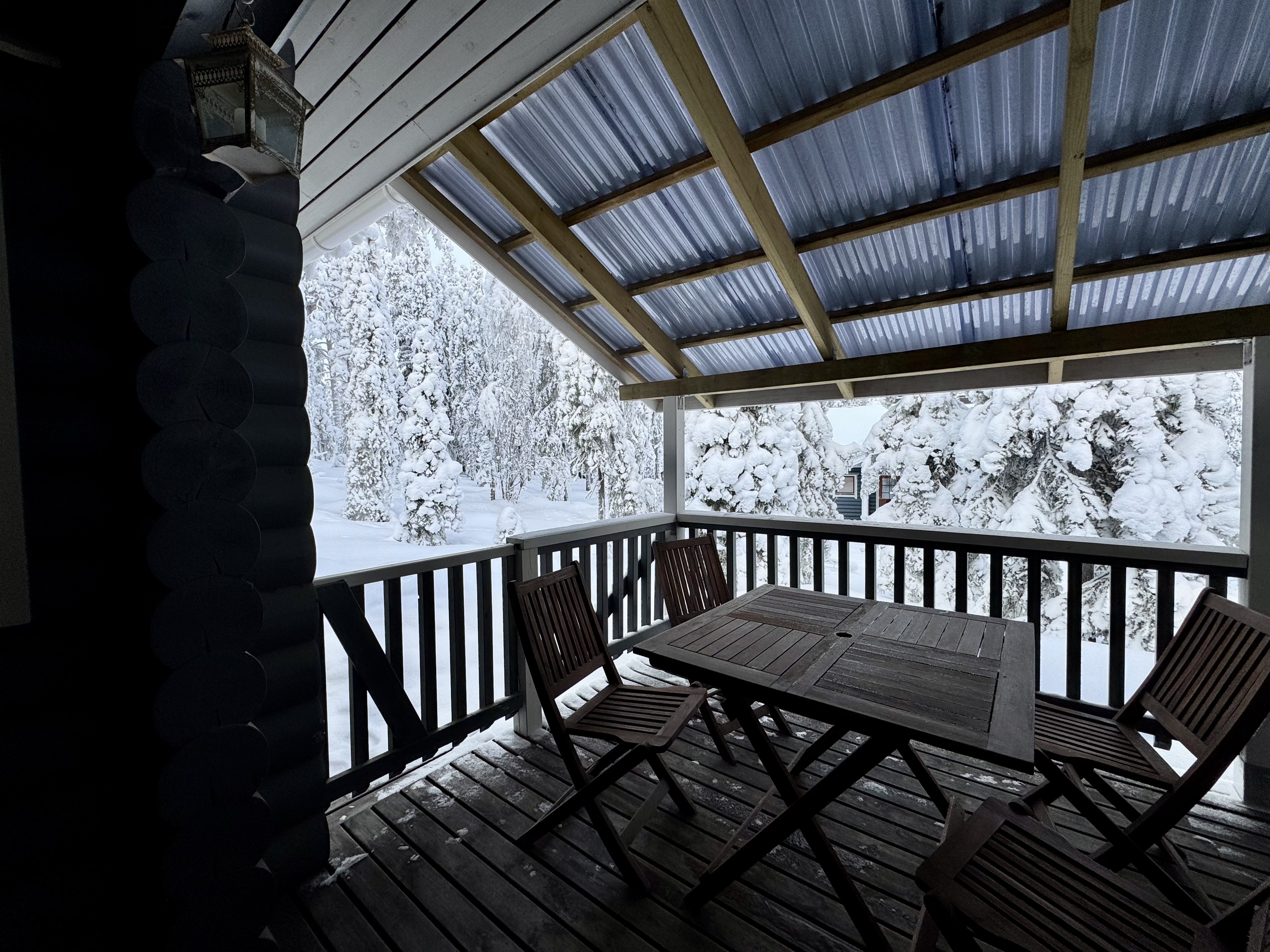 Erillinen ulkovarasto suksille ja polttopuille.