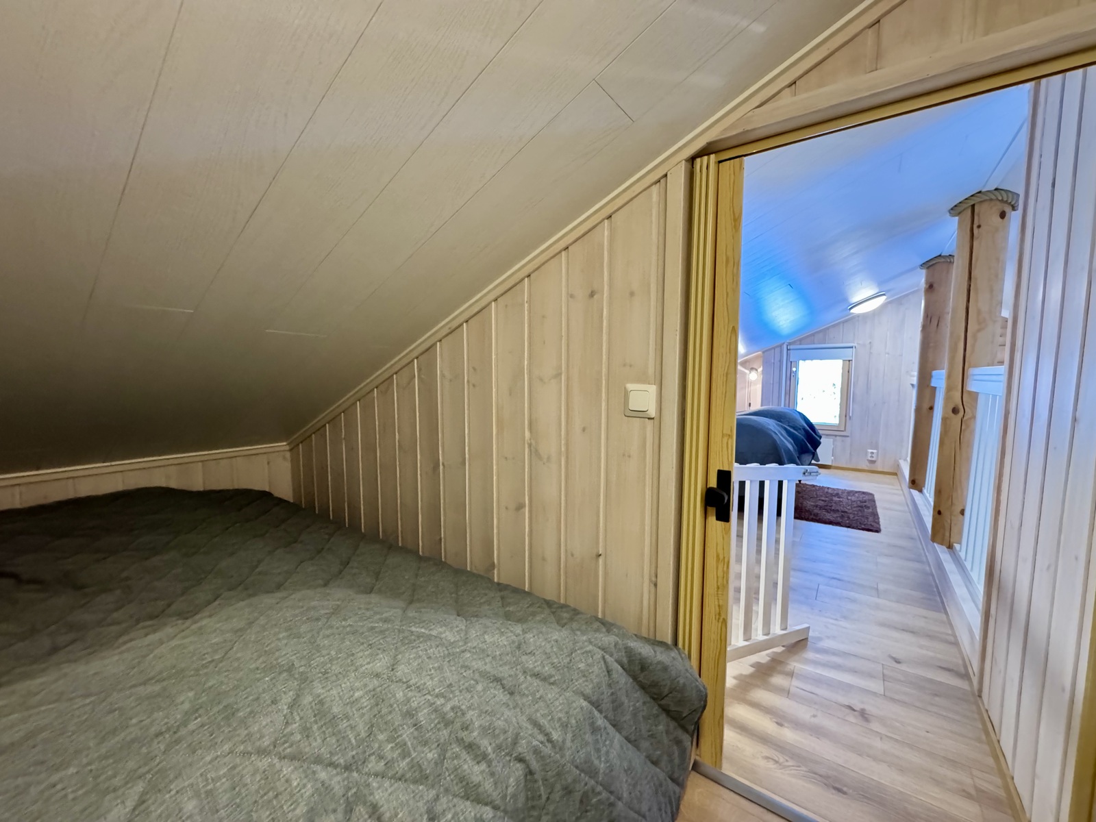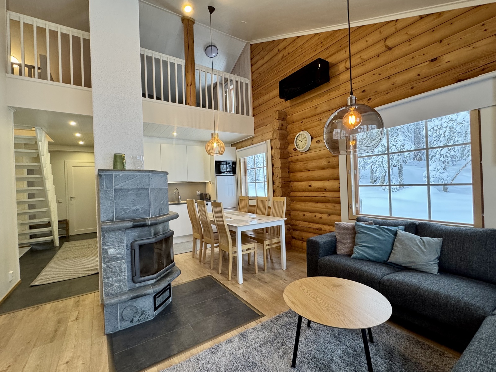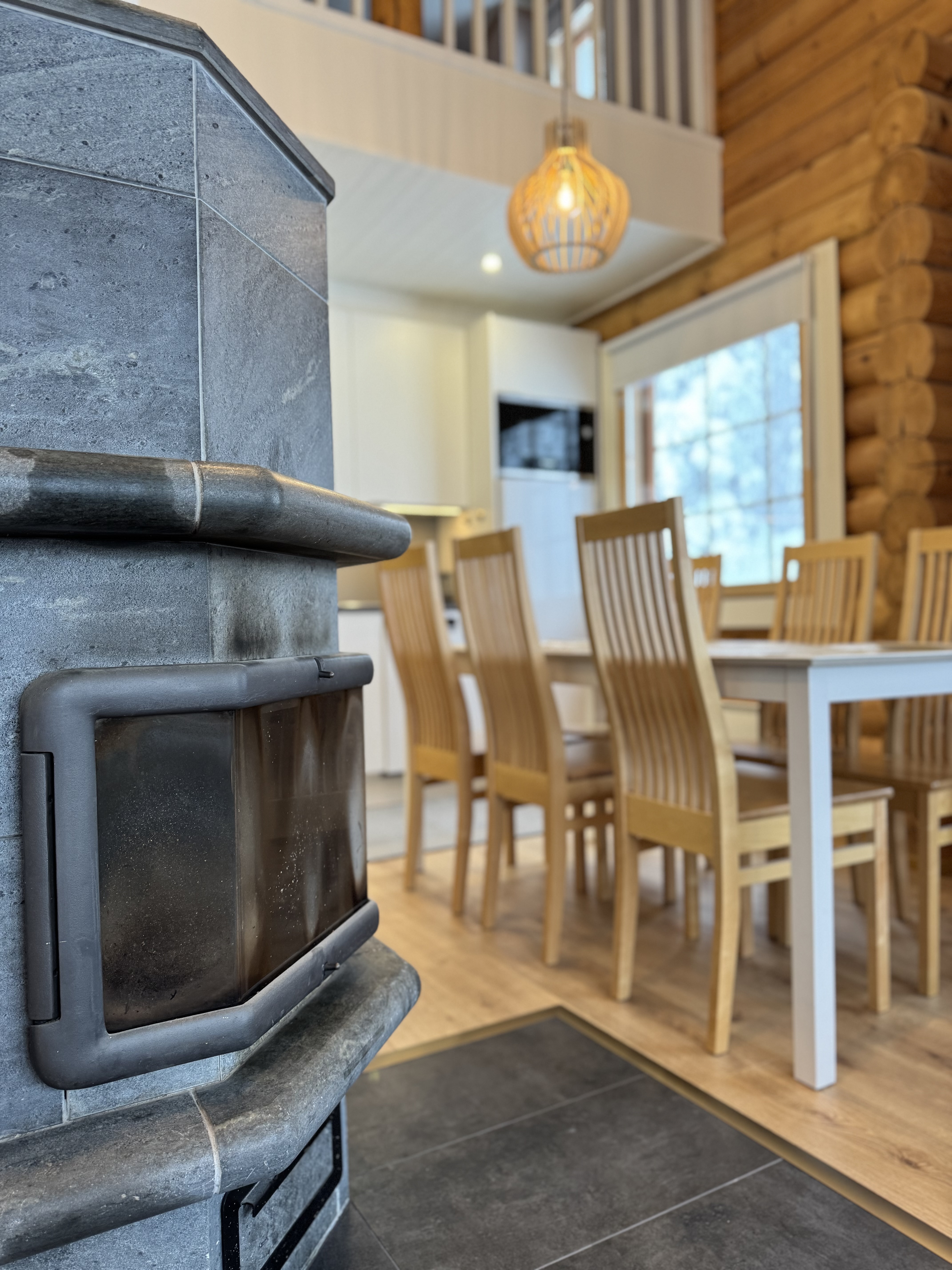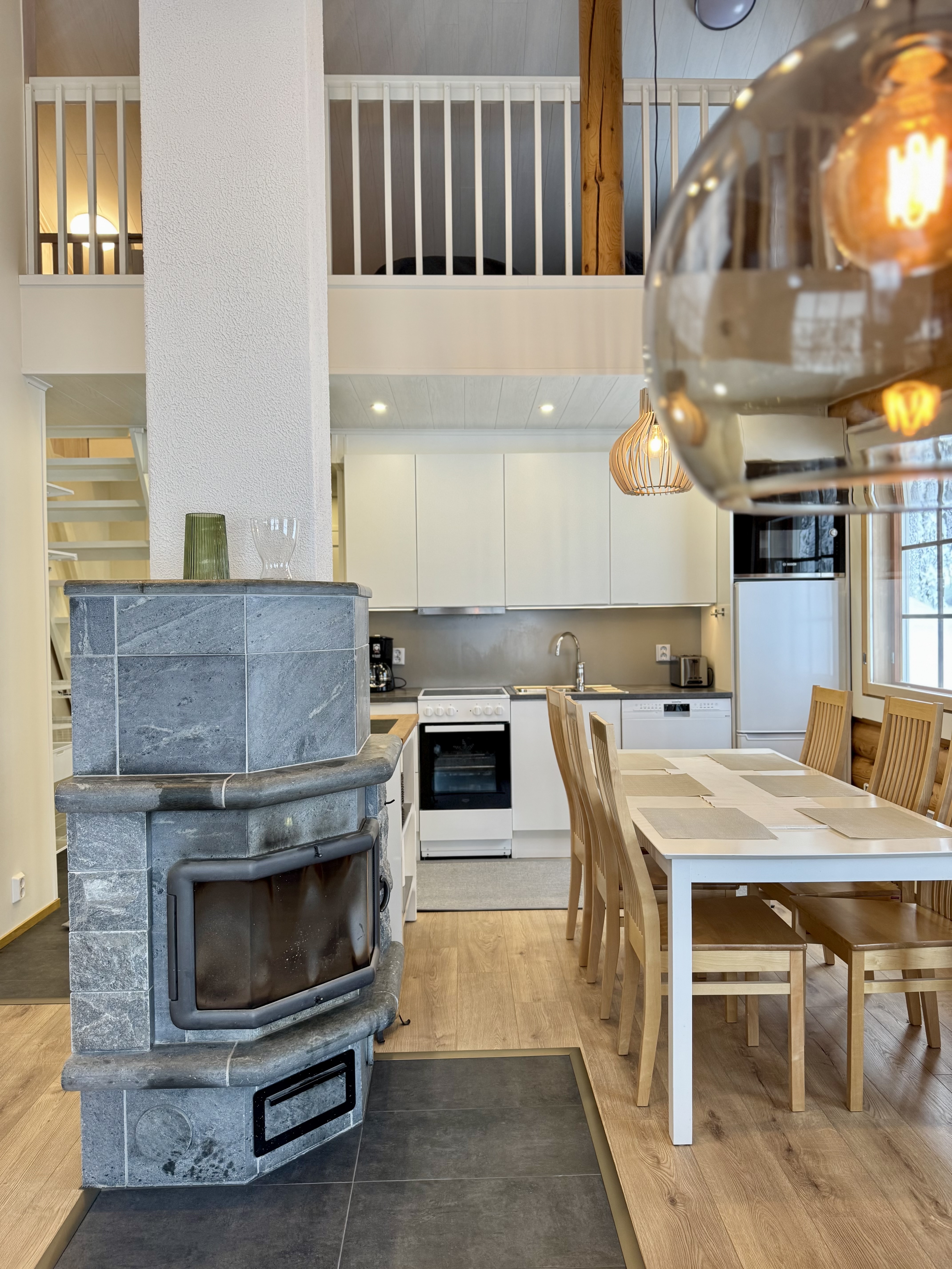 2026 uudet vinyylilattiat sekä laatoitus eteinen sekä takan edestä. Seinien levytys ja maalaus. Katto MDF - paneeli, parven kaiteiden ja portaikon maalaus, seinien valkokuulto.