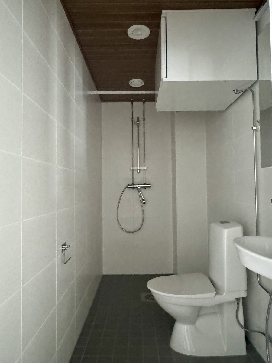 Varusteet: lattialämmitys, lattiakaivo, suihku, peilikaappi, bidee-suihku