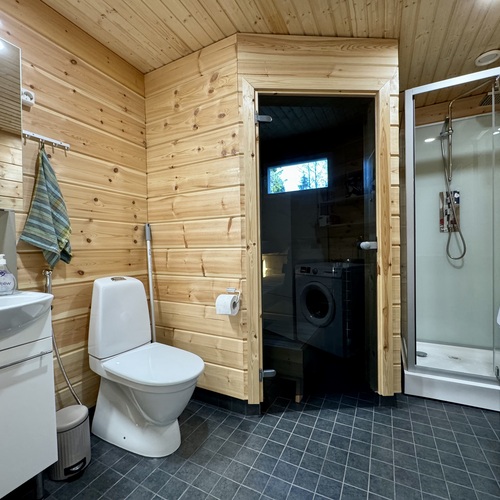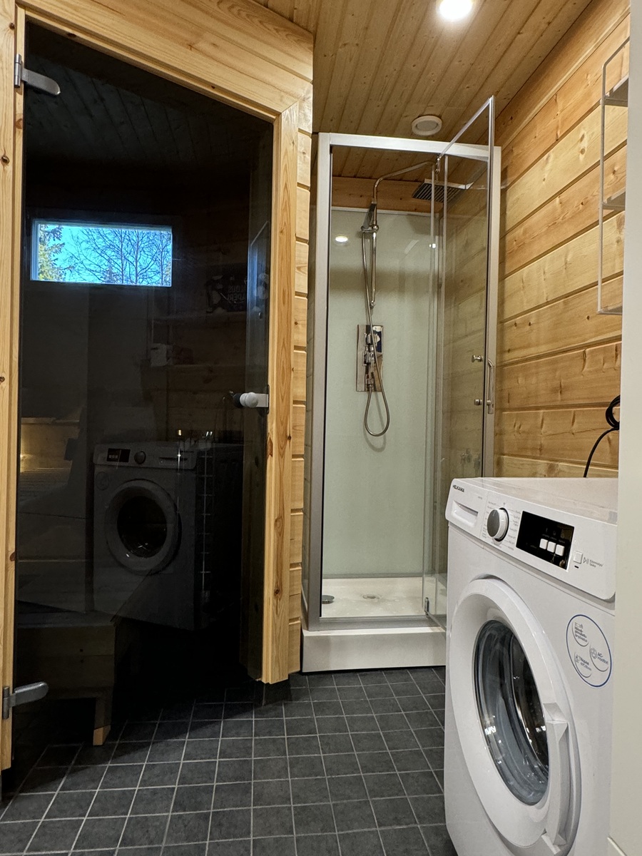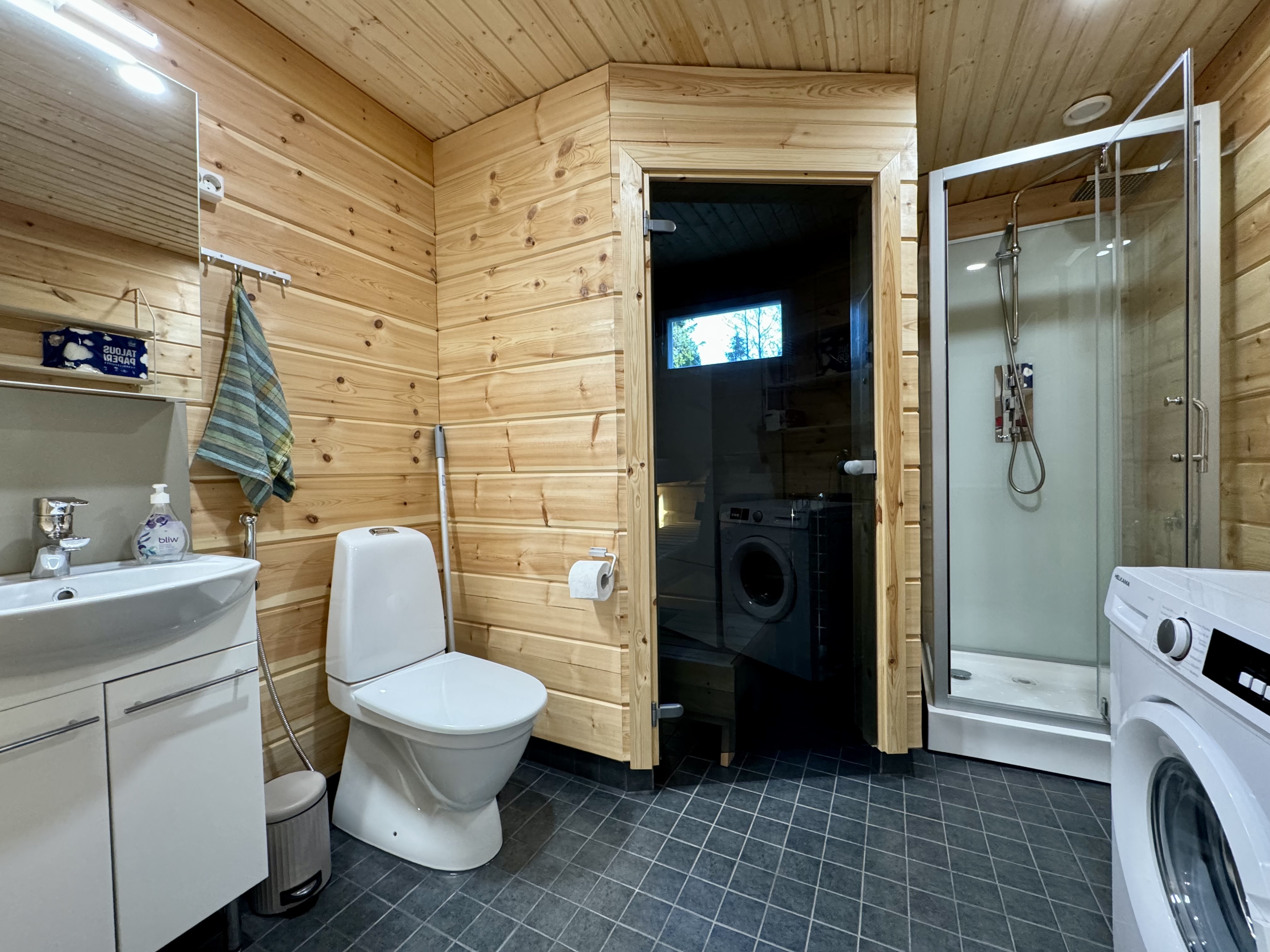 Varusteet: suihkukaappi, pesukone, wc-istuin, suihku, peilikaappi, kiinteät valaisimet, kylpyhuonekaapisto