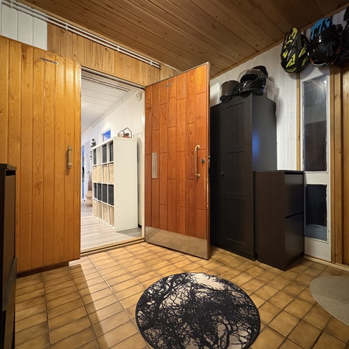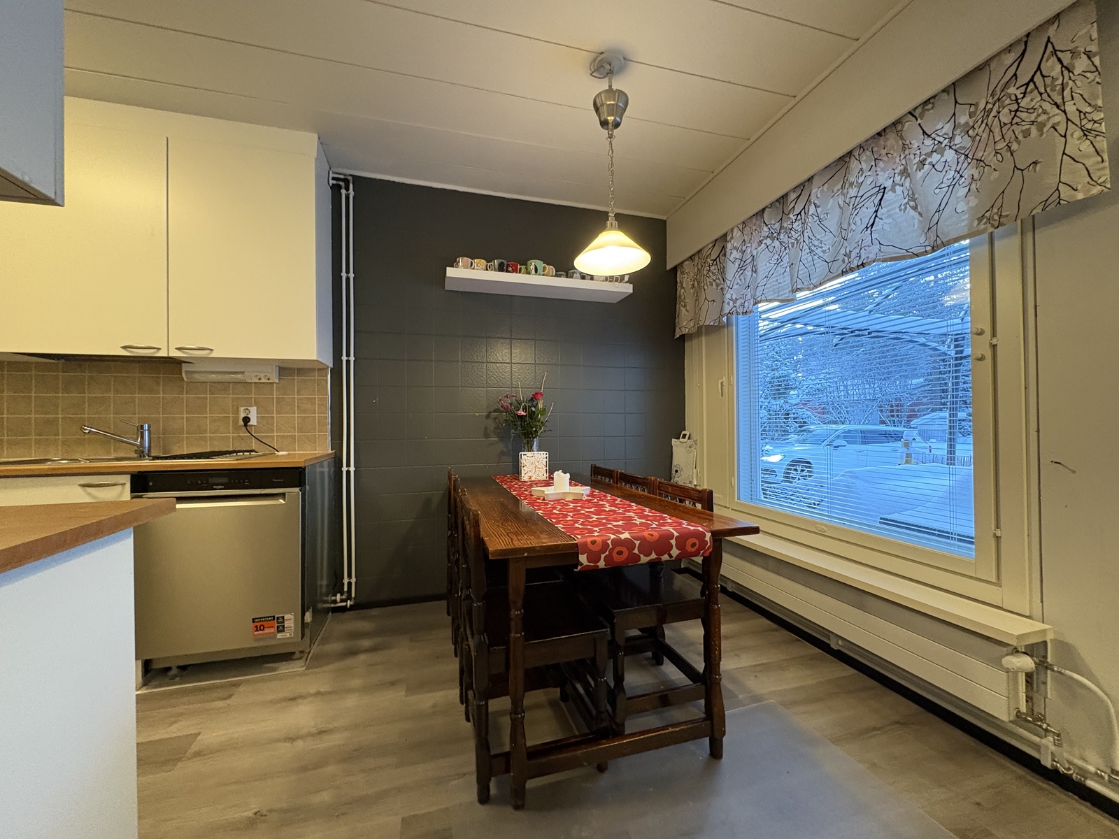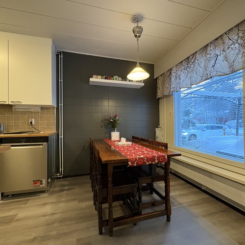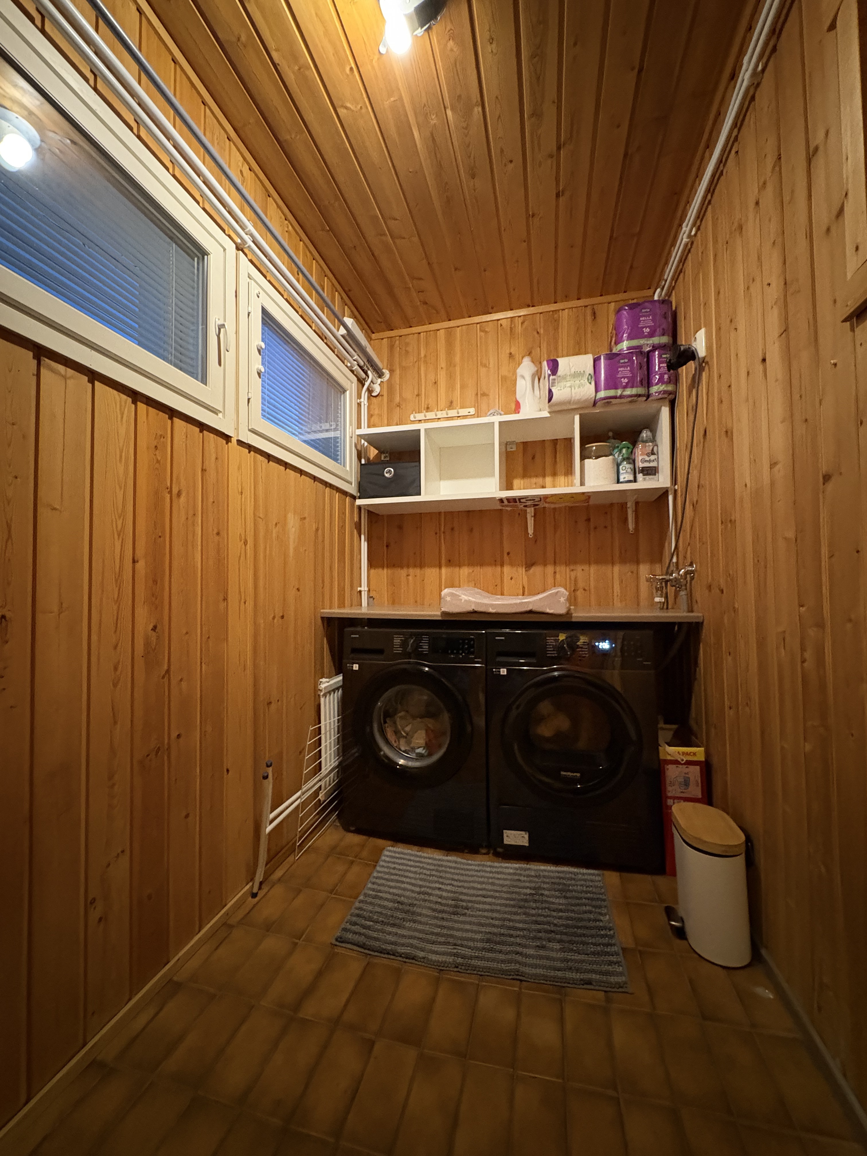 Talossa iso, valoisa olohuone, keittiö, 2 makuuhuonetta, työhuone, 2 vaatehuonetta, kylpyhuone ja sauna sekä kodinhoitohuone. Hyvät varastotilat (lämmin varasto ja kylmä varasto) sekä autokatos. Lämmitysmuotona kaukolämpö ja katolla aurinkopaneelit.