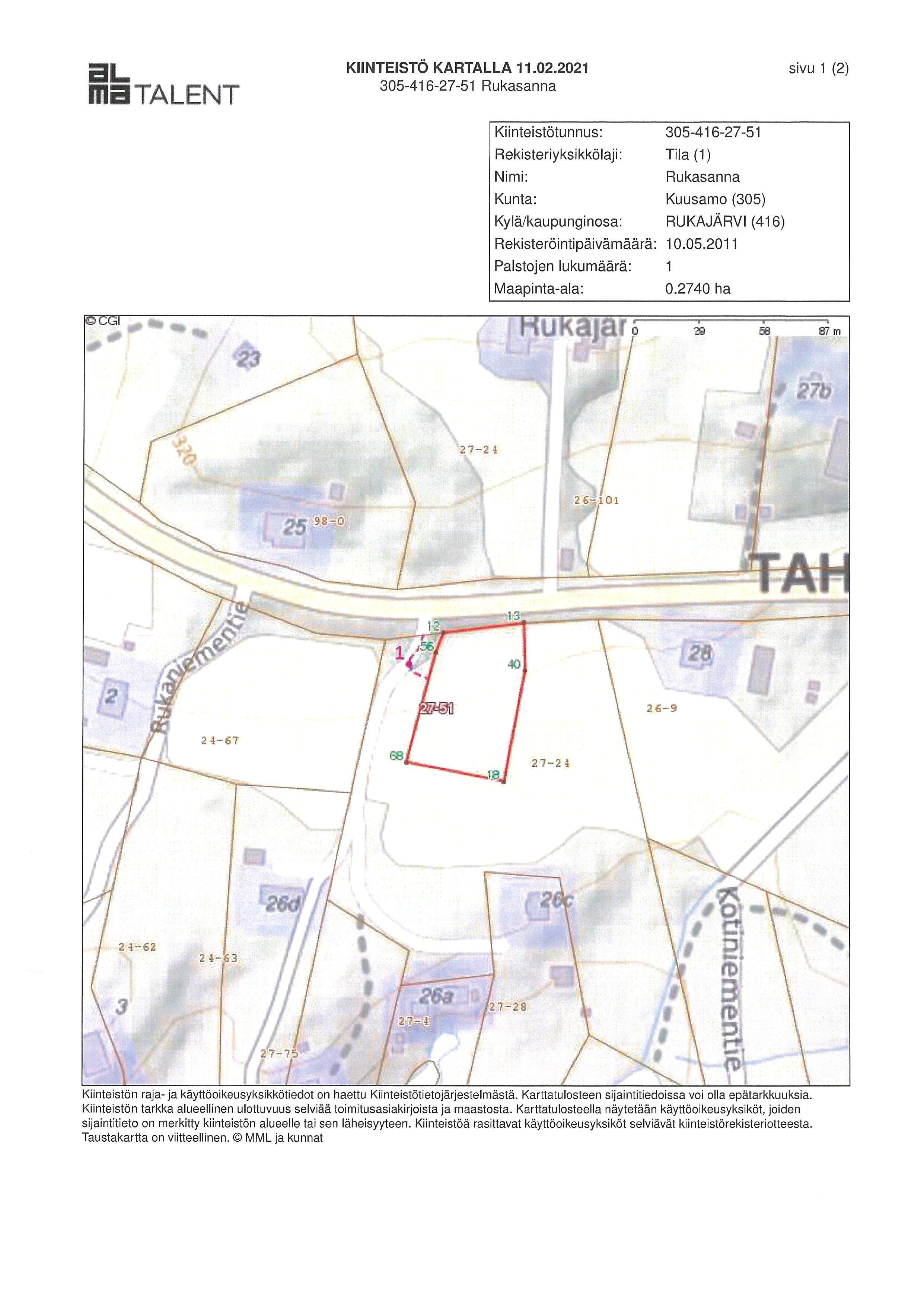 Rakennusoikeus 250 k-m². Tontin rajalla kulkee Kuusamon energia- ja vesiosuuskunnan vesi- ja viemäriverkosto, hinta määräytyy EVO:n hinnaston mukaisesti. Sähköliittymän hinta noin 2640 euroa 3 x25 A.