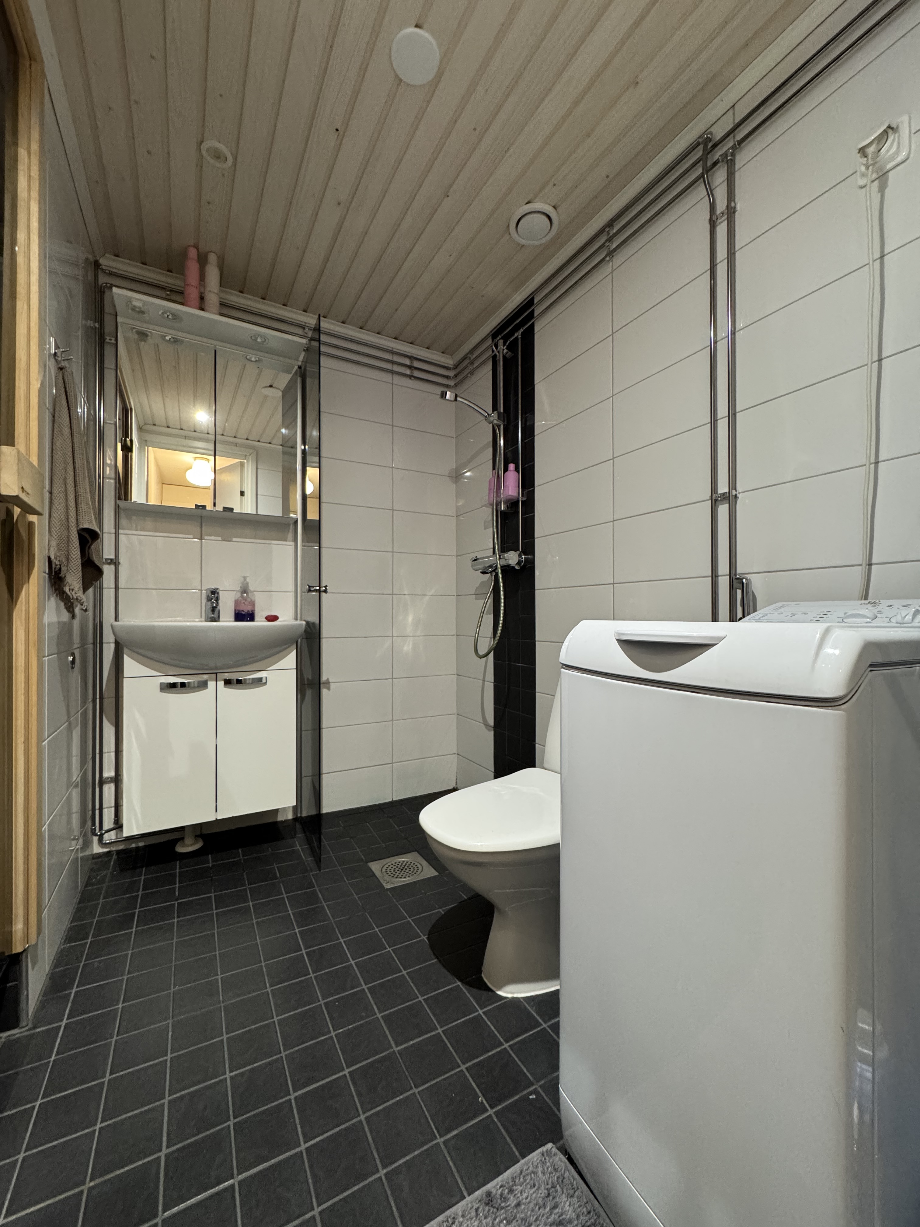 Varusteet: suihkuseinä, pesukone, lattialämmitys, wc-istuin, suihku, peilikaappi, kiinteät valaisimet, kylpyhuonekaapisto