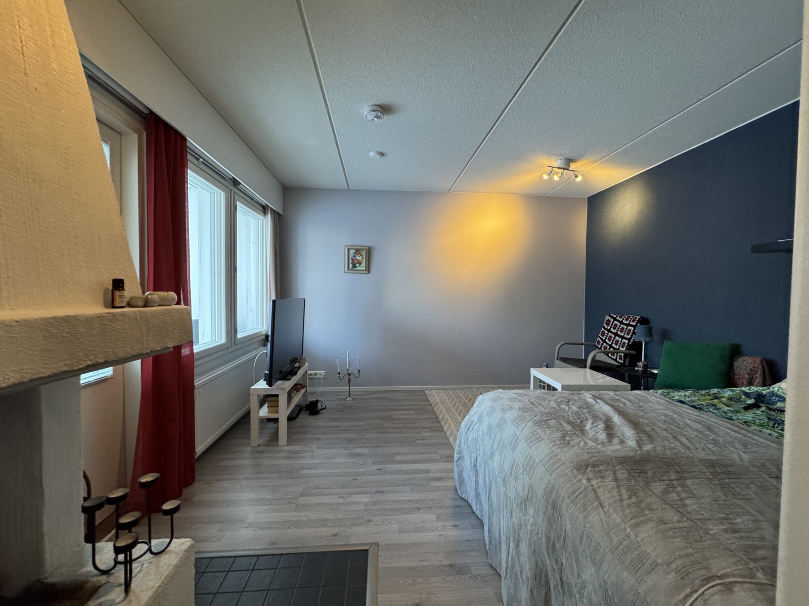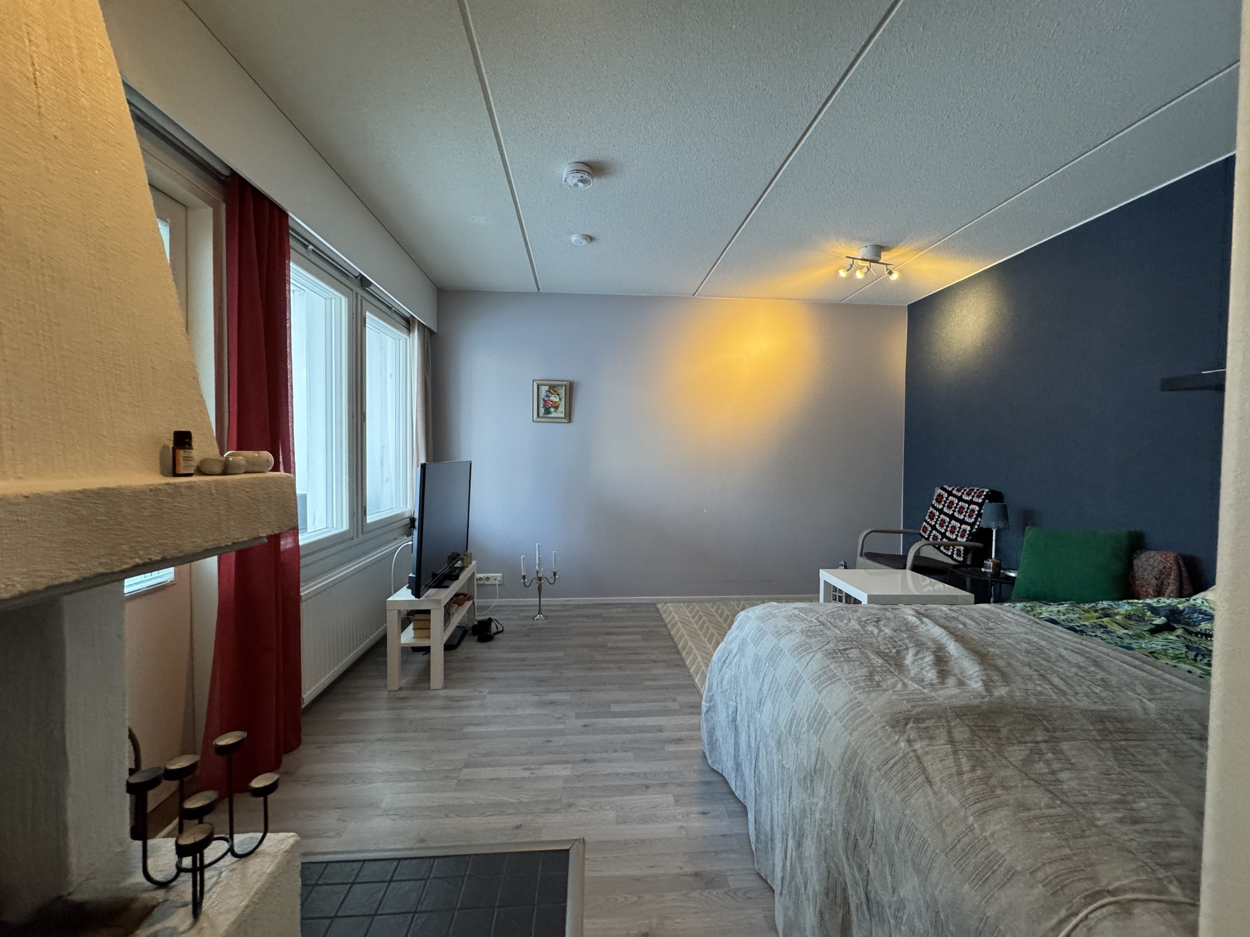 Varusteet: kaapistot, sälekaihtimet/rullaverhot, verhotangot, kiinteät valaisimet