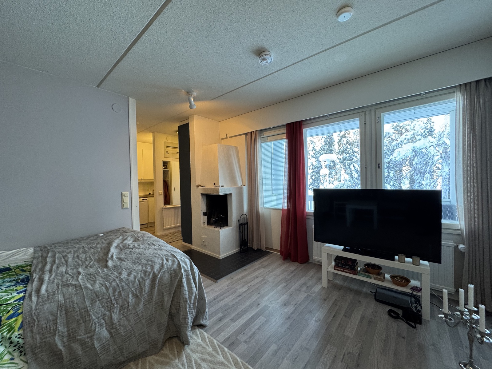 Olohuoneen ikkunoista avautuvat Rukan tunturimaisemat tykkypuineen!