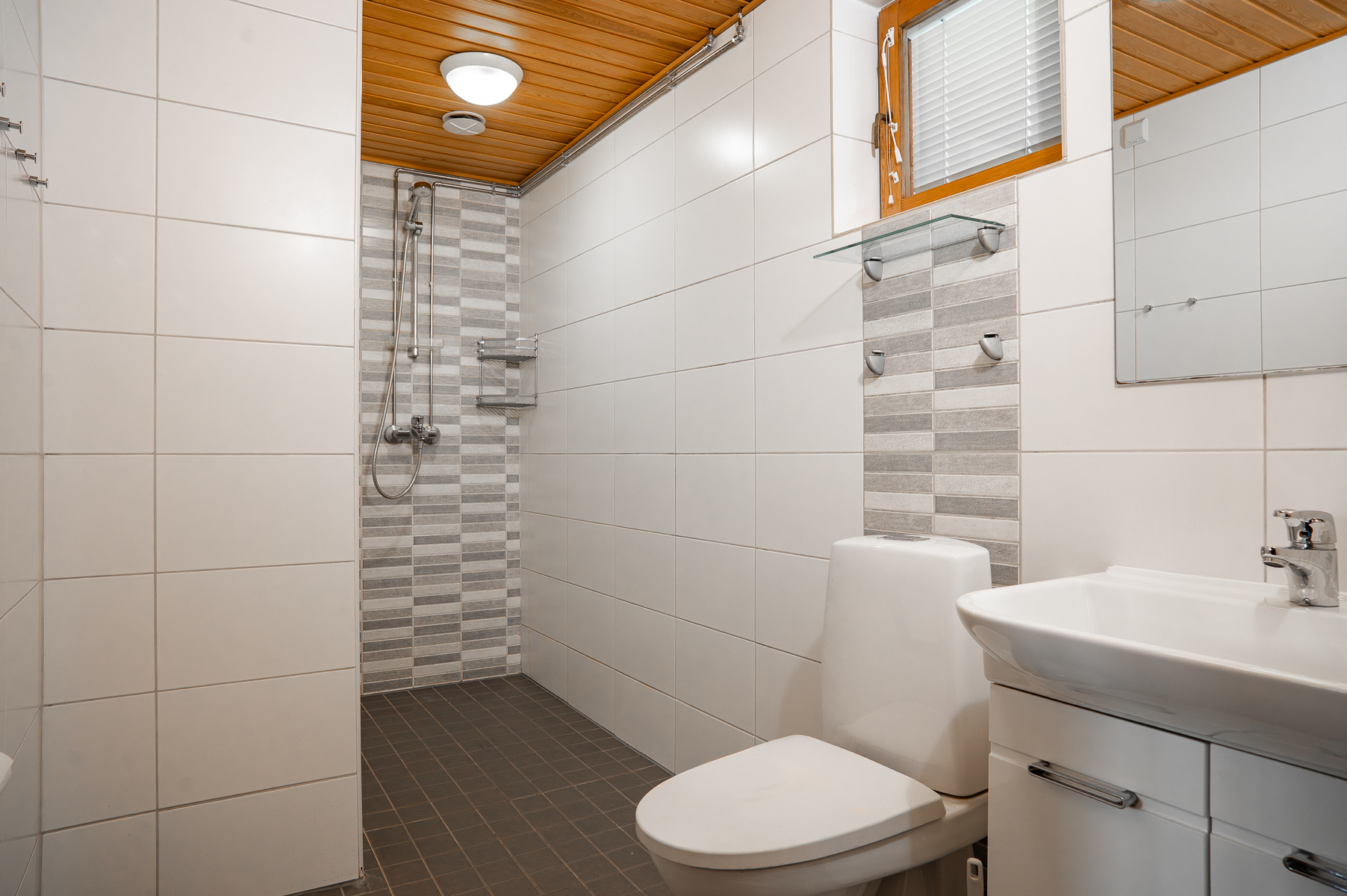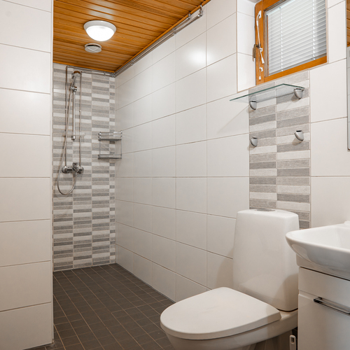 Varusteet: wc-istuin, suihku, peili, kiinteät valaisimet, kylpyhuonekaapisto